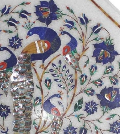 “Inlay work” is one of the most attractive art that done from marble. Same type of that adorns the Taj Mahal and other Mughal monuments. It is a closely protected traditional art and only a few expert exponents are available today. The delicate process involves cutting and engraving marble shapes manually. To start with, a predefined pattern e.g., floral design or geometrical design is engraved on the marble slab. Small pieces of marble of different shades are cut delicately to fit in these grooves precisely. These small pieces are then slipped in the grooves. There are many varieties of colored stone available for utilization in marble inlay work: malachite, cornelian, jasper, mother of pearl, abalone shell, lapis lazuli, agnate, coral, turquoise and tiger eye to name just a few. The grooves are filled with their precisely corresponding shapes of colored stone and secured in place with a white putty made from oil, and wax. Once the design is completely dry, the piece is polished with a mixture of sand, water and emery paper to give a shiny smooth finish. Apart from marble, many other materials can also be used.
