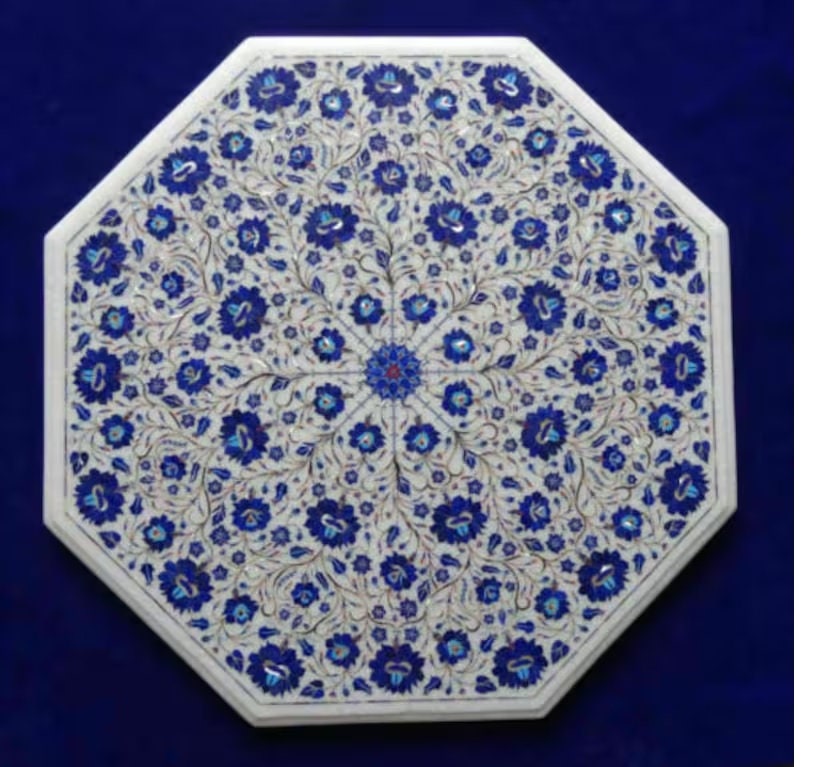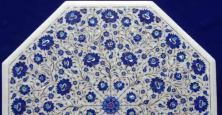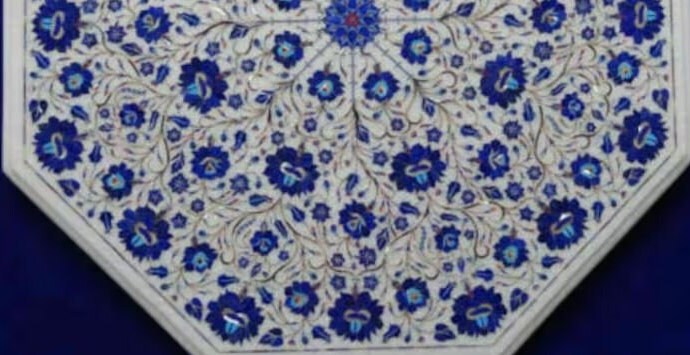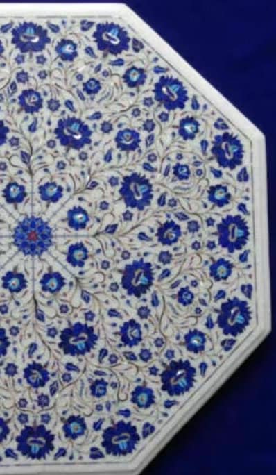 “Inlay work” is one of the most attractive art that done from marble. Same type of that adorns the Taj Mahal and other Mughal monuments. It is a closely protected traditional art and only a few expert exponents are available today. The delicate process involves cutting and engraving marble shapes manually. To start with, a predefined pattern e.g., floral design or geometrical design is engraved on the marble slab. Small pieces of marble of different shades are cut delicately to fit in these grooves precisely. These small pieces are then slipped in the grooves. There are many varieties of colored stone available for utilization in marble inlay work: malachite, cornelian, jasper, mother of pearl, abalone shell, lapis lazuli, agnate, coral, turquoise and tiger eye to name just a few. The grooves are filled with their precisely corresponding shapes of colored stone and secured in place with a white putty made from oil, and wax. Once the design is completely dry, the piece is polished with a mixture of sand, water and emery paper to give a shiny smooth finish. Apart from marble, many other materials can also be used.