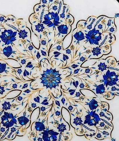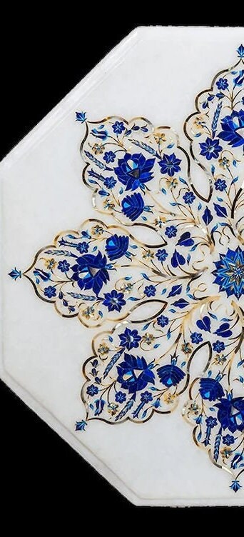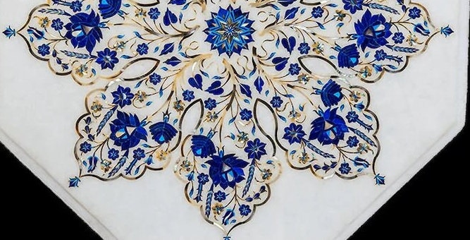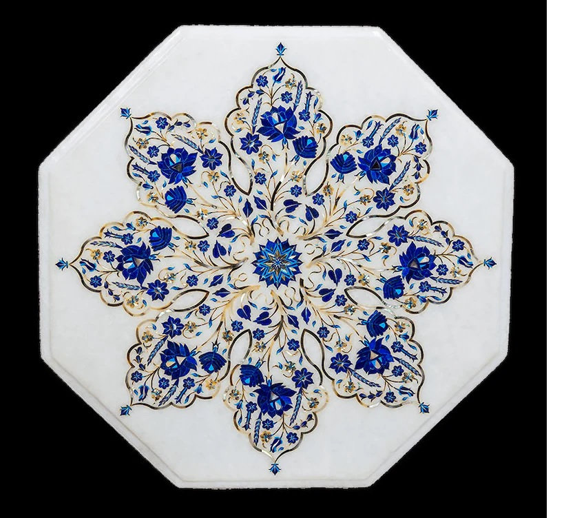 “Inlay work” is one of the most attractive art that done from marble. Same type of that adorns the Taj Mahal and other Mughal monuments. It is a closely protected traditional art and only a few expert exponents are available today. The delicate process involves cutting and engraving marble shapes manually. To start with, a predefined pattern e.g., floral design or geometrical design is engraved on the marble slab. Small pieces of marble of different shades are cut delicately to fit in these grooves precisely. These small pieces are then slipped in the grooves. There are many varieties of colored stone available for utilization in marble inlay work: malachite, cornelian, jasper, mother of pearl, abalone shell, lapis lazuli, agnate, coral, turquoise and tiger eye to name just a few. The grooves are filled with their precisely corresponding shapes of colored stone and secured in place with a white putty made from oil, and wax. Once the design is completely dry, the piece is polished with a mixture of sand, water and emery paper to give a shiny smooth finish. Apart from marble, many other materials can also be used.