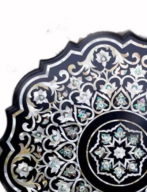 Black Marble Dining Table Top with Semi Precious Stone Inlay Work Handmade Patio Table for Home and Living Decor