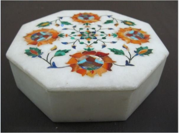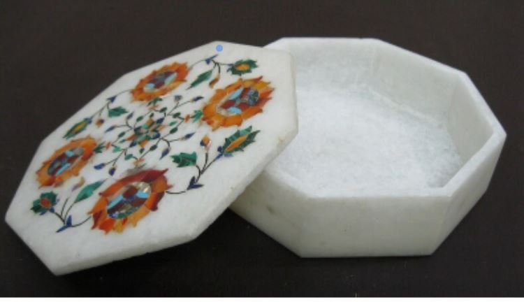 6 x 6 Inches White Marble Octagon Shape Trinket Box Semi Precious Stone Inlay Work Multiuse Box for Sisters Weeding