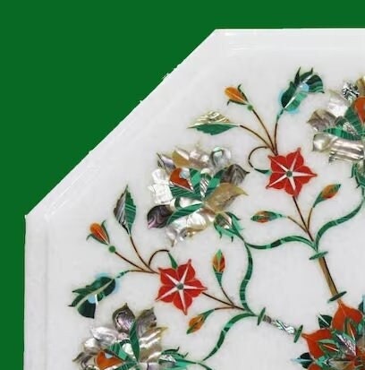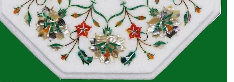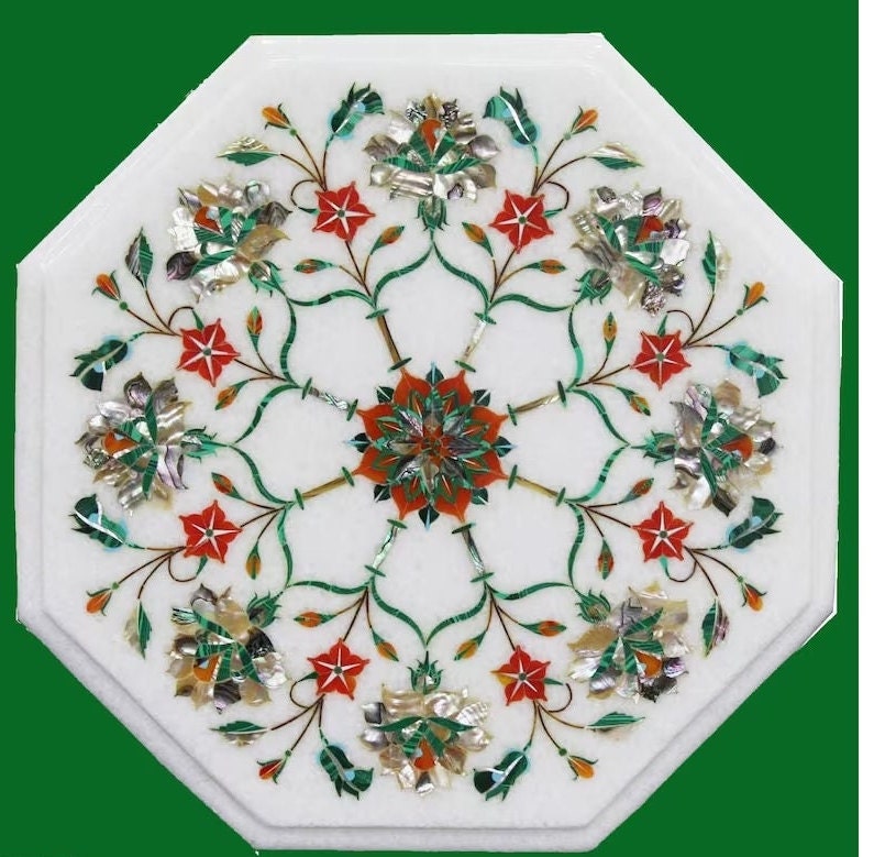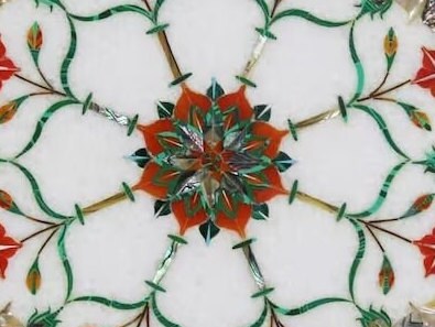 “Inlay work” is one of the most attractive art that done from marble. Same type of that adorns the Taj Mahal and other Mughal monuments. It is a closely protected traditional art and only a few expert exponents are available today. The delicate process involves cutting and engraving marble shapes manually. To start with, a predefined pattern e.g., floral design or geometrical design is engraved on the marble slab. Small pieces of marble of different shades are cut delicately to fit in these grooves precisely. These small pieces are then slipped in the grooves. There are many varieties of colored stone available for utilization in marble inlay work: malachite, cornelian, jasper, mother of pearl, abalone shell, lapis lazuli, agnate, coral, turquoise and tiger eye to name just a few. The grooves are filled with their precisely corresponding shapes of colored stone and secured in place with a white putty made from oil, and wax. Once the design is completely dry, the piece is polished with a mixture of sand, water and emery paper to give a shiny smooth finish. Apart from marble, many other materials can also be used.