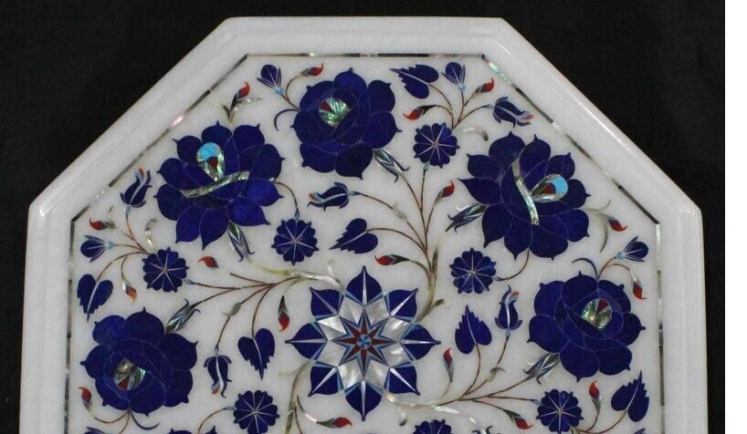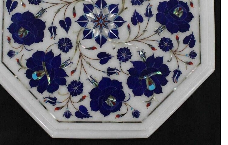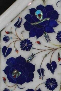 “Inlay work” is one of the most attractive art that done from marble. Same type of that adorns the Taj Mahal and other Mughal monuments. It is a closely protected traditional art and only a few expert exponents are available today. The delicate process involves cutting and engraving marble shapes manually. To start with, a predefined pattern e.g., floral design or geometrical design is engraved on the marble slab. Small pieces of marble of different shades are cut delicately to fit in these grooves precisely. These small pieces are then slipped in the grooves. There are many varieties of colored stone available for utilization in marble inlay work: malachite, cornelian, jasper, mother of pearl, abalone shell, lapis lazuli, agnate, coral, turquoise and tiger eye to name just a few. The grooves are filled with their precisely corresponding shapes of colored stone and secured in place with a white putty made from oil, and wax. Once the design is completely dry, the piece is polished with a mixture of sand, water and emery paper to give a shiny smooth finish. Apart from marble, many other materials can also be used.