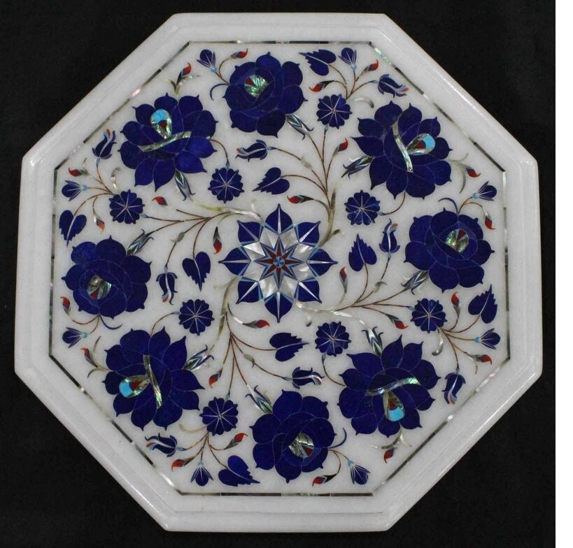 Marble Coffee Table Top Handmade Semi Precious Stone Lapis Lazuli Inlay Pietra Dura Work Art Deco Home Furniture