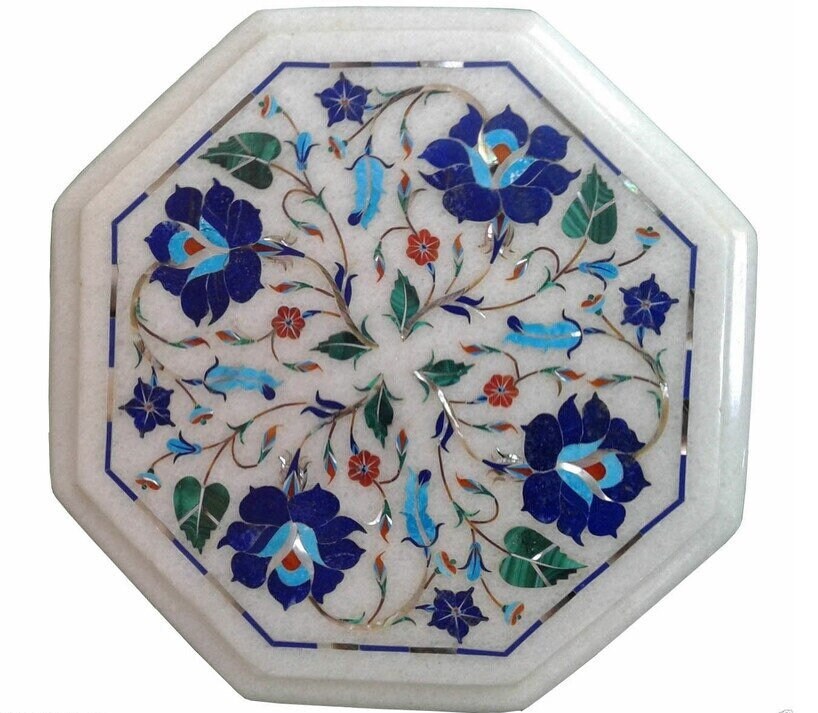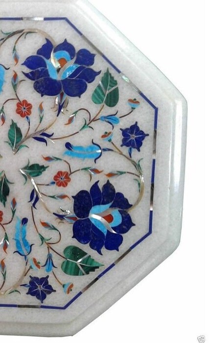 “Inlay work” is one of the most attractive art that done from marble. Same type of that adorns the Taj Mahal and other Mughal monuments. It is a closely protected traditional art and only a few expert exponents are available today. The delicate process involves cutting and engraving marble shapes manually. To start with, a predefined pattern e.g., floral design or geometrical design is engraved on the marble slab. Small pieces of marble of different shades are cut delicately to fit in these grooves precisely. These small pieces are then slipped in the grooves. There are many varieties of colored stone available for utilization in marble inlay work: malachite, cornelian, jasper, mother of pearl, abalone shell, lapis lazuli, agnate, coral, turquoise and tiger eye to name just a few. The grooves are filled with their precisely corresponding shapes of colored stone and secured in place with a white putty made from oil, and wax. Once the design is completely dry, the piece is polished with a mixture of sand, water and emery paper to give a shiny smooth finish. Apart from marble, many other materials can also be used.