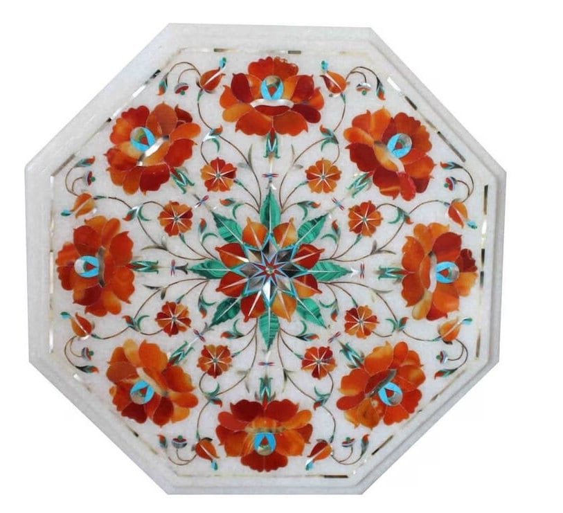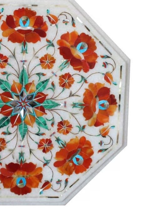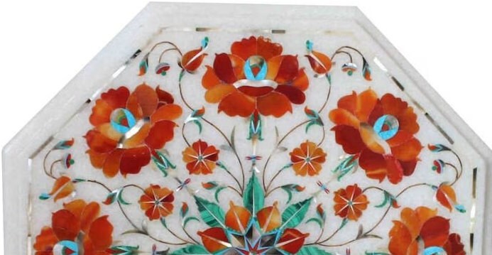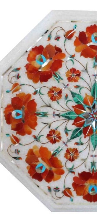 “Inlay work” is one of the most attractive art that done from marble. Same type of that adorns the Taj Mahal and other Mughal monuments. It is a closely protected traditional art and only a few expert exponents are available today. The delicate process involves cutting and engraving marble shapes manually. To start with, a predefined pattern e.g., floral design or geometrical design is engraved on the marble slab. Small pieces of marble of different shades are cut delicately to fit in these grooves precisely. These small pieces are then slipped in the grooves. There are many varieties of colored stone available for utilization in marble inlay work: malachite, cornelian, jasper, mother of pearl, abalone shell, lapis lazuli, agnate, coral, turquoise and tiger eye to name just a few. The grooves are filled with their precisely corresponding shapes of colored stone and secured in place with a white putty made from oil, and wax. Once the design is completely dry, the piece is polished with a mixture of sand, water and emery paper to give a shiny smooth finish. Apart from marble, many other materials can also be used.