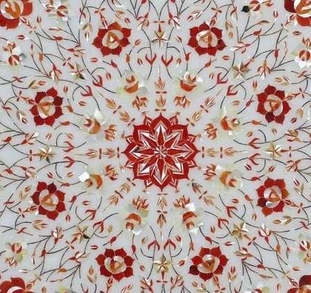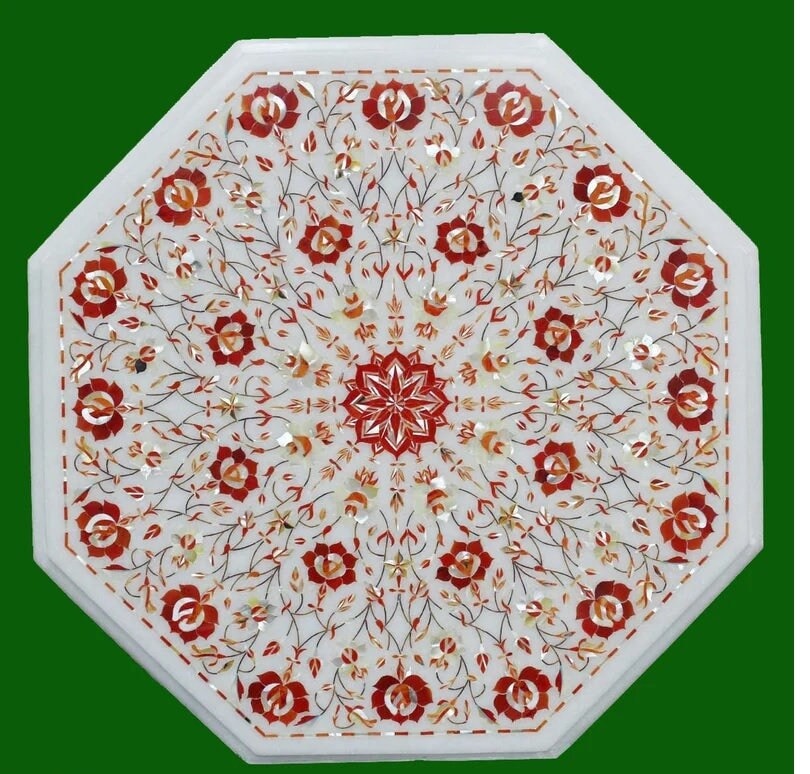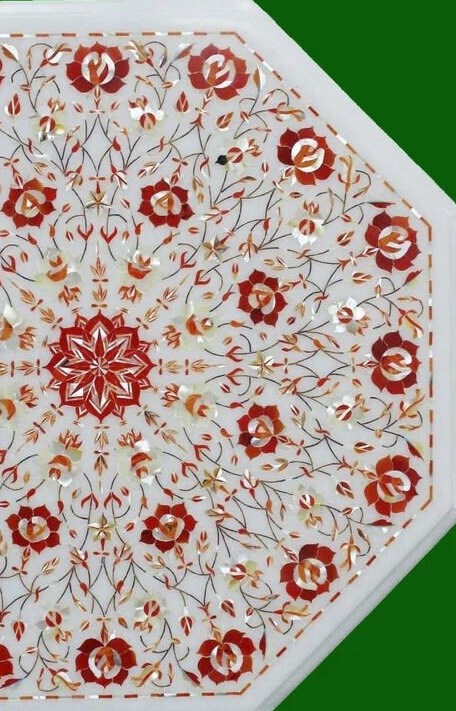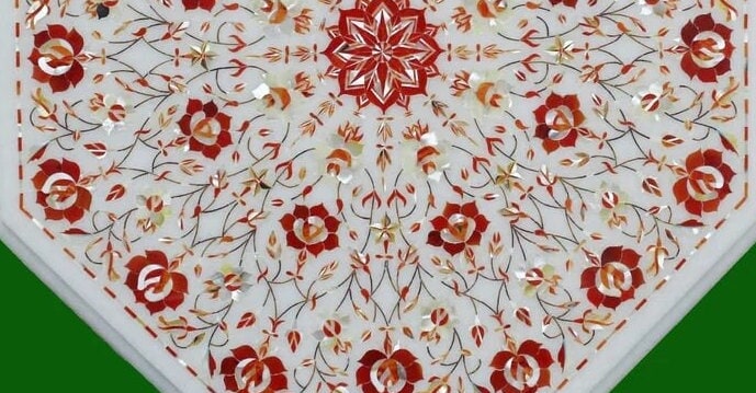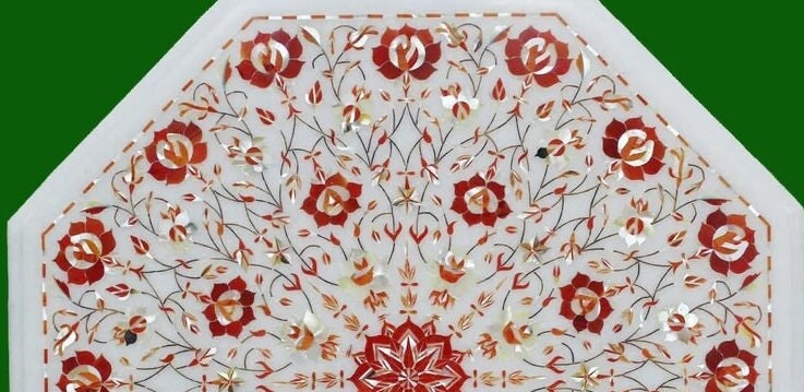 “Inlay work” is one of the most attractive art that done from marble. Same type of that adorns the Taj Mahal and other Mughal monuments. It is a closely protected traditional art and only a few expert exponents are available today. The delicate process involves cutting and engraving marble shapes manually. To start with, a predefined pattern e.g., floral design or geometrical design is engraved on the marble slab. Small pieces of marble of different shades are cut delicately to fit in these grooves precisely. These small pieces are then slipped in the grooves. There are many varieties of colored stone available for utilization in marble inlay work: malachite, cornelian, jasper, mother of pearl, abalone shell, lapis lazuli, agnate, coral, turquoise and tiger eye to name just a few. The grooves are filled with their precisely corresponding shapes of colored stone and secured in place with a white putty made from oil, and wax. Once the design is completely dry, the piece is polished with a mixture of sand, water and emery paper to give a shiny smooth finish. Apart from marble, many other materials can also be used.