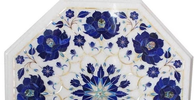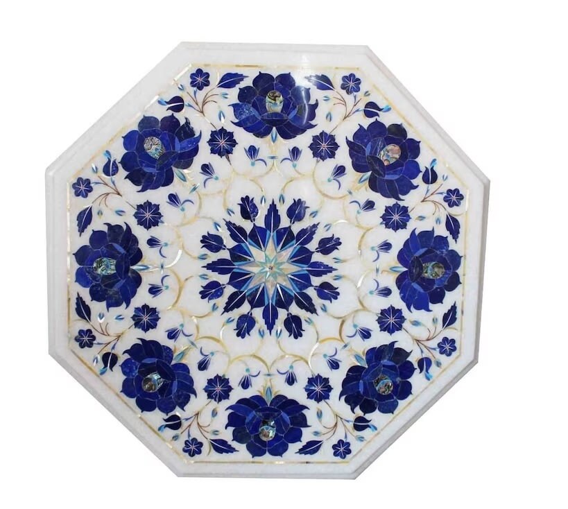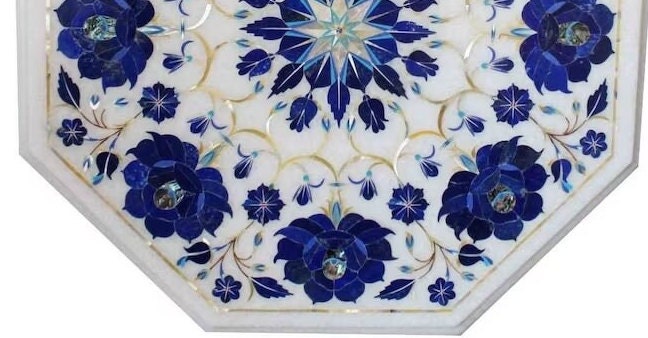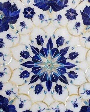 “Inlay work” is one of the most attractive art that done from marble. Same type of that adorns the Taj Mahal and other Mughal monuments. It is a closely protected traditional art and only a few expert exponents are available today. The delicate process involves cutting and engraving marble shapes manually. To start with, a predefined pattern e.g., floral design or geometrical design is engraved on the marble slab. Small pieces of marble of different shades are cut delicately to fit in these grooves precisely. These small pieces are then slipped in the grooves. There are many varieties of colored stone available for utilization in marble inlay work: malachite, cornelian, jasper, mother of pearl, abalone shell, lapis lazuli, agnate, coral, turquoise and tiger eye to name just a few. The grooves are filled with their precisely corresponding shapes of colored stone and secured in place with a white putty made from oil, and wax. Once the design is completely dry, the piece is polished with a mixture of sand, water and emery paper to give a shiny smooth finish. Apart from marble, many other materials can also be used.