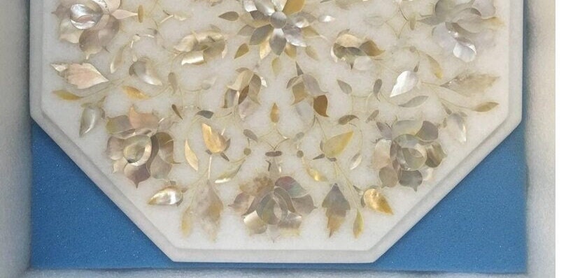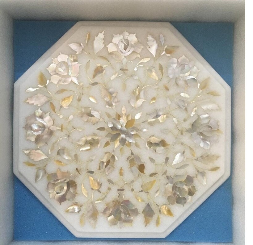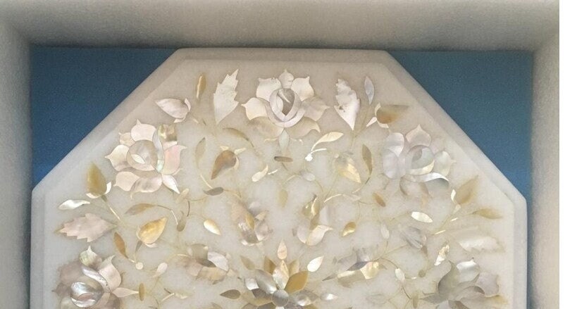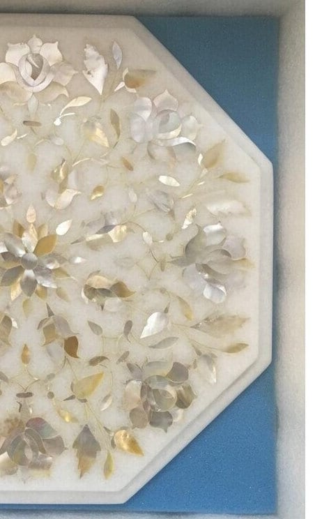 “Inlay work” is one of the most attractive art that done from marble. Same type of that adorns the Taj Mahal and other Mughal monuments. It is a closely protected traditional art and only a few expert exponents are available today. The delicate process involves cutting and engraving marble shapes manually. To start with, a predefined pattern e.g., floral design or geometrical design is engraved on the marble slab. Small pieces of marble of different shades are cut delicately to fit in these grooves precisely. These small pieces are then slipped in the grooves. There are many varieties of colored stone available for utilization in marble inlay work: malachite, cornelian, jasper, mother of pearl, abalone shell, lapis lazuli, agnate, coral, turquoise and tiger eye to name just a few. The grooves are filled with their precisely corresponding shapes of colored stone and secured in place with a white putty made from oil, and wax. Once the design is completely dry, the piece is polished with a mixture of sand, water and emery paper to give a shiny smooth finish. Apart from marble, many other materials can also be used.