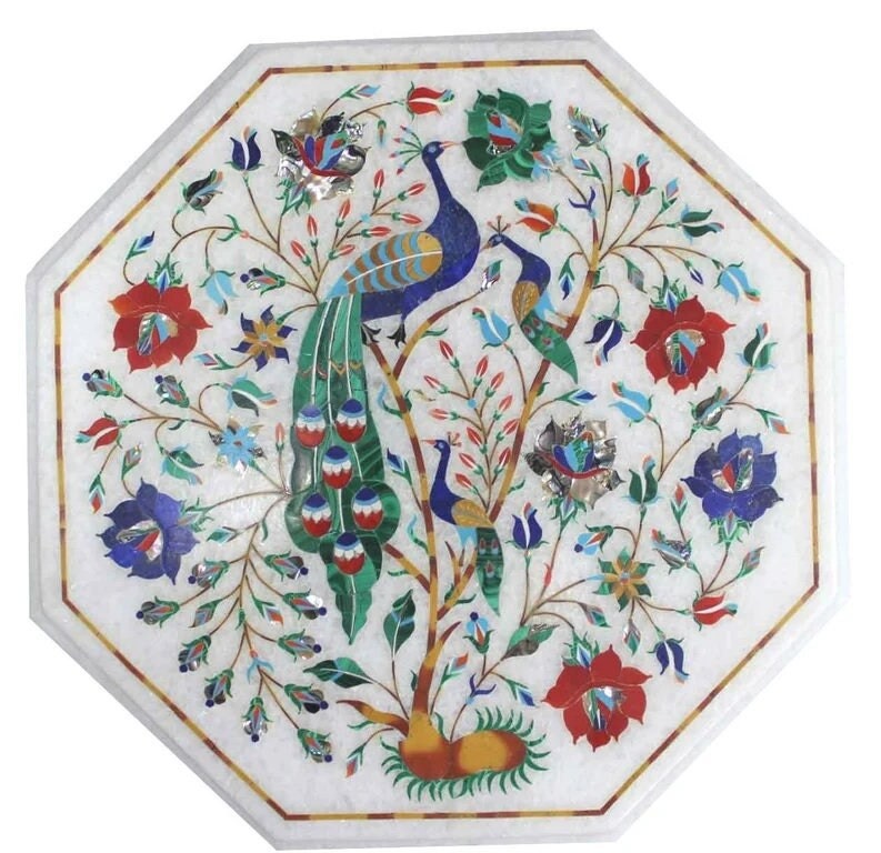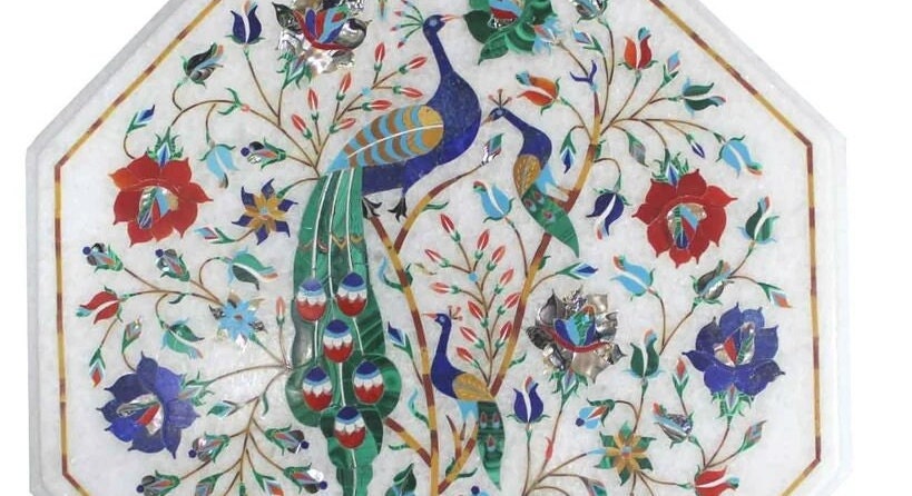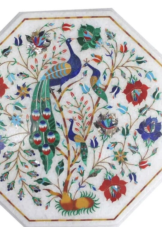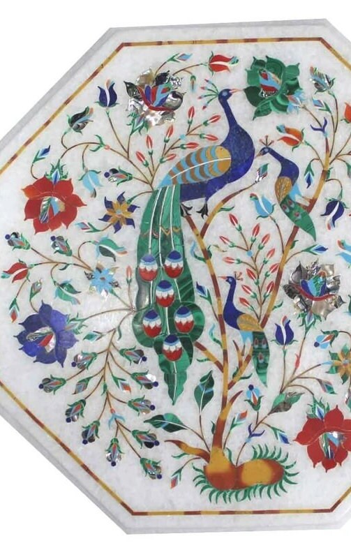 “Inlay work” is one of the most attractive art that done from marble. Same type of that adorns the Taj Mahal and other Mughal monuments. It is a closely protected traditional art and only a few expert exponents are available today. The delicate process involves cutting and engraving marble shapes manually. To start with, a predefined pattern e.g., floral design or geometrical design is engraved on the marble slab. Small pieces of marble of different shades are cut delicately to fit in these grooves precisely. These small pieces are then slipped in the grooves. There are many varieties of colored stone available for utilization in marble inlay work: malachite, cornelian, jasper, mother of pearl, abalone shell, lapis lazuli, agnate, coral, turquoise and tiger eye to name just a few. The grooves are filled with their precisely corresponding shapes of colored stone and secured in place with a white putty made from oil, and wax. Once the design is completely dry, the piece is polished with a mixture of sand, water and emery paper to give a shiny smooth finish. Apart from marble, many other materials can also be used.