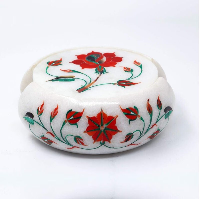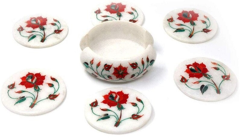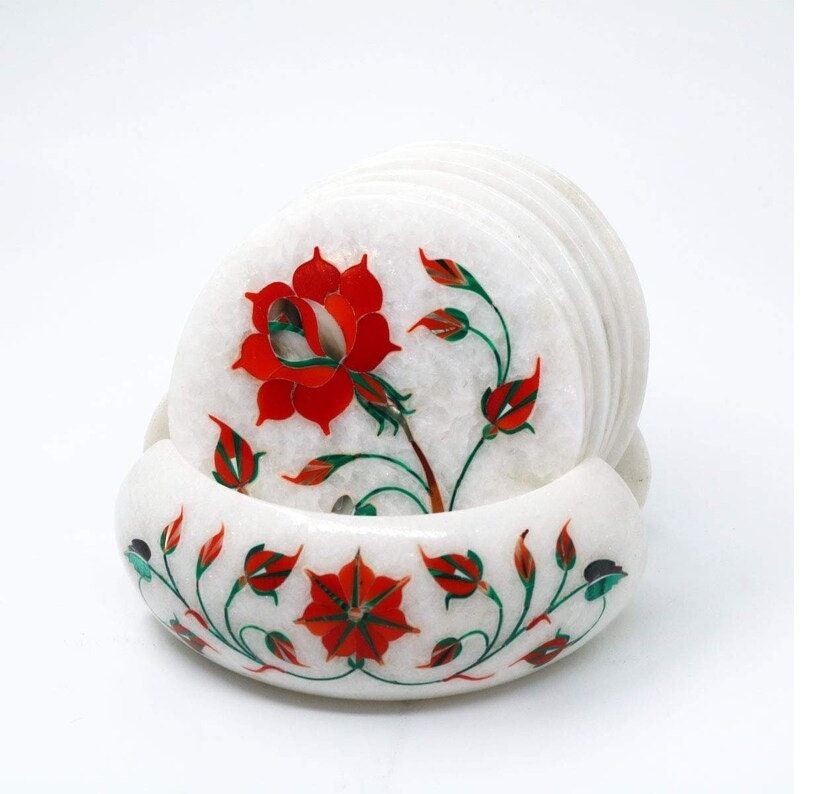 This elegant marble inlay coaster set with a matching holder showcases a beautiful floral design created using the traditional Pietra Dura stone inlay technique. Each coaster is carefully handcrafted from natural white marble and decorated with vibrant floral motifs made from semi-precious stones.