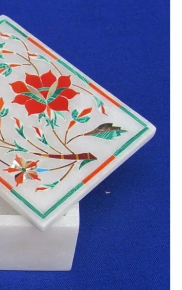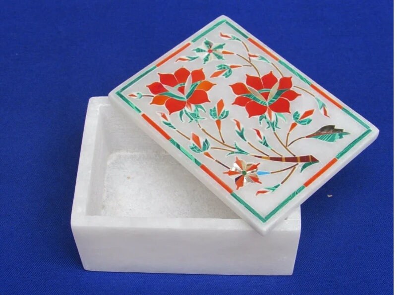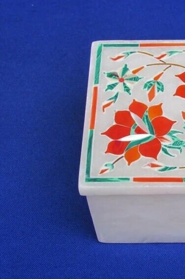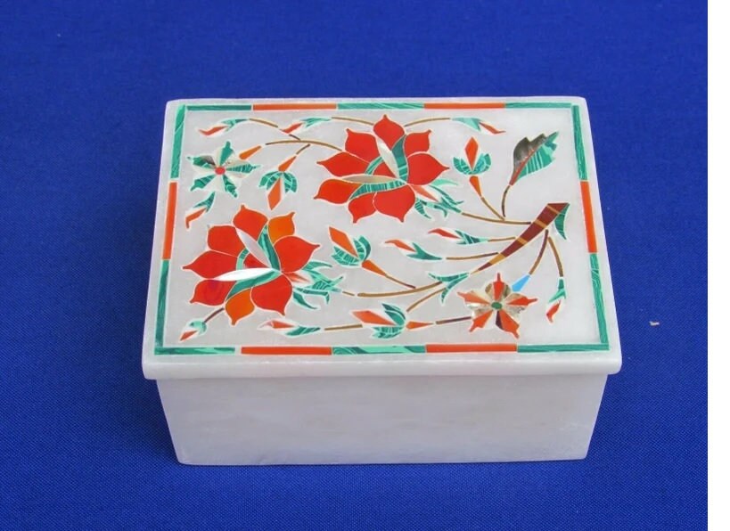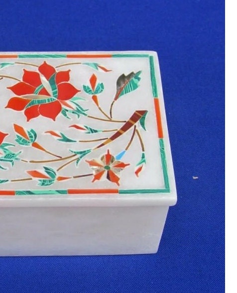 Marble Jewelry Box Multi Color Semi Precious Stone Pietra Dura Art Handmade Decor Gift