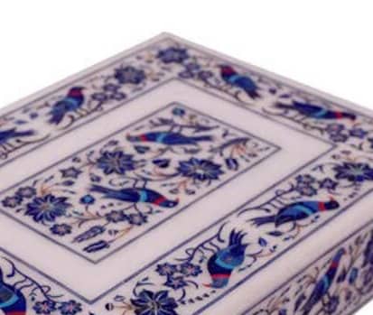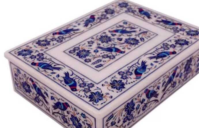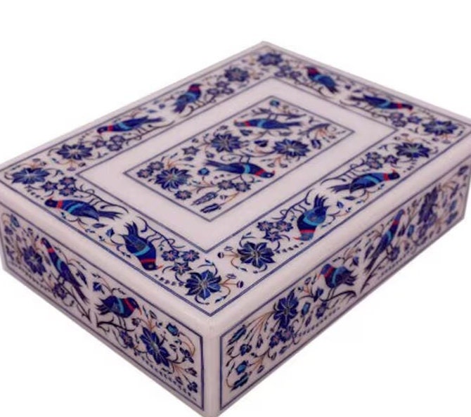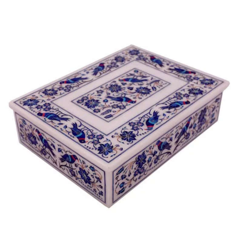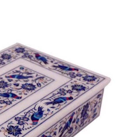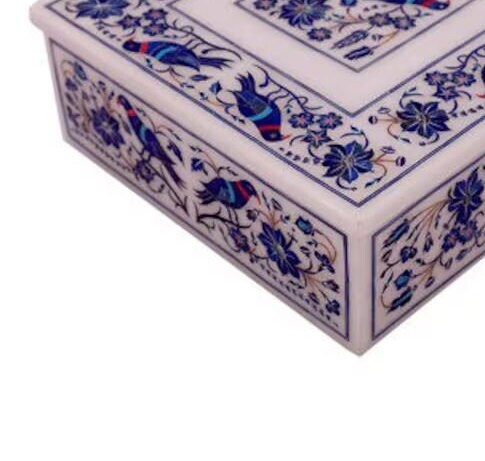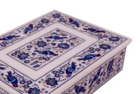 White Marble Jewelry Box Handmade Lapis Floral Inlay Marquetry Works Gifts