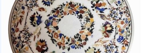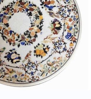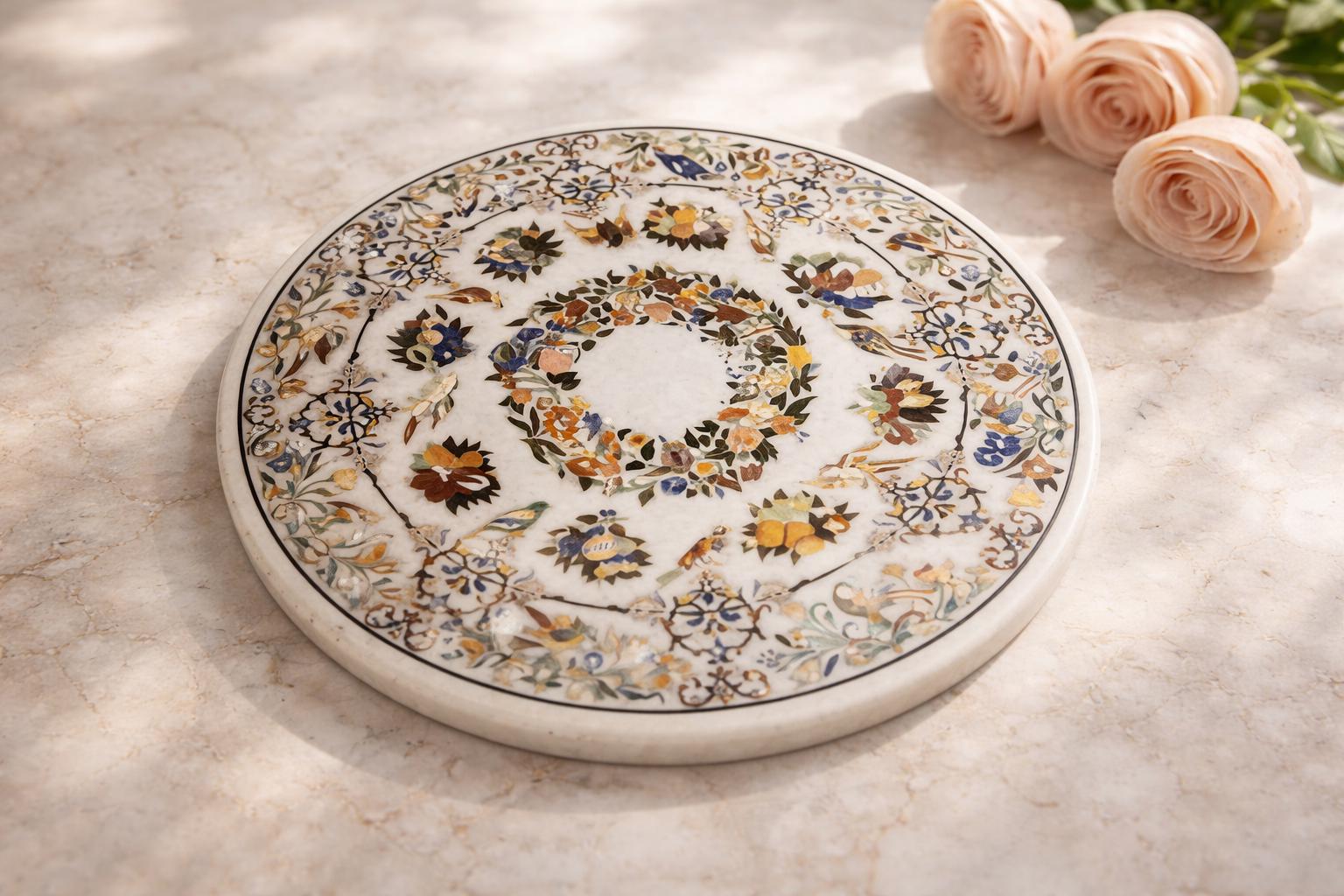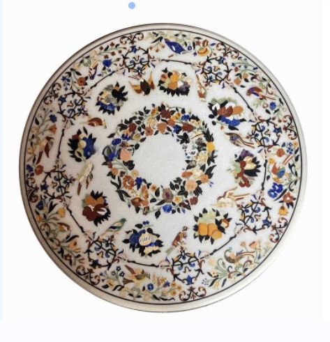 Handmade White Marble Table Top with Semiprecious Stone Inlay