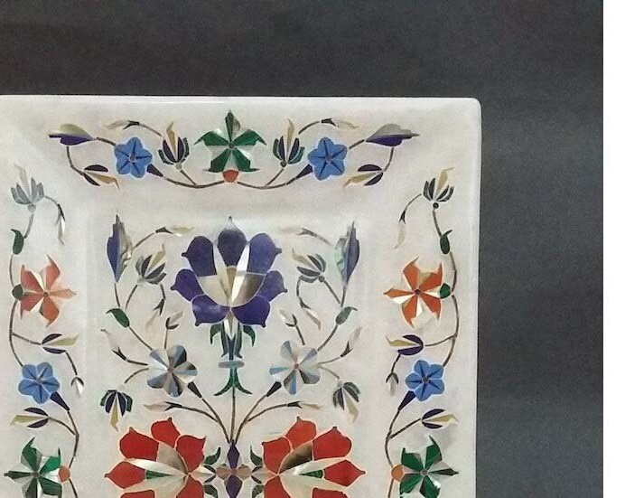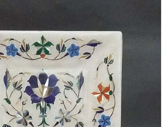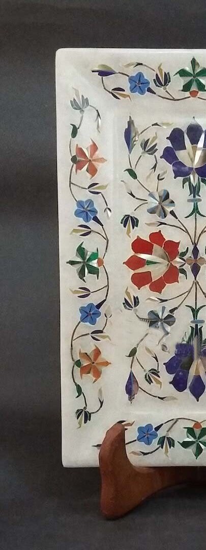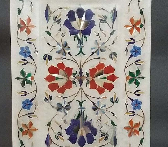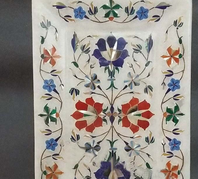 “Inlay work” is one of the most attractive art that done from marble. Same type of that adorns the Taj Mahal and other Mughal monuments. It is a closely protected traditional art and only a few expert exponents are available today. The delicate process involves cutting and engraving marble shapes manually. To start with, a predefined pattern e.g., floral design or geometrical design is engraved on the marble slab. Small pieces of marble of different shades are cut delicately to fit in these grooves precisely. These small pieces are then slipped in the grooves. There are many varieties of colored stone available for utilization in marble inlay work: malachite, cornelian, jasper, mother of pearl, abalone shell, lapis lazuli, agnate, coral, turquoise and tiger eye to name just a few. The grooves are filled with their precisely corresponding shapes of colored stone and secured in place with a white putty made from oil, and wax. Once the design is completely dry, the piece is polished with a mixture of sand, water and emery paper to give a shiny smooth finish. Apart from marble, many other materials can also be used.