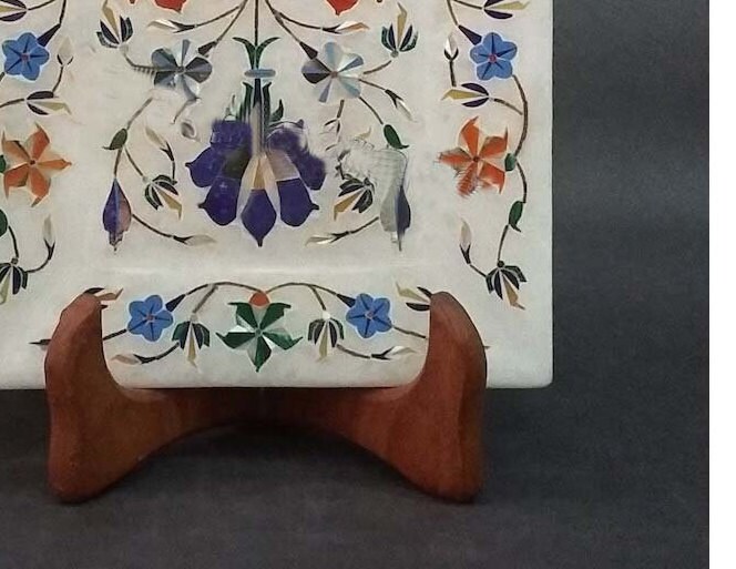 • A beautiful and elegant Marble Plate Inlaid with semi precious gemstones to give a beautiful flower design resting on a wooden stand.