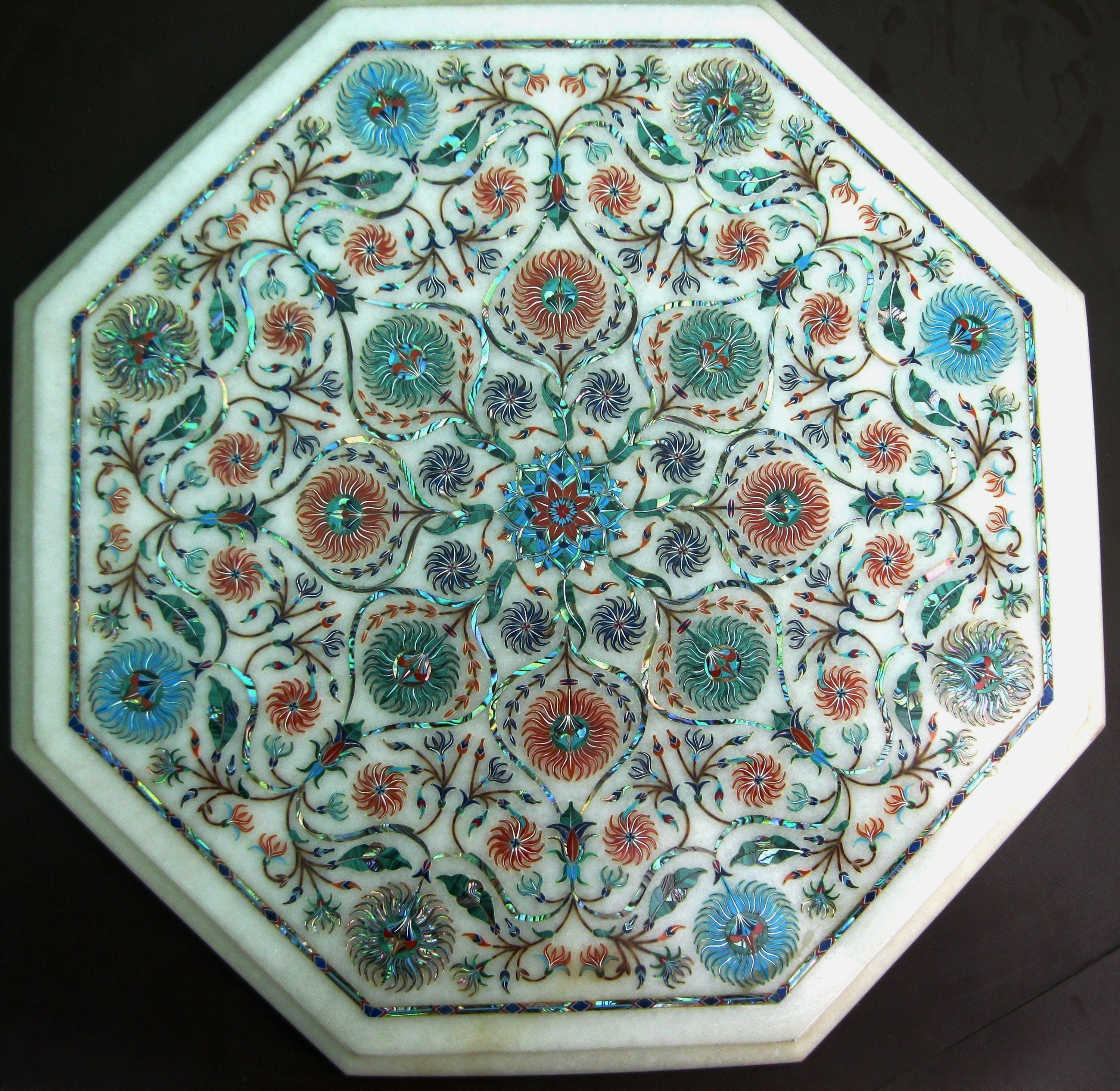Inlay work is a decorative technique where small pieces of materials like wood, metal, stone, or shells are set into the surface of an object to create intricate patterns or designs. The materials used for inlay are usually different in color or texture from the base material, making the design stand out. This art form is often seen in furniture, jewelry, flooring, and architectural elements. In marble inlay work, for example, semi-precious stones are meticulously cut and embedded into the marble surface to form beautiful patterns, often seen in tabletops and decorative panels. The process requires skilled craftsmanship to ensure the pieces fit together perfectly and are flush with the surface.