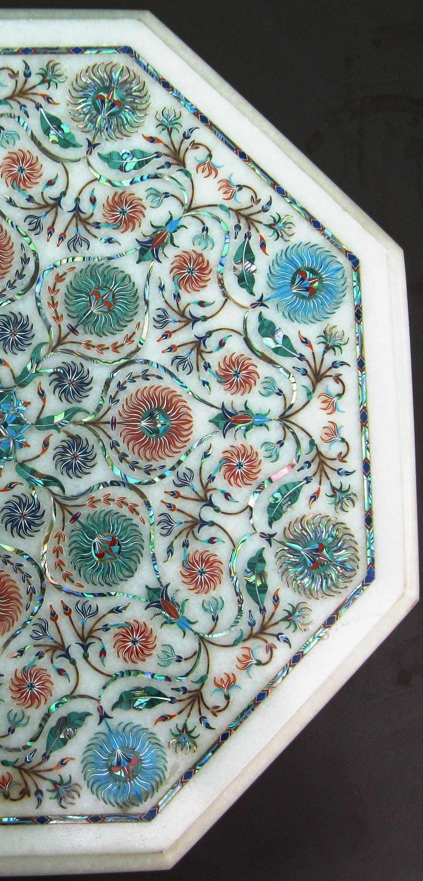 This octagonal marble table top is exquisitely inlaid with vibrant floral patterns made from semi-precious stones. The handcrafted design brings a touch of elegance and artistry to any room, combining tradition with luxurious craftsmanship. Ideal for home decor, office spaces, and sophisticated interiors.