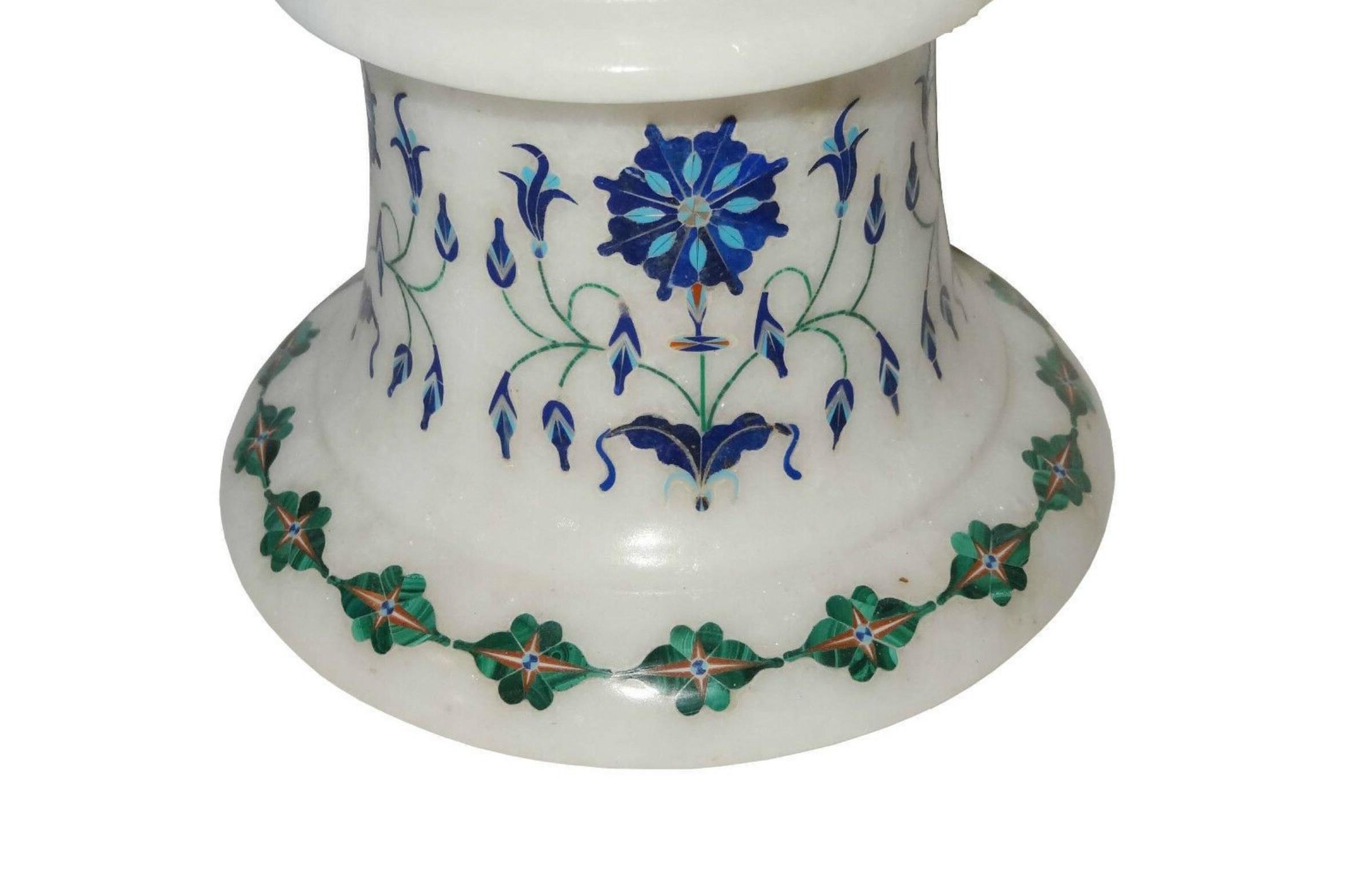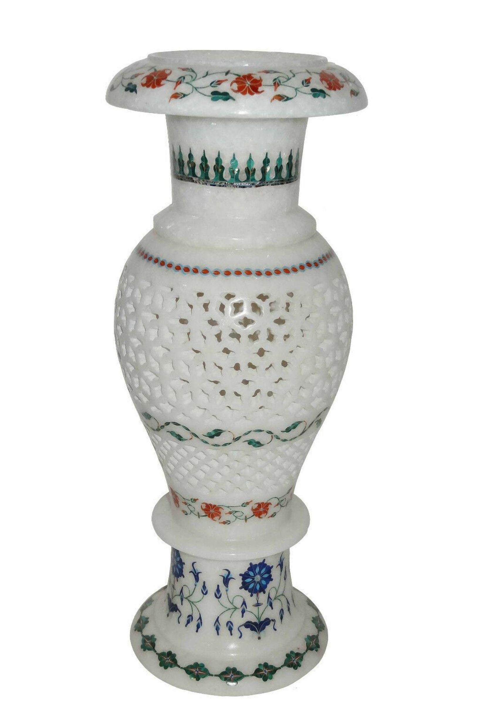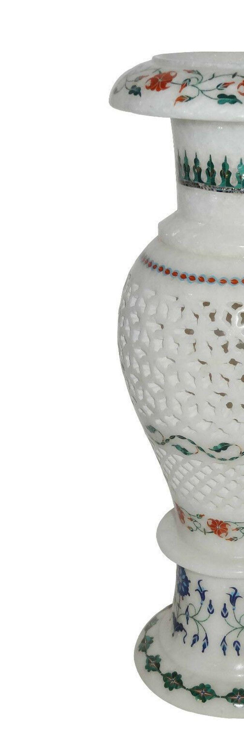 This elegant white marble vase features intricate floral inlay designs, handcrafted with precision. The combination of blue, green, and orange floral patterns creates a stunning contrast against the smooth white marble surface. Perfect as a centerpiece for home or office décor, this decorative vase embodies traditional craftsmanship and artistry. Its intricate lattice pattern adds a touch of sophistication, making it a timeless decorative piece for any interior space.