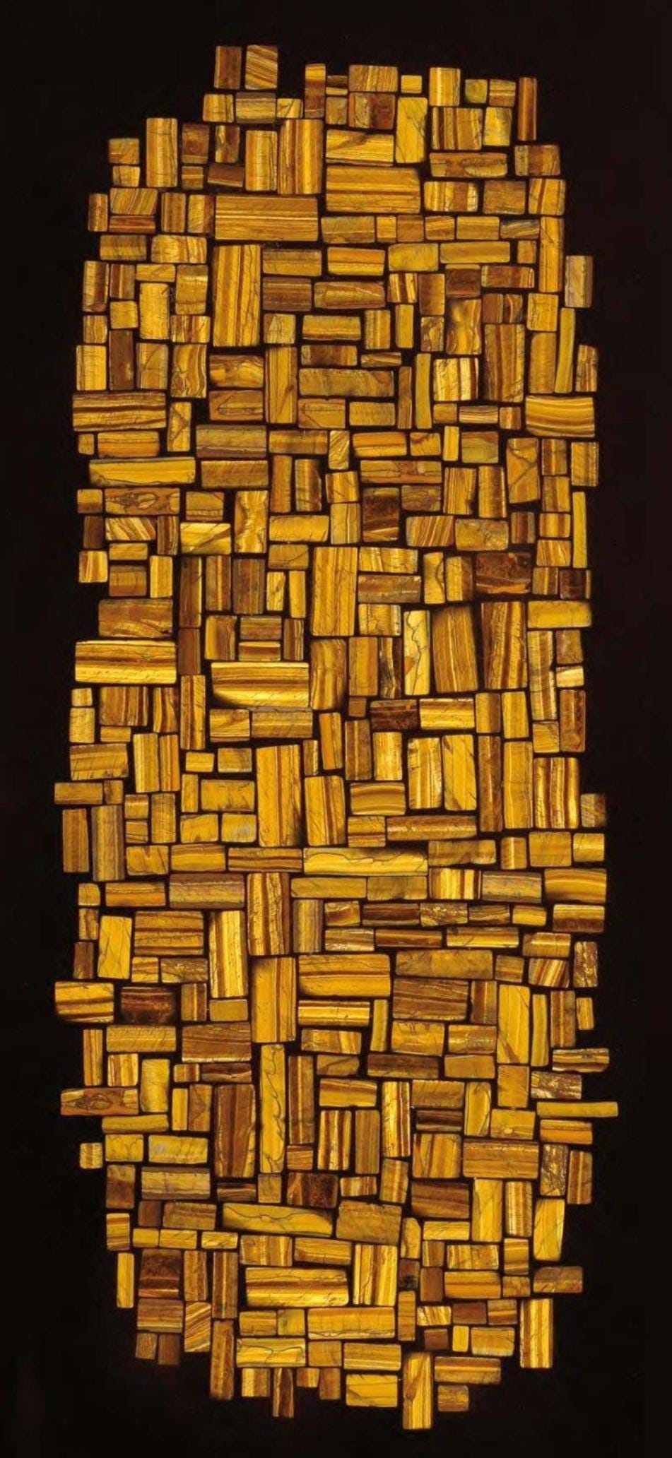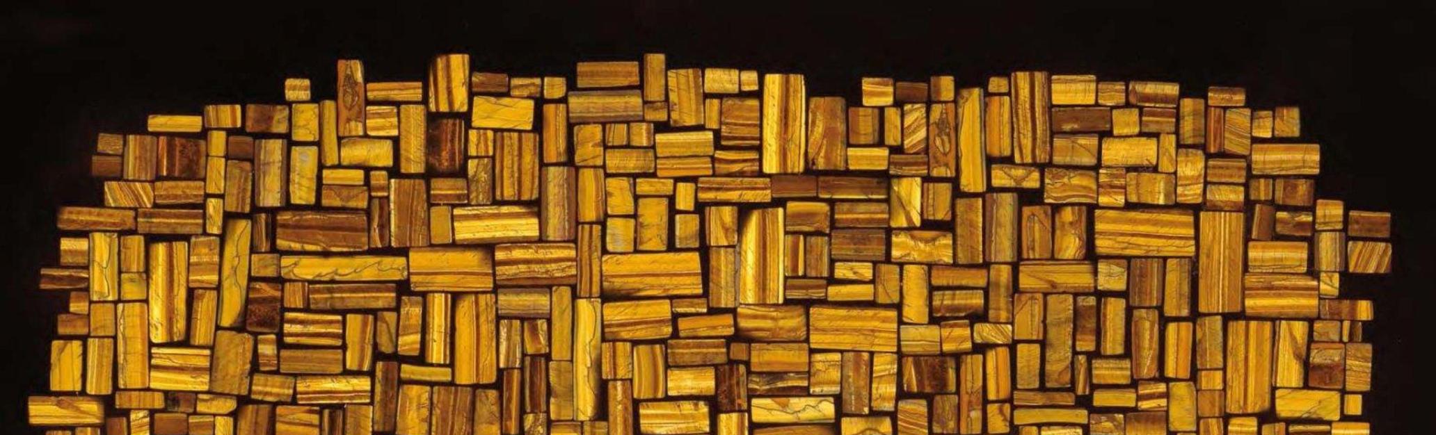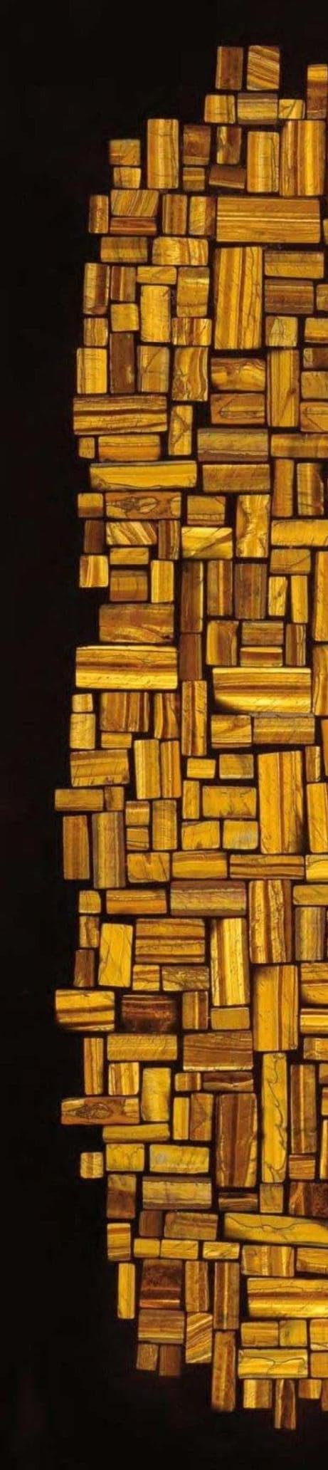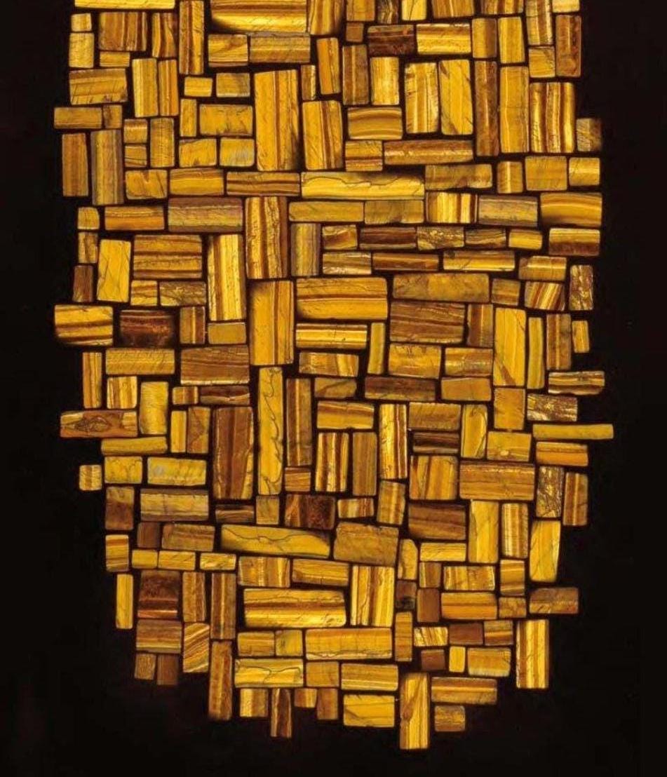 This unique mosaic design features an intricate pattern of rectangular wooden blocks in rich golden tones, meticulously arranged in both rectangular and oval shapes. The combination of varying sizes and shades of wood creates a visually captivating and dynamic texture. Set against a black backdrop, the mosaic exudes an elegant and natural aesthetic, perfect for enhancing the ambiance of modern or rustic interiors