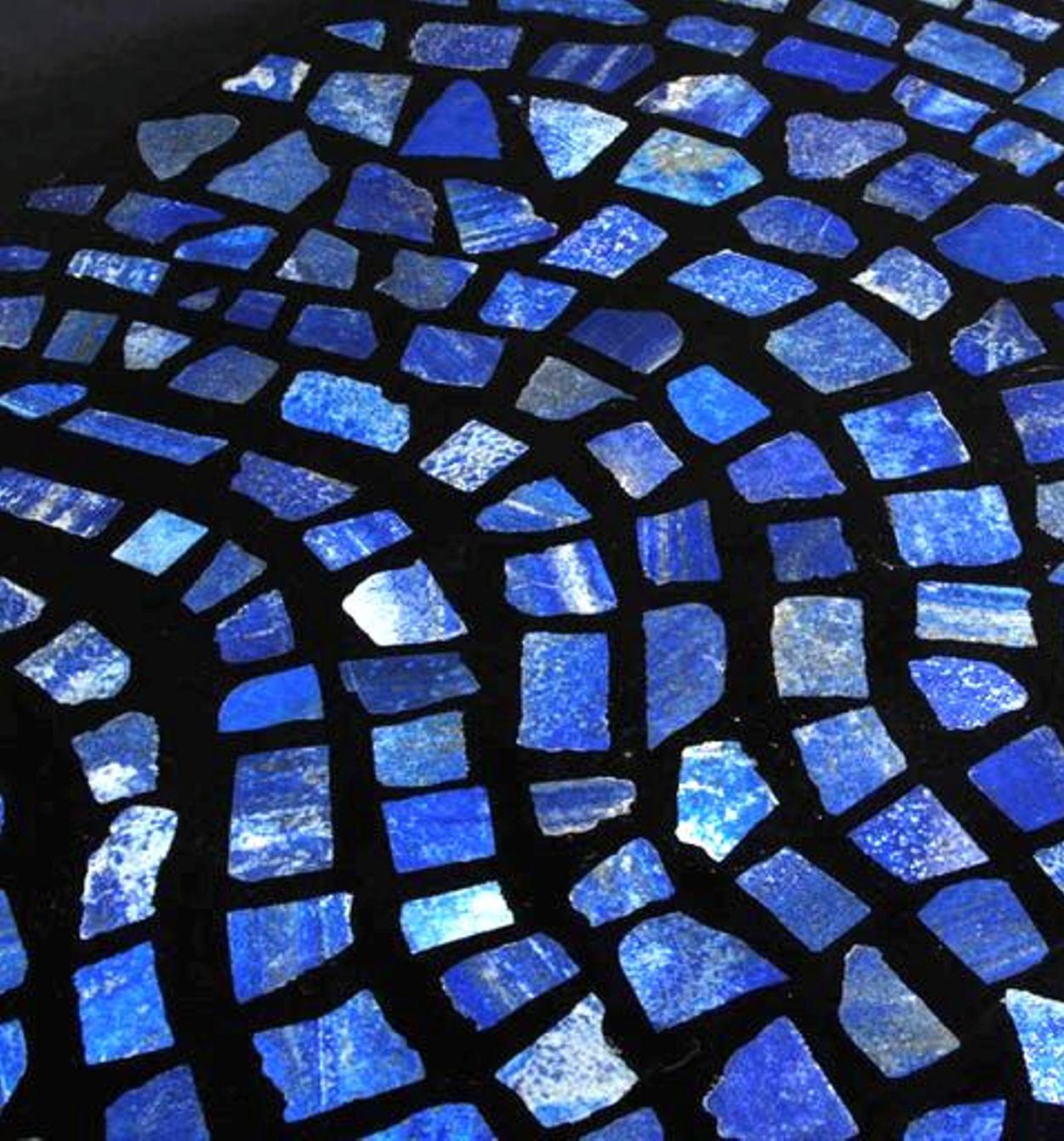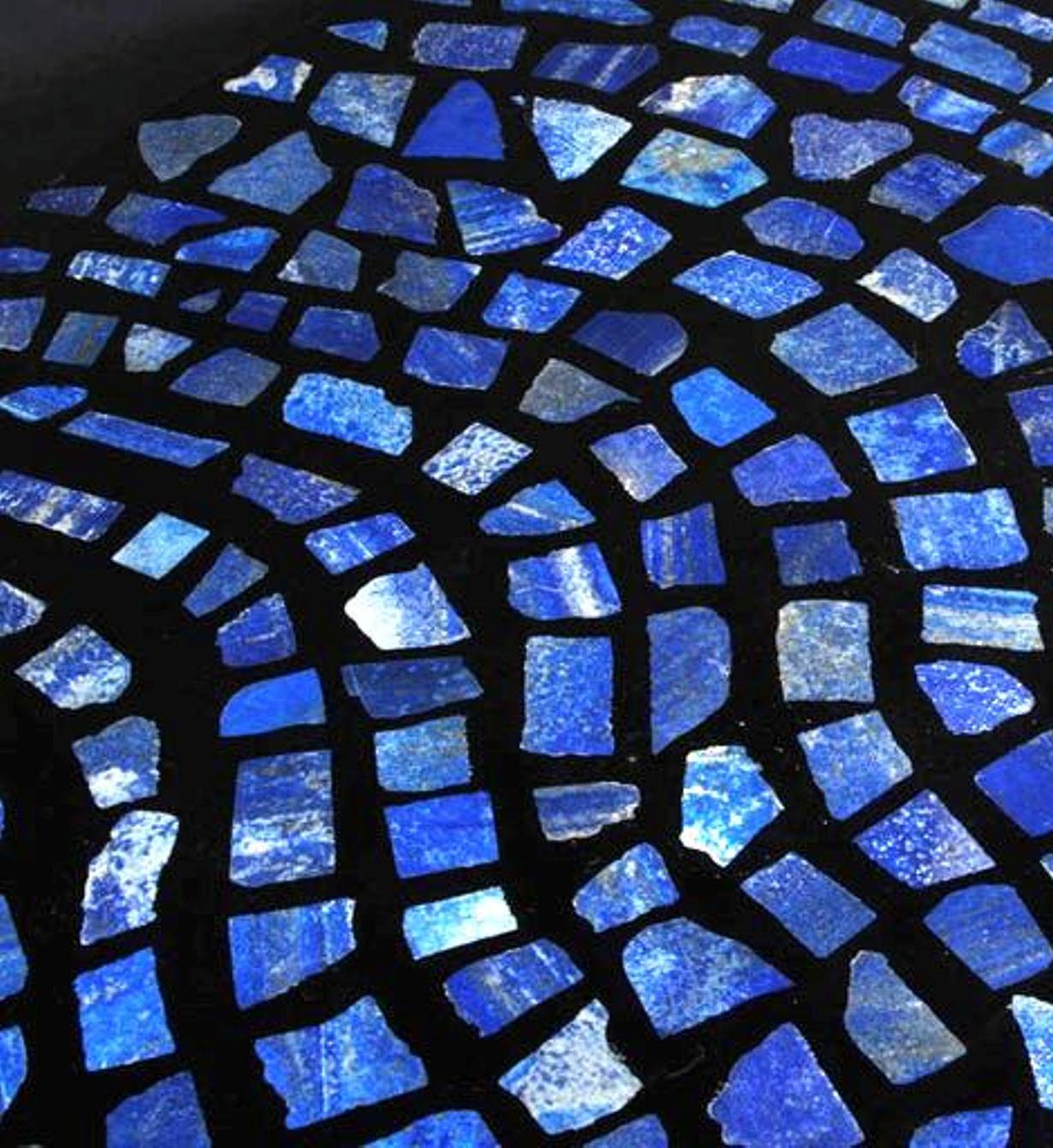 This round table showcases an exquisite mosaic inlay of deep blue semi-precious stones arranged in a captivating wavy pattern. The mosaic pieces are carefully set against a black background, creating a dynamic contrast that accentuates the vibrant blue hues. The design evokes a sense of movement and fluidity, making it a perfect centerpiece for contemporary or modern interiors. Ideal for adding a touch of luxury and artistic flair to living spaces, this table is both functional and decorative.