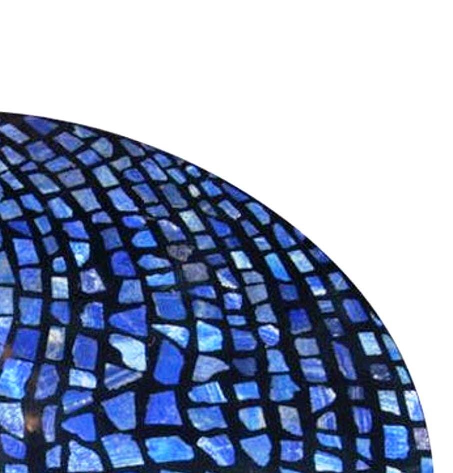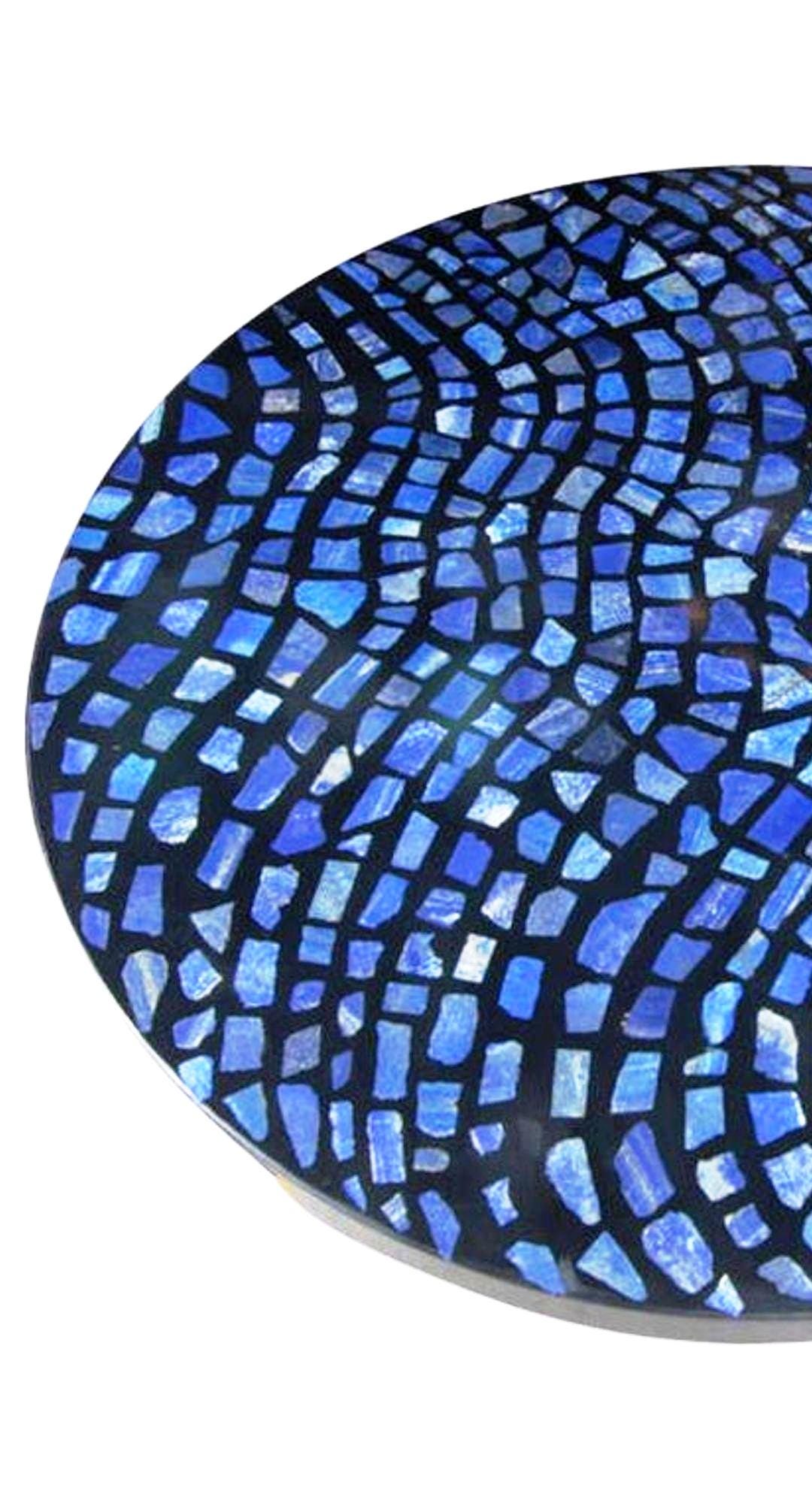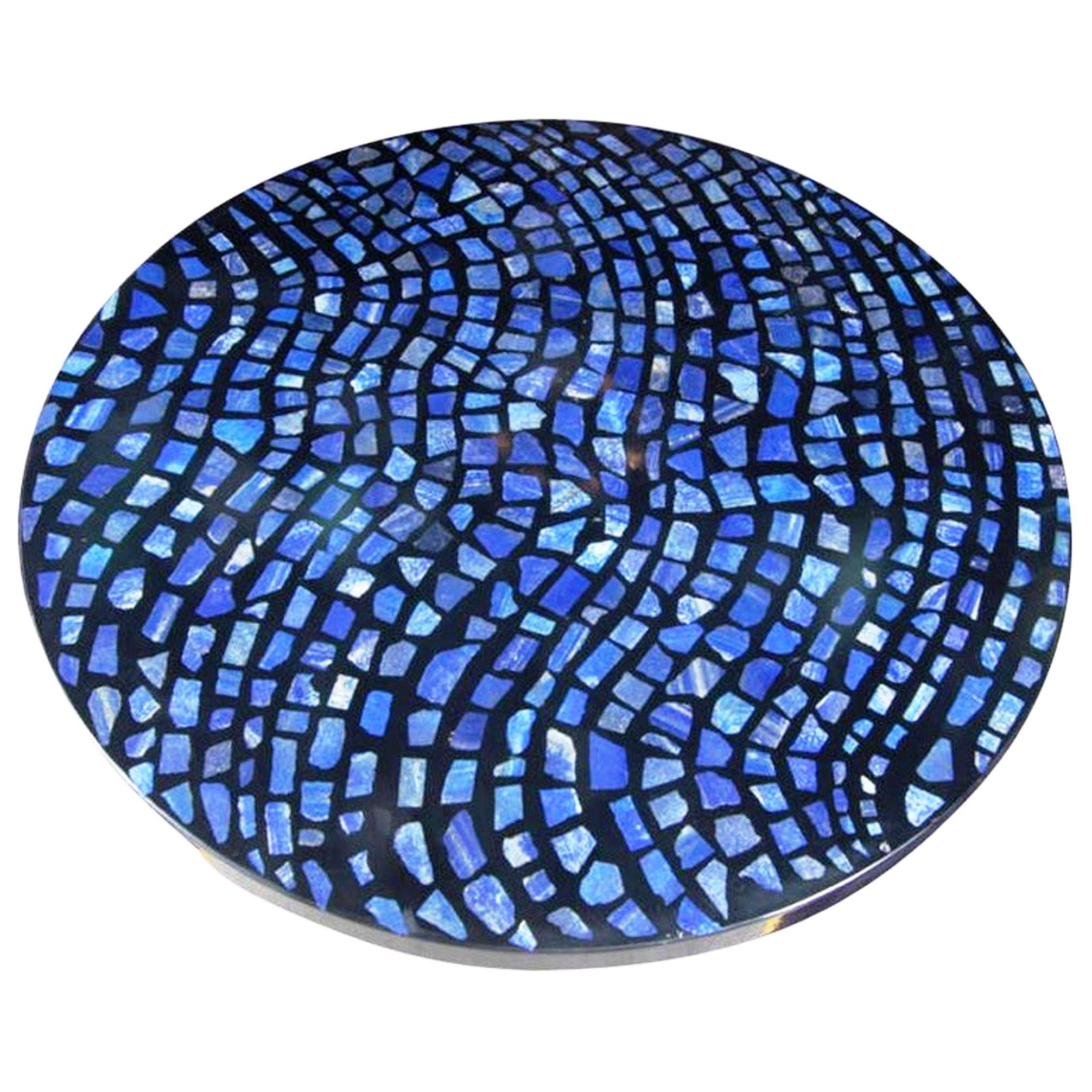 Round Blue Mosaic Table with Wavy Pattern Semi Precious Stone Inlay