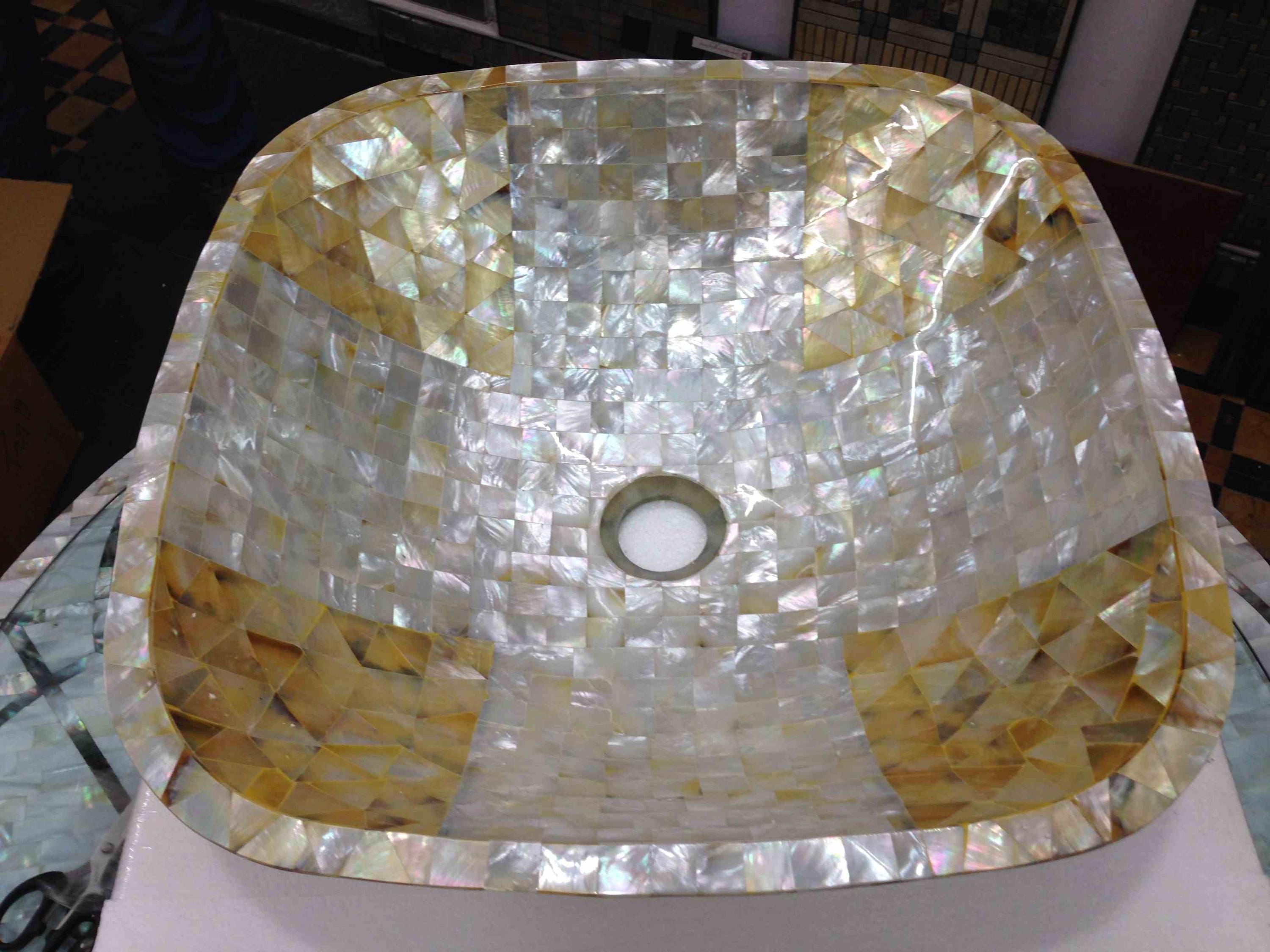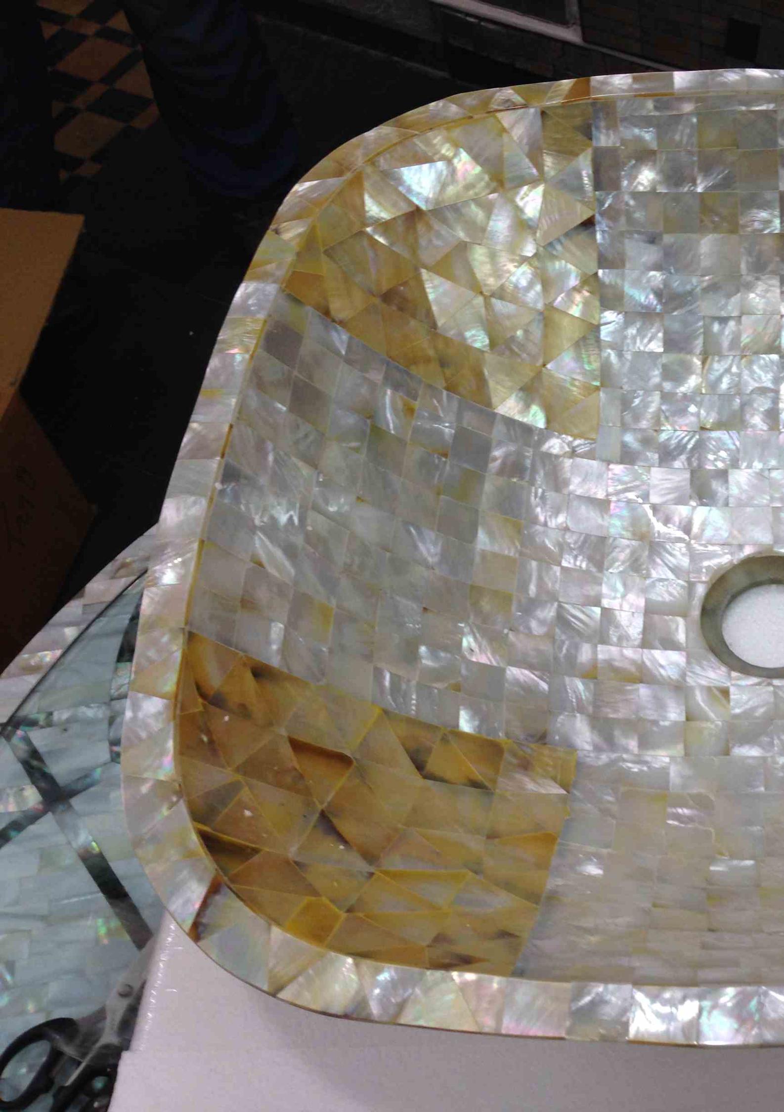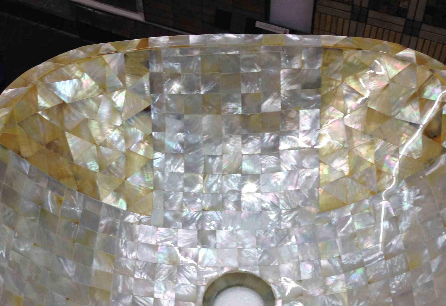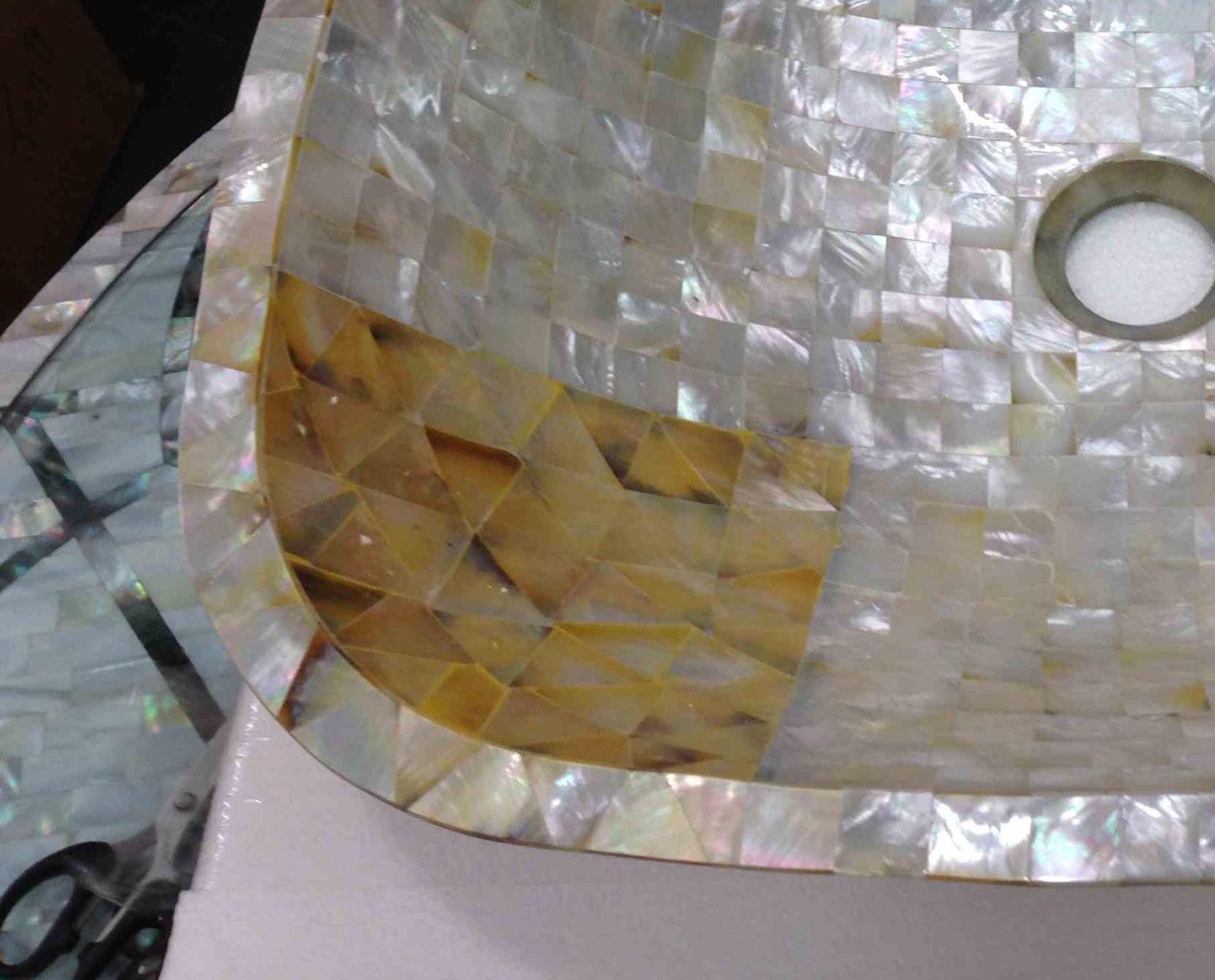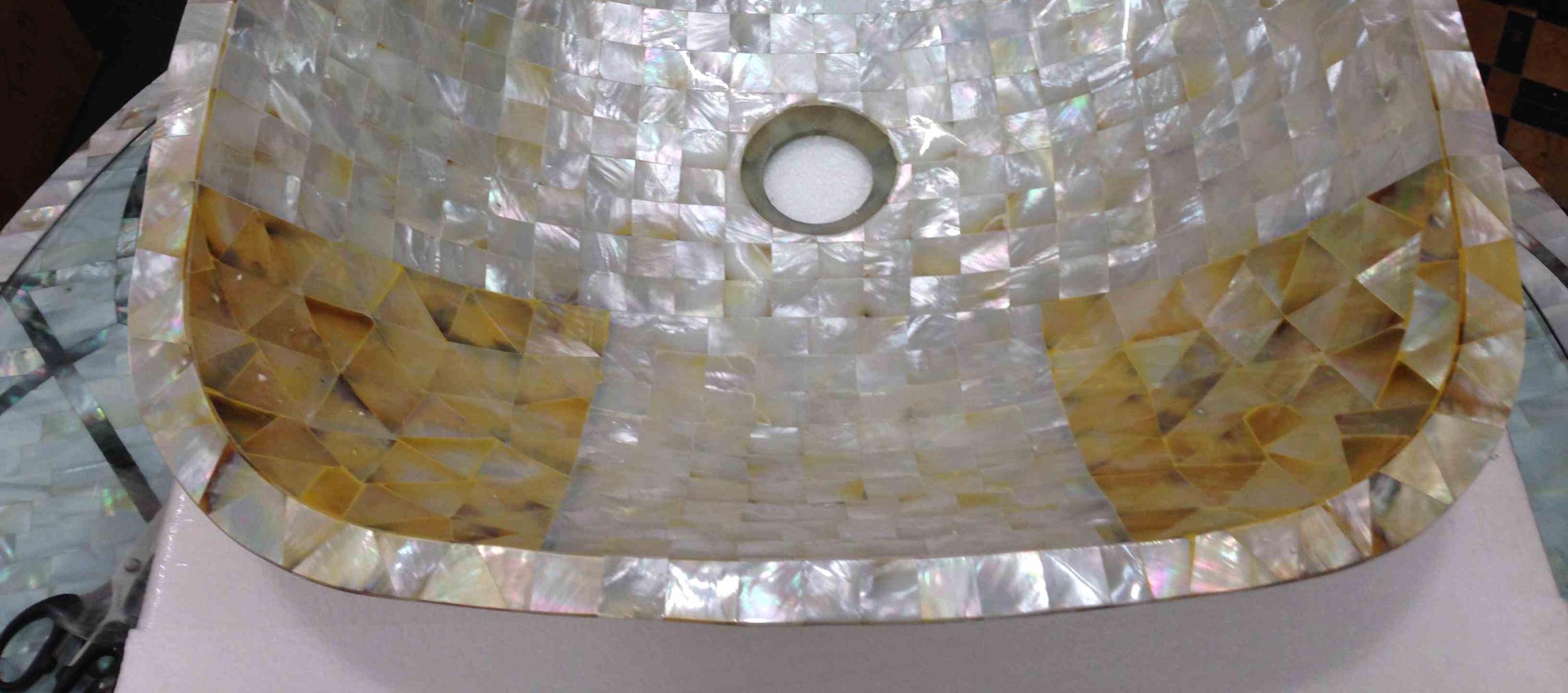 This stunning square-shaped sink features a beautiful mosaic pattern made from genuine mother-of-pearl, enhanced with golden accents. Its reflective surface adds a luxurious touch, perfect for high-end bathrooms. The craftsmanship ensures durability while providing an exquisite look. This sink combines elegance and functionality, making it a sophisticated choice for modern interiors.