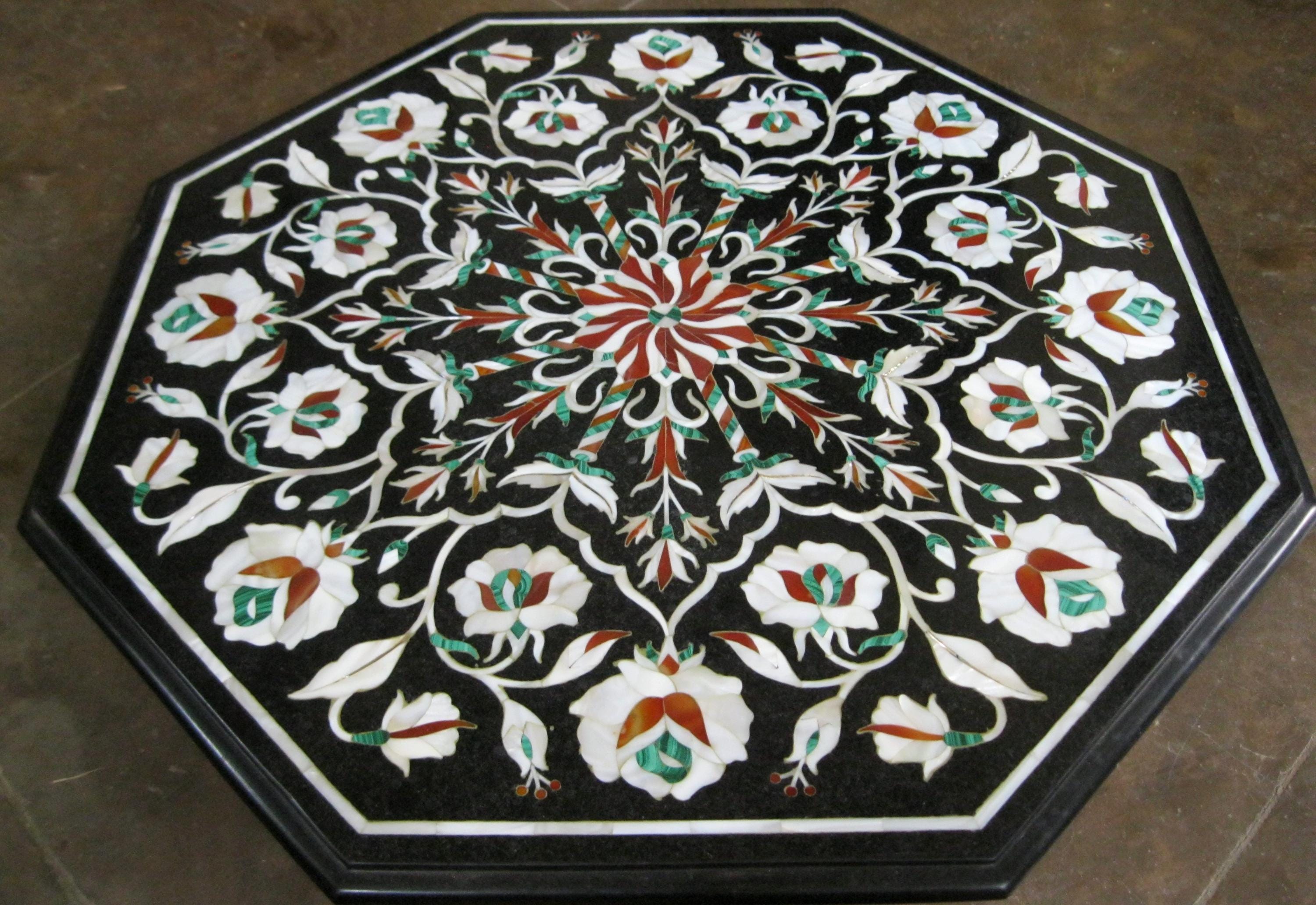This octagonal black marble table top showcases exquisite craftsmanship with intricate floral inlay art. The design features semi-precious stones, adding elegance and luxury to any space. Ideal for living rooms, office meeting rooms, or as a decorative center table, this handmade piece is a testament to the timeless beauty of marble inlay work.
