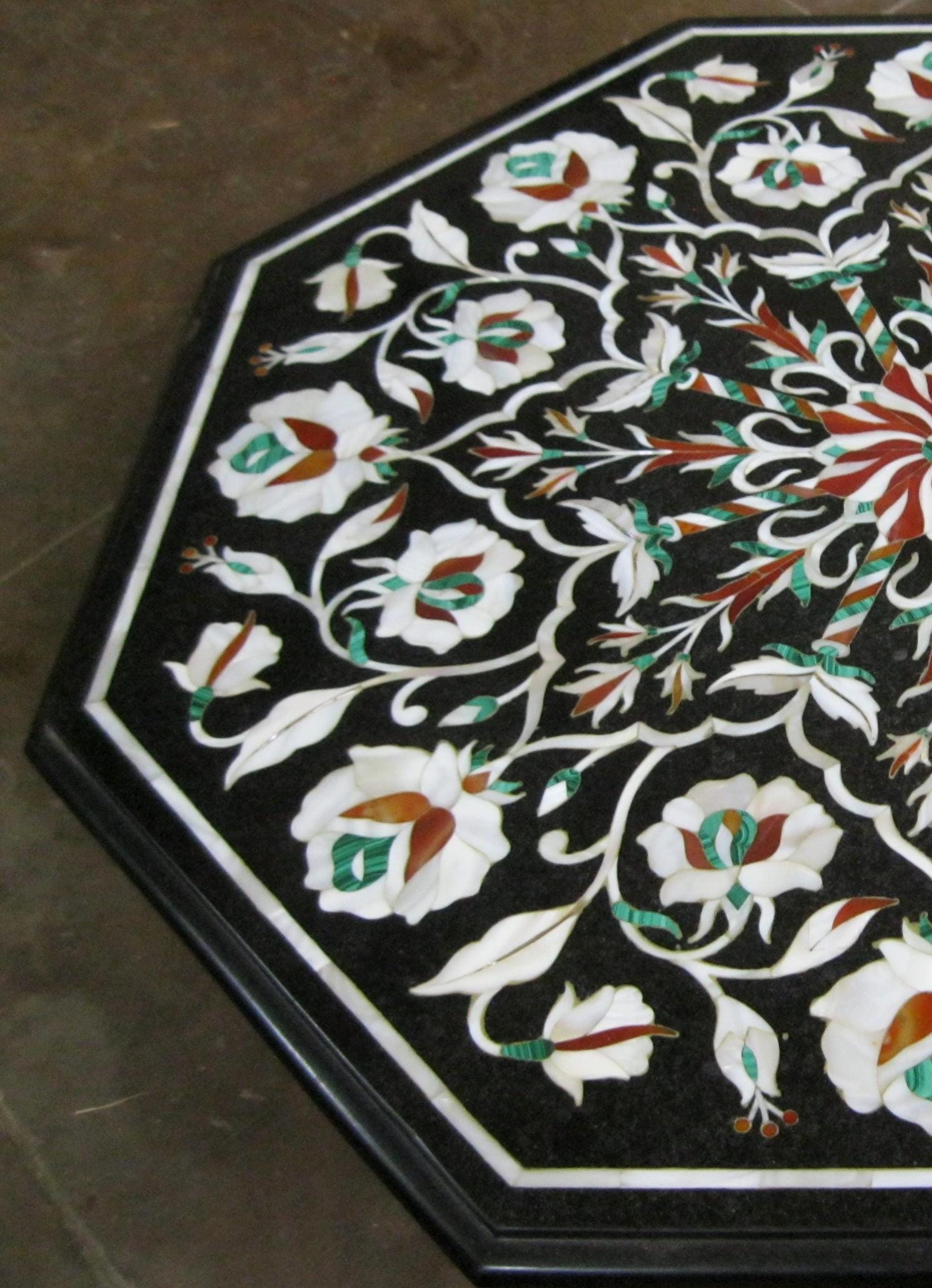 Octagonal Black Marble Table Top with Floral Inlay Art Handcrafted Semi-Precious Stone Design