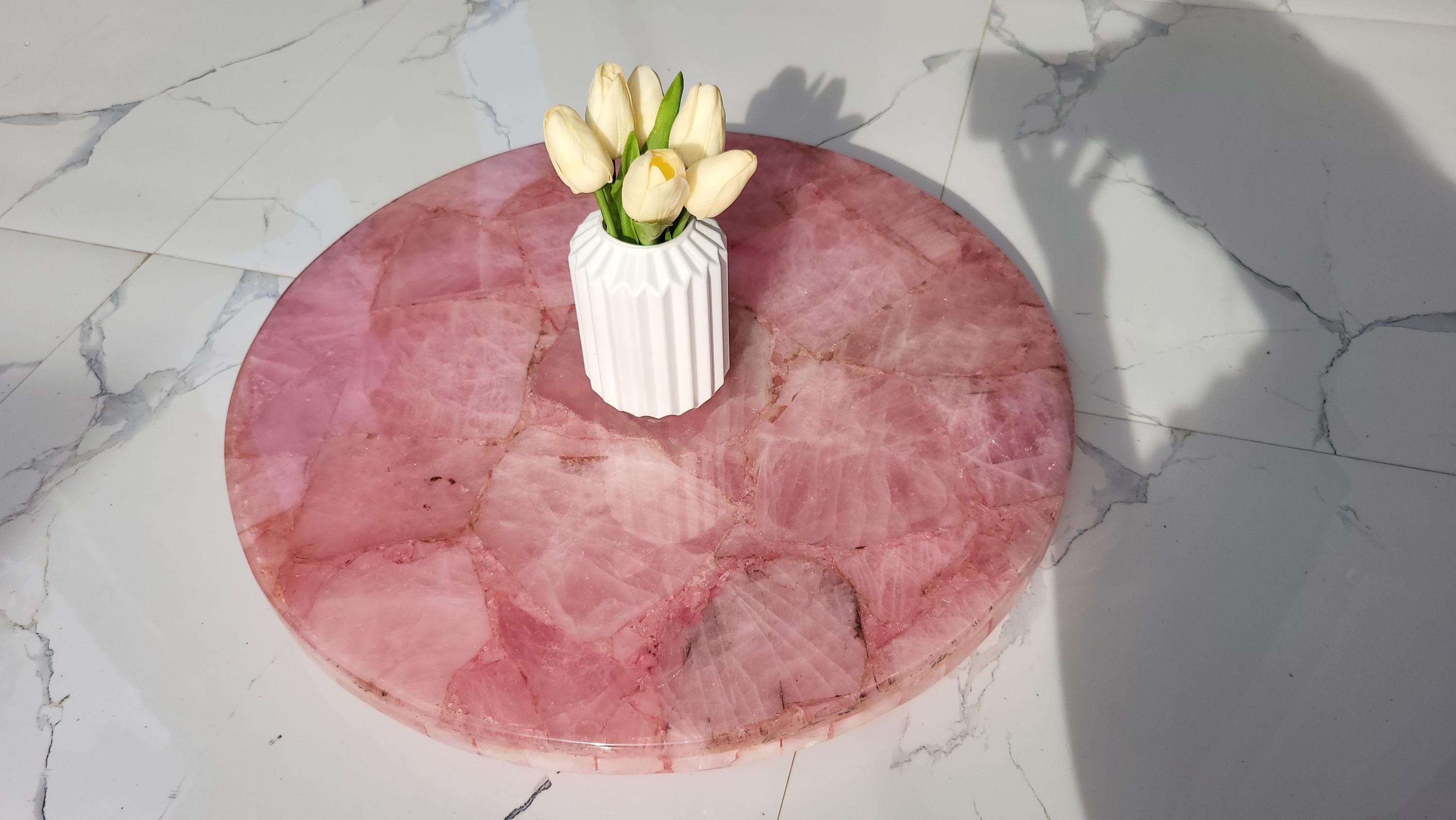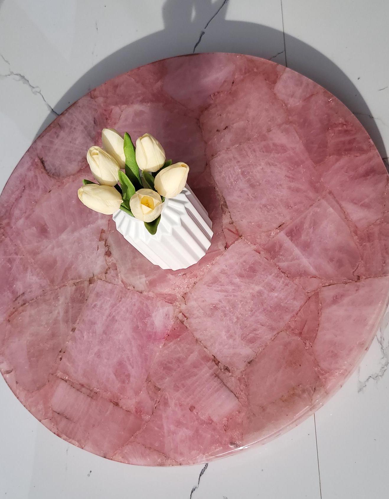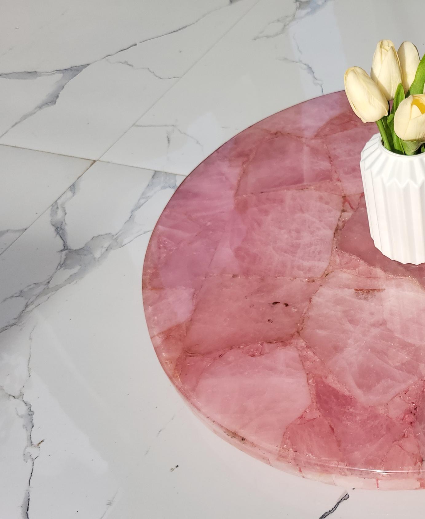 This stunning round centerpiece is crafted from polished rose quartz stone, exuding a soft pink hue and natural textures. It serves as an elegant focal point for any coffee or dining table. Paired with a minimalistic, the piece adds a touch of luxury and sophistication to modern or traditional decor settings. Ideal for enhancing living rooms, offices, or conference spaces with a natural, yet refined aesthetic.