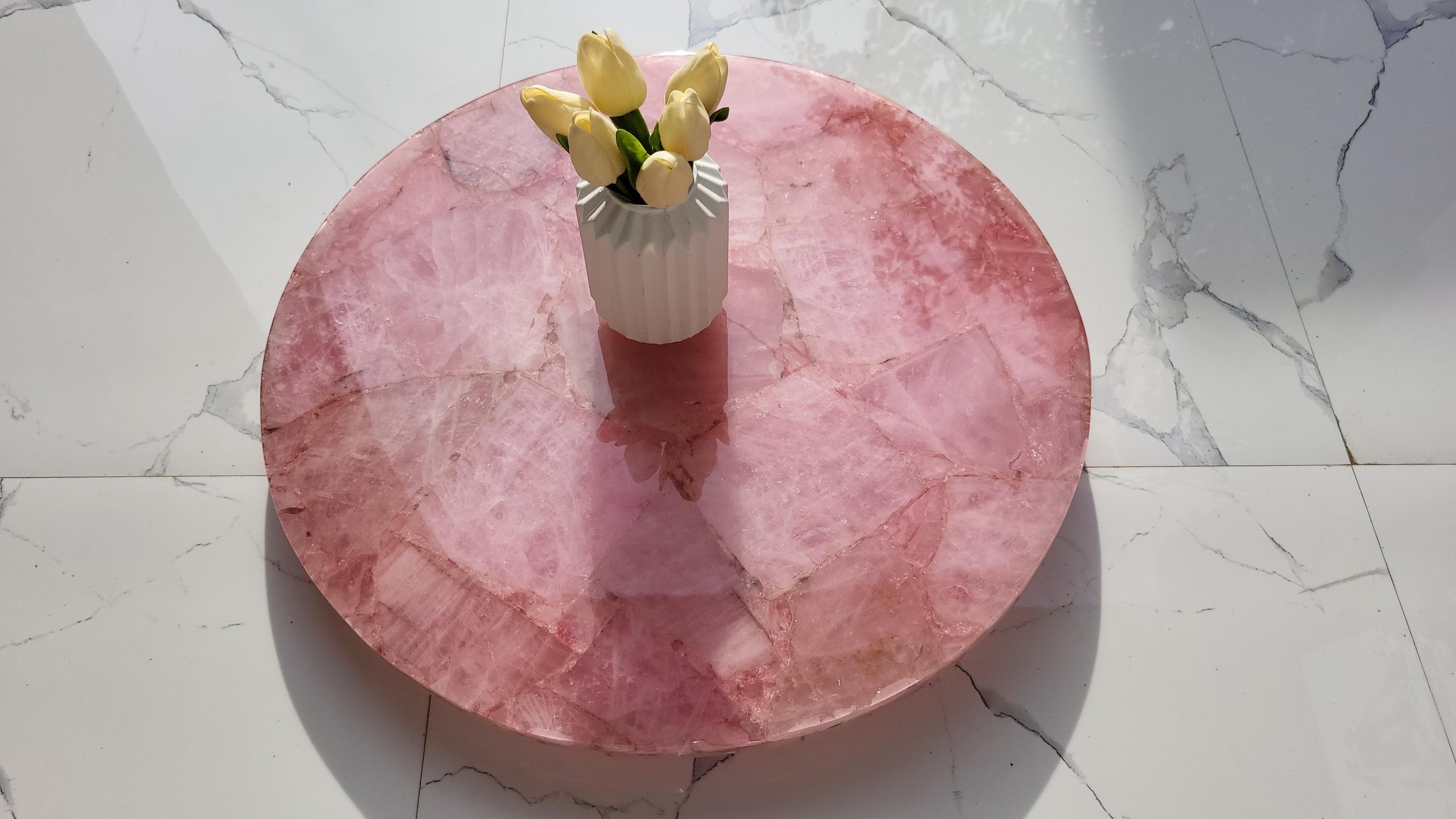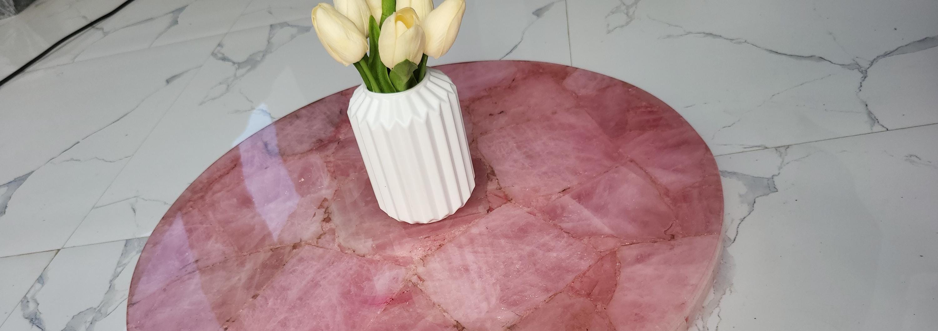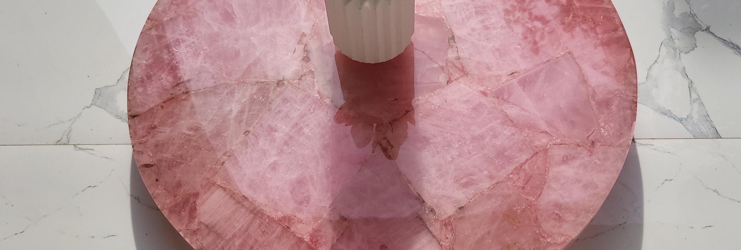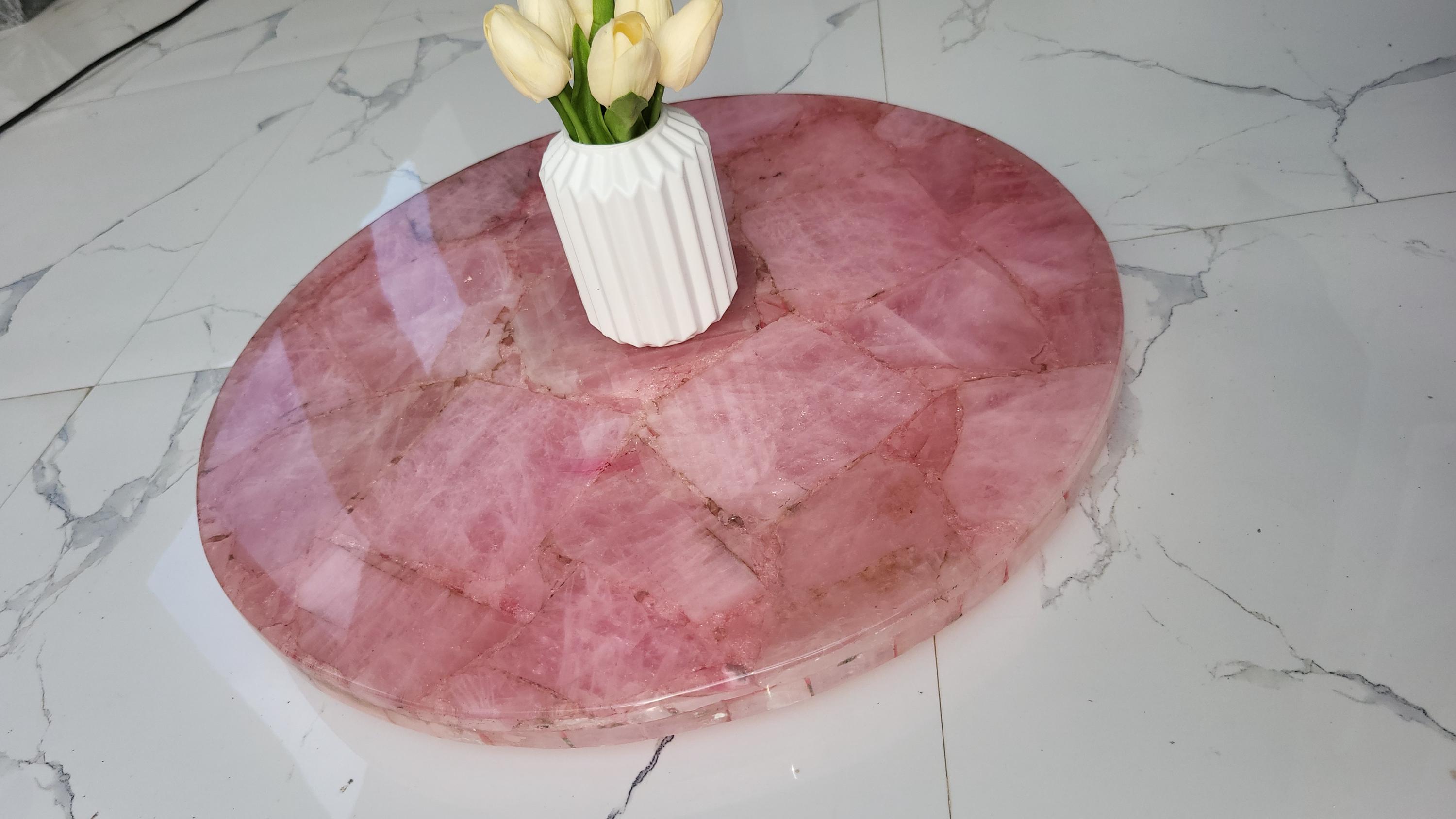 This stunning round centerpiece is crafted from polished rose quartz stone, exuding a soft pink hue and natural textures. It serves as an elegant focal point for any coffee or dining table. Paired with a minimalistic, the piece adds a touch of luxury and sophistication to modern or traditional decor settings. Ideal for enhancing living rooms, offices, or conference spaces with a natural, yet refined aesthetic.