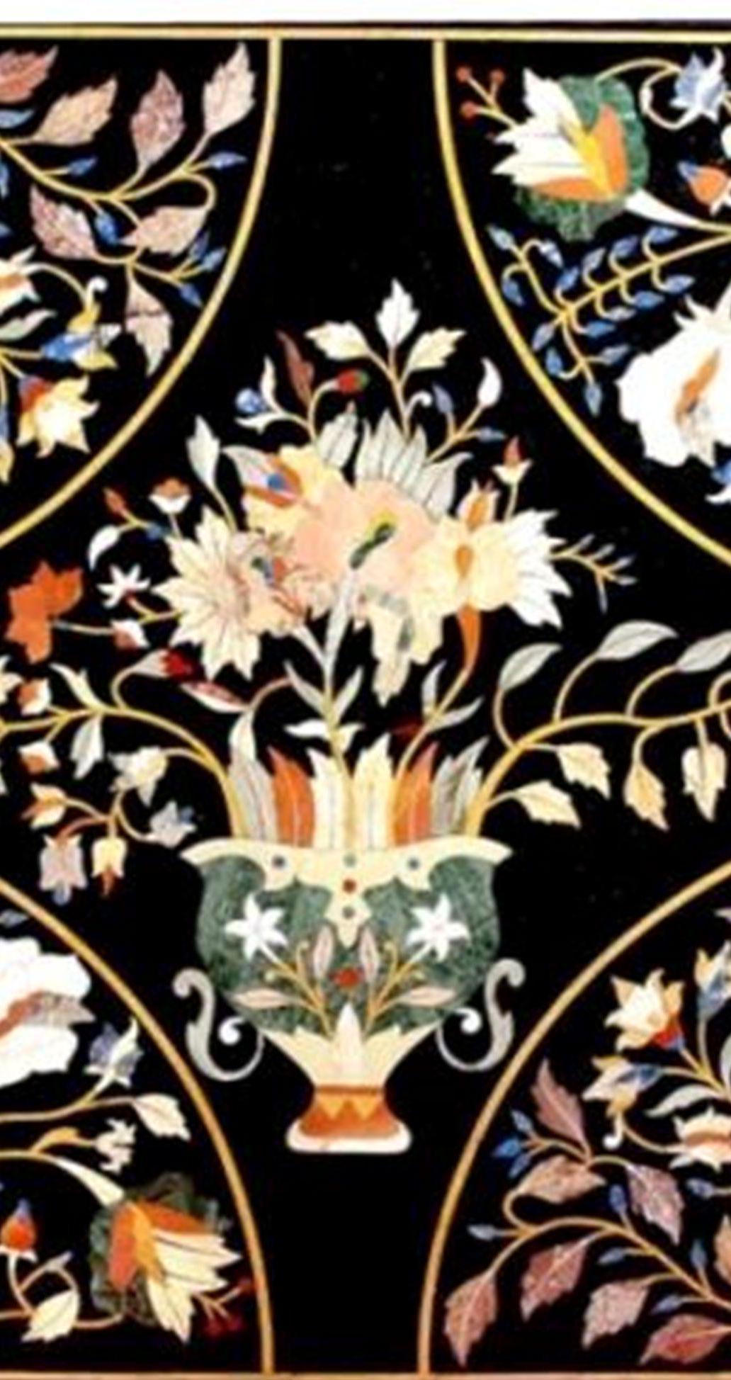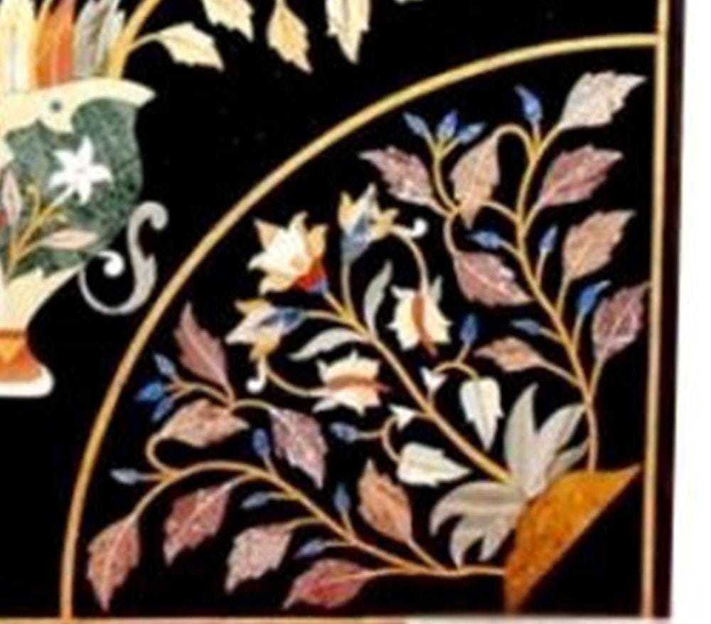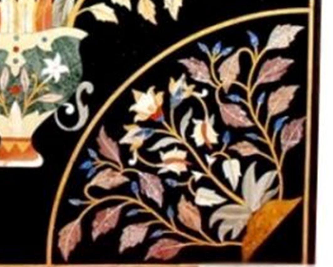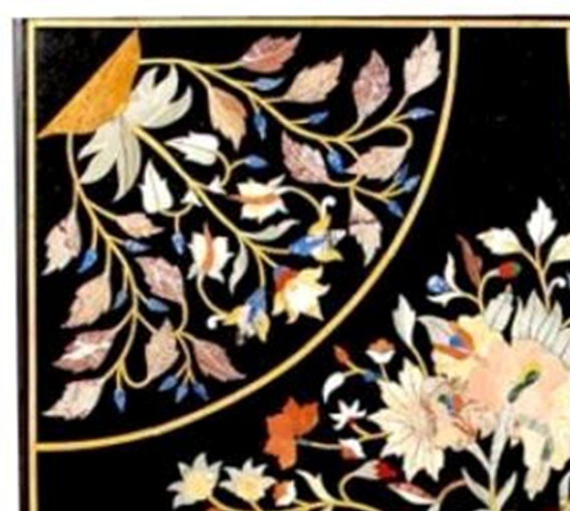 Handmade Black Marble Table Top: Inlaid Semiprecious Stones, Pietra Dura Art