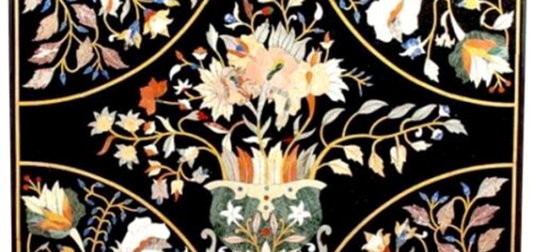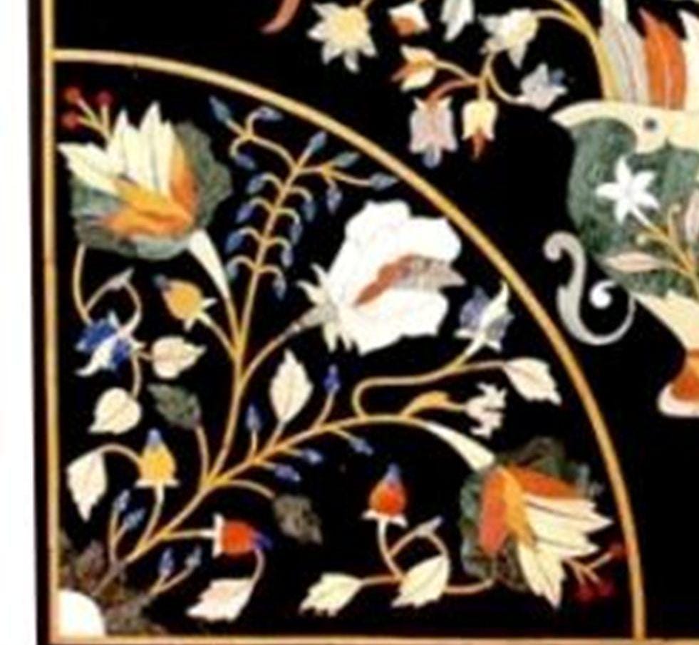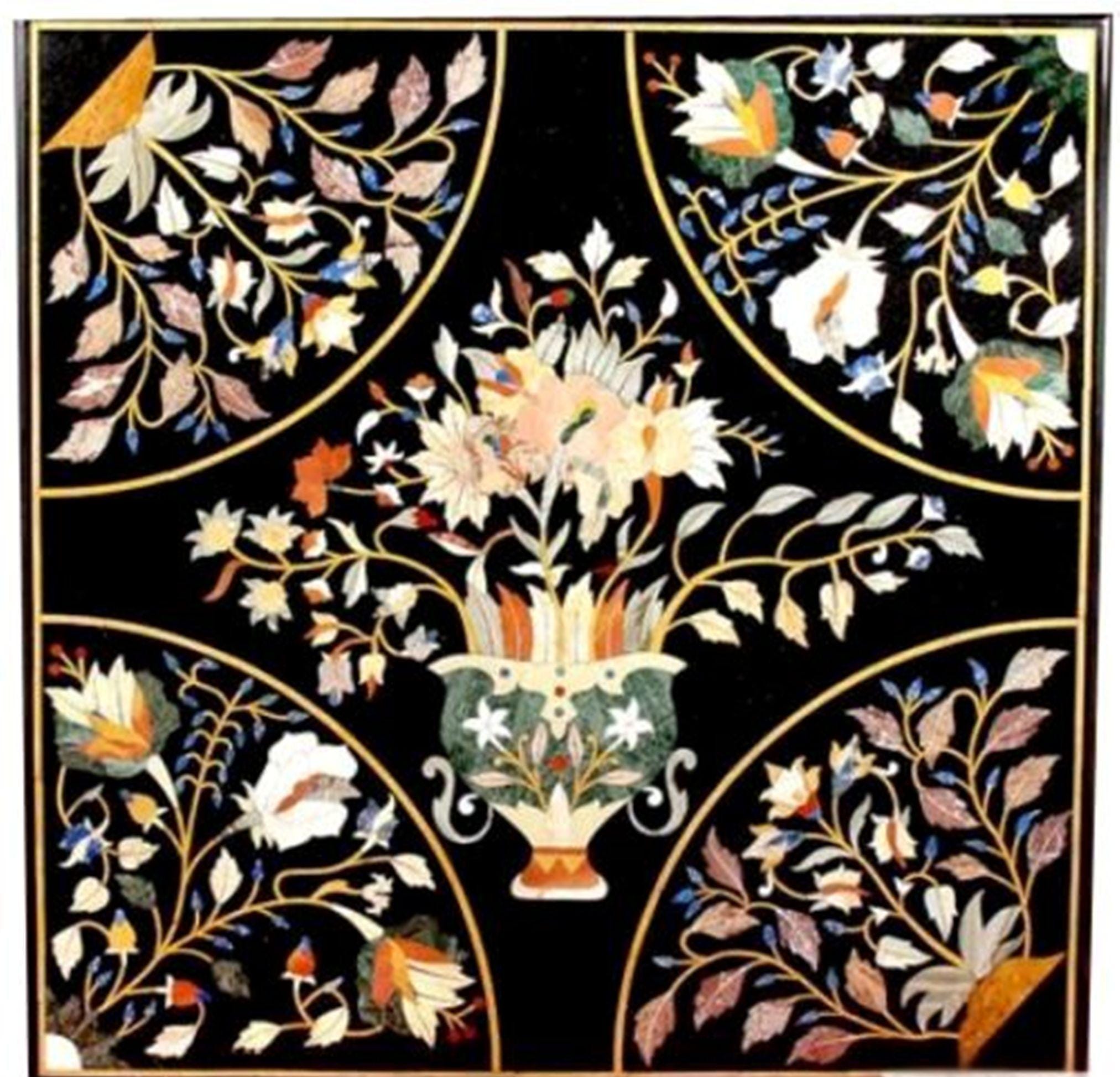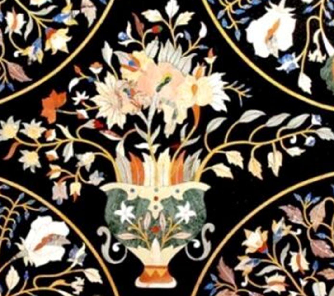 Handmade Black Marble Table Top: Inlaid Semiprecious Stones, Pietra Dura Art