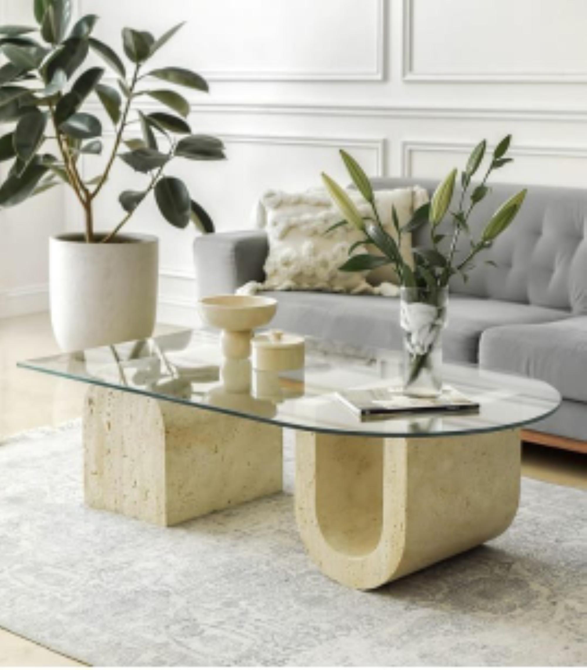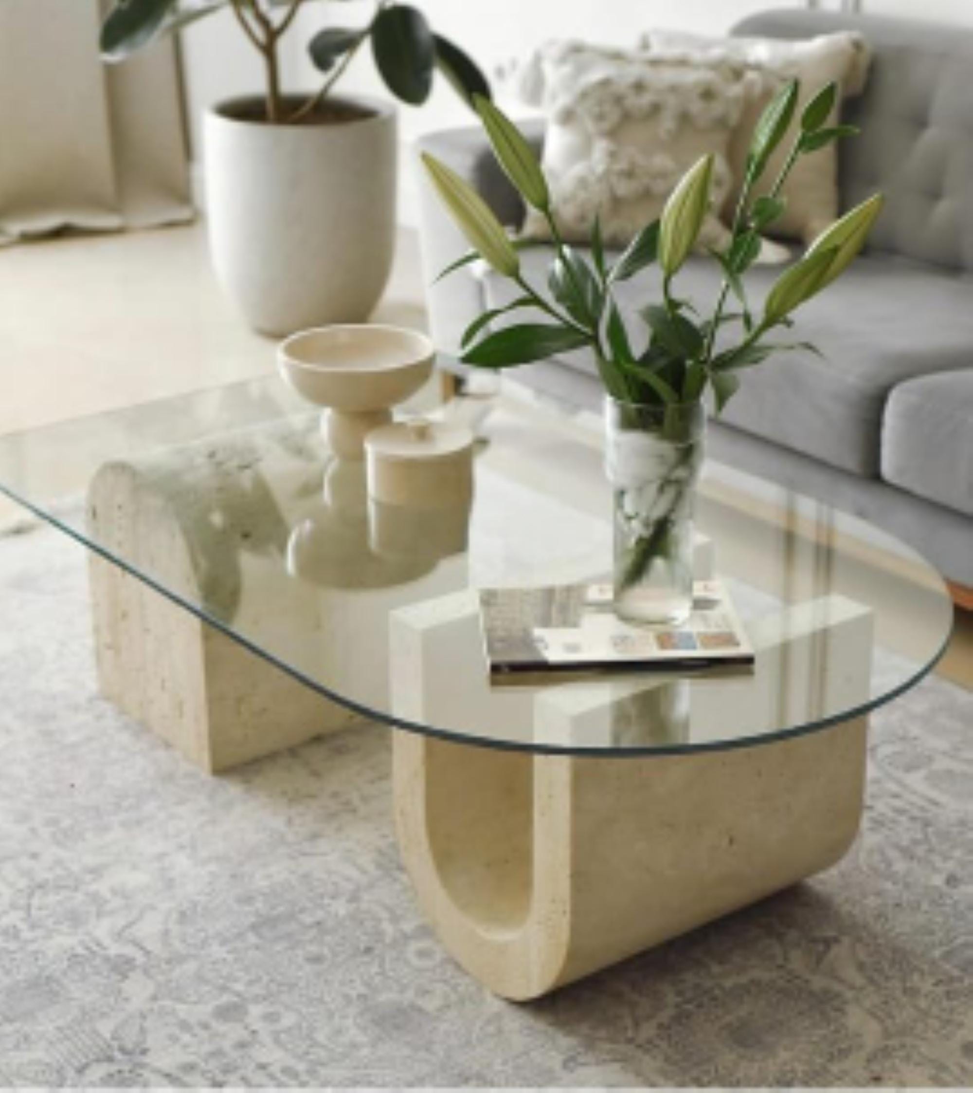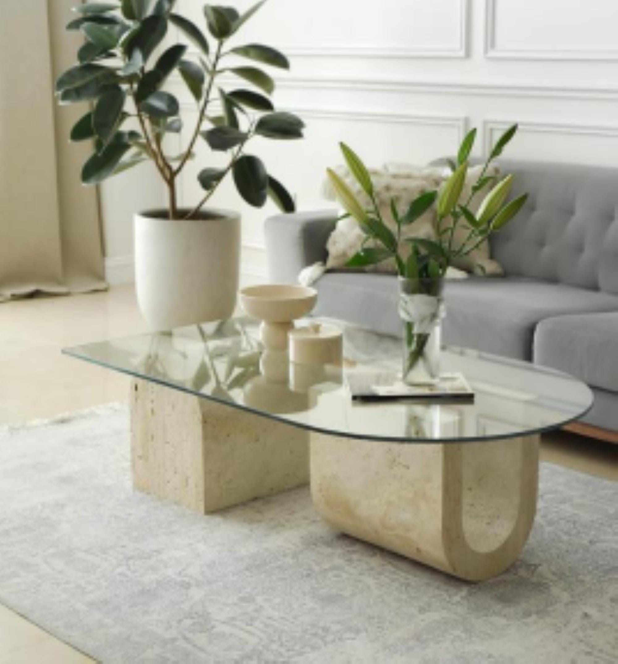 This modern oval glass coffee table is a true blend of timeless beauty and minimalist sophistication. Featuring a transparent tempered glass top supported by uniquely sculpted travertine stone bases, this handmade table is an exceptional piece of functional art. The natural stone base—crafted from high-quality travertine—adds texture and warmth with its earthy tones, making it ideal for both classic and contemporary interiors.