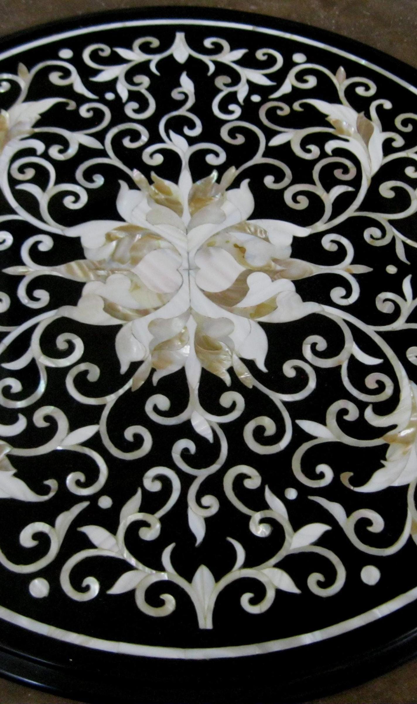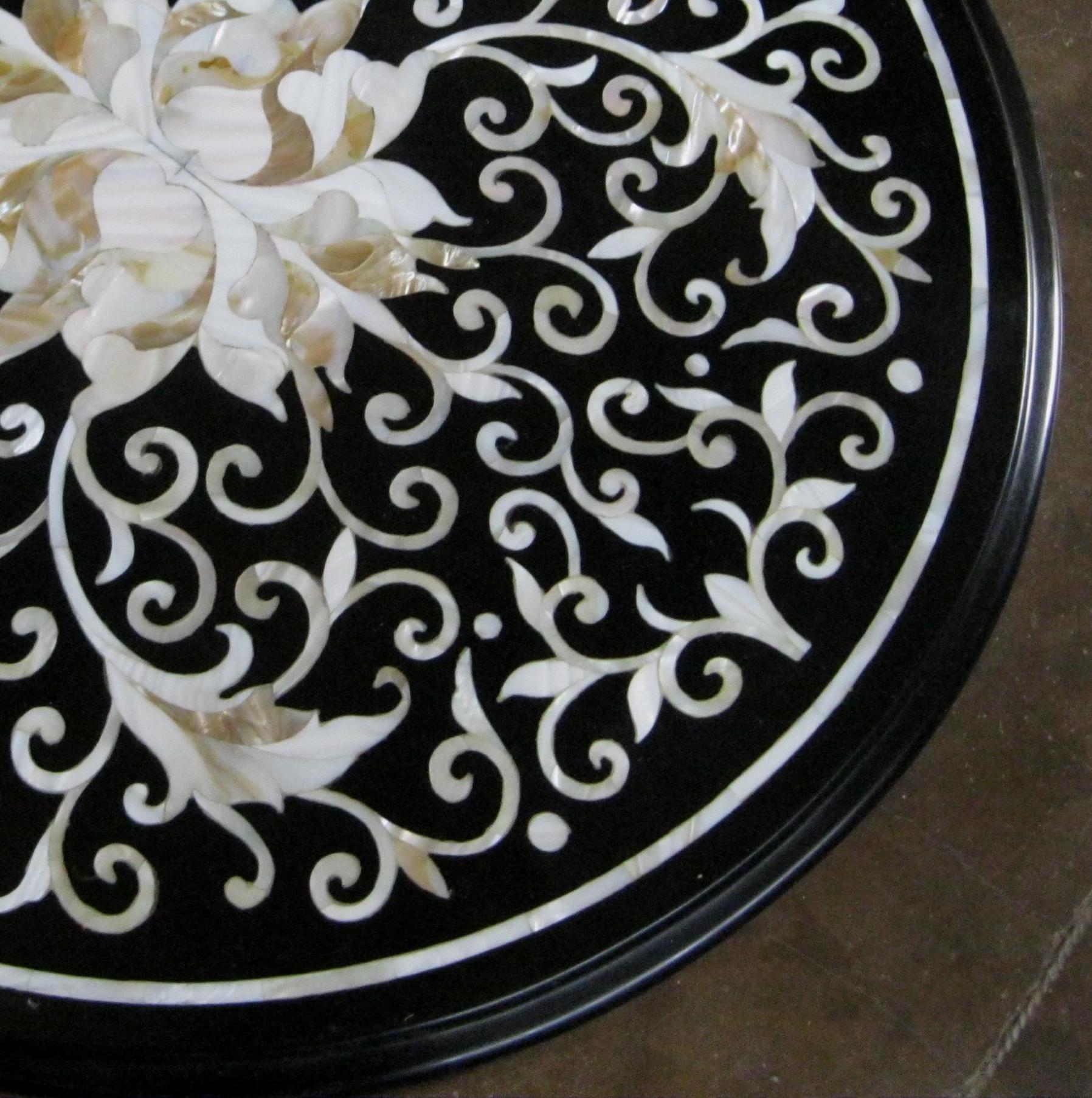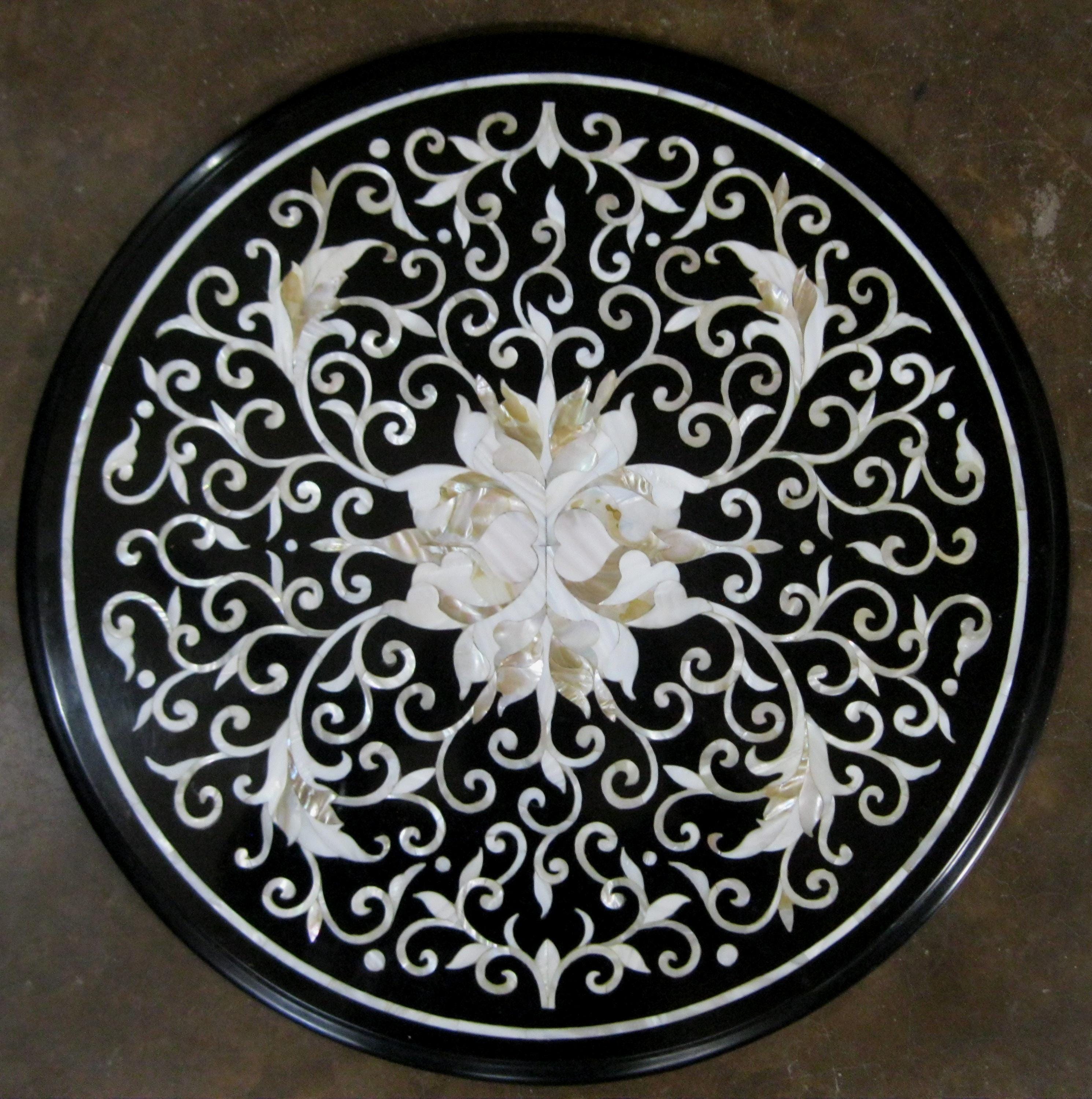 Round Black Marble Inlay Table Top With The Beautiful Floral Work/ Dinning Center Table Top ( Size 18 Inches )