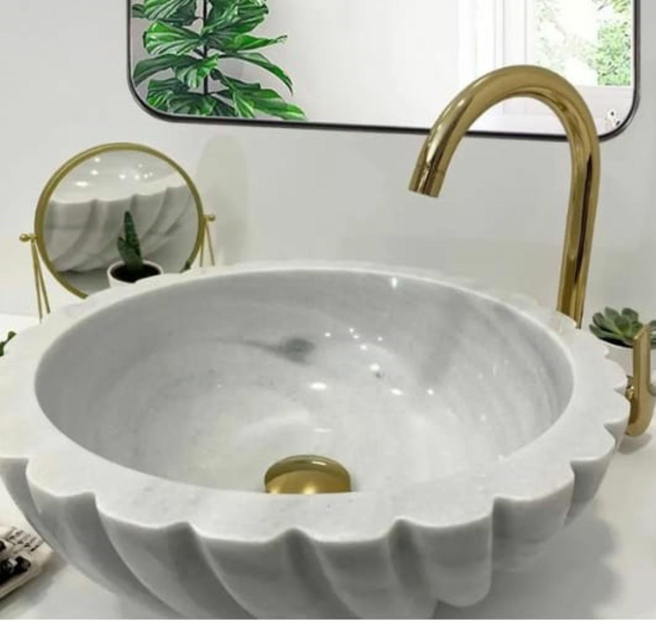 Elevate your bathroom aesthetics with this elegant round white stone wash basin, meticulously handcrafted from premium-quality natural stone. Featuring a smooth, polished interior and a beautifully scalloped outer edge, this basin brings a unique blend of vintage charm and modern luxury to your space.