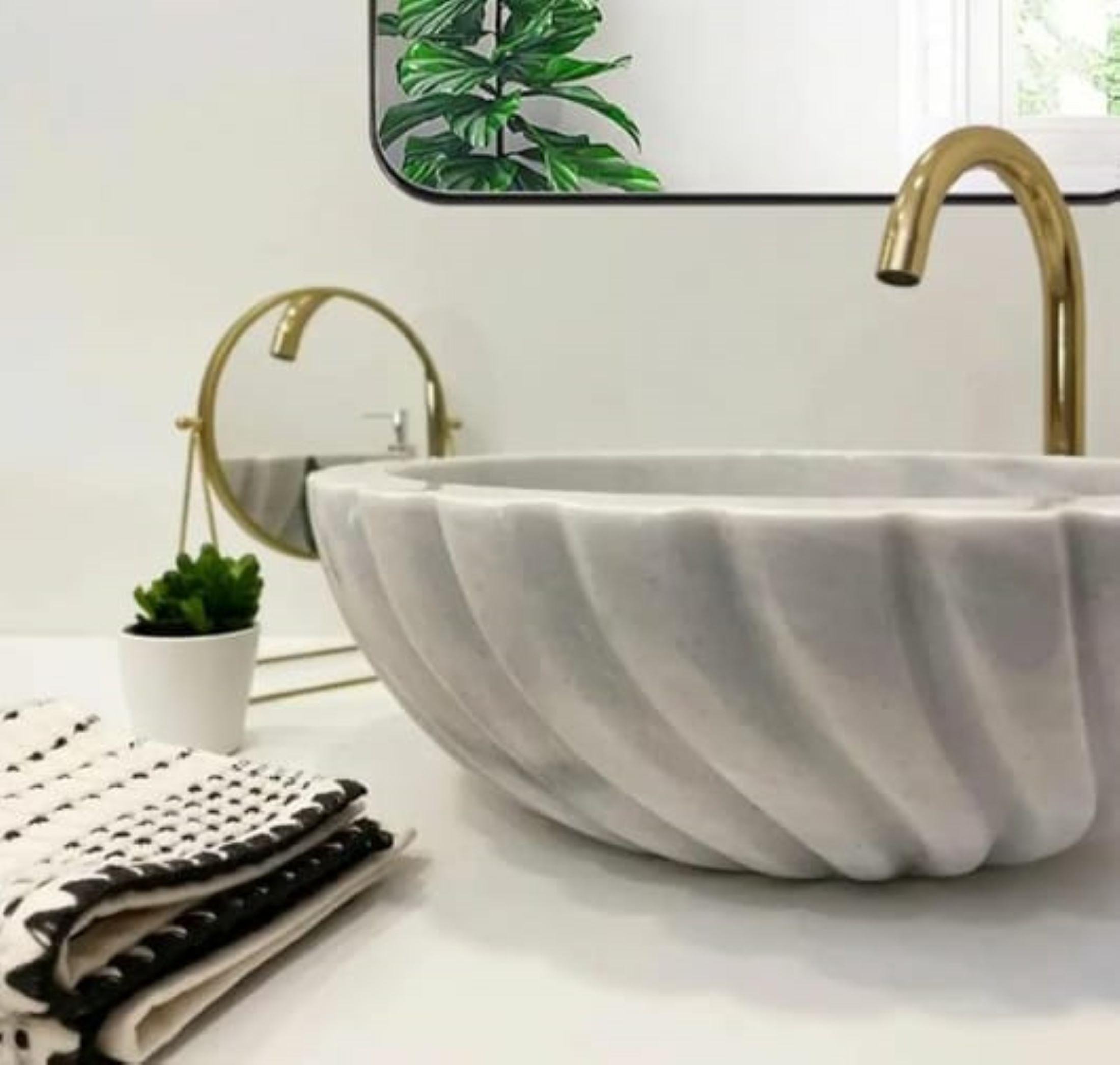 The natural white tones and subtle veining of the stone create a serene, spa-like ambiance, while the soft, curved silhouette adds an artistic touch to your vanity or powder room. Fitted with a golden drain cap (included), this basin is both decorative and highly functional.