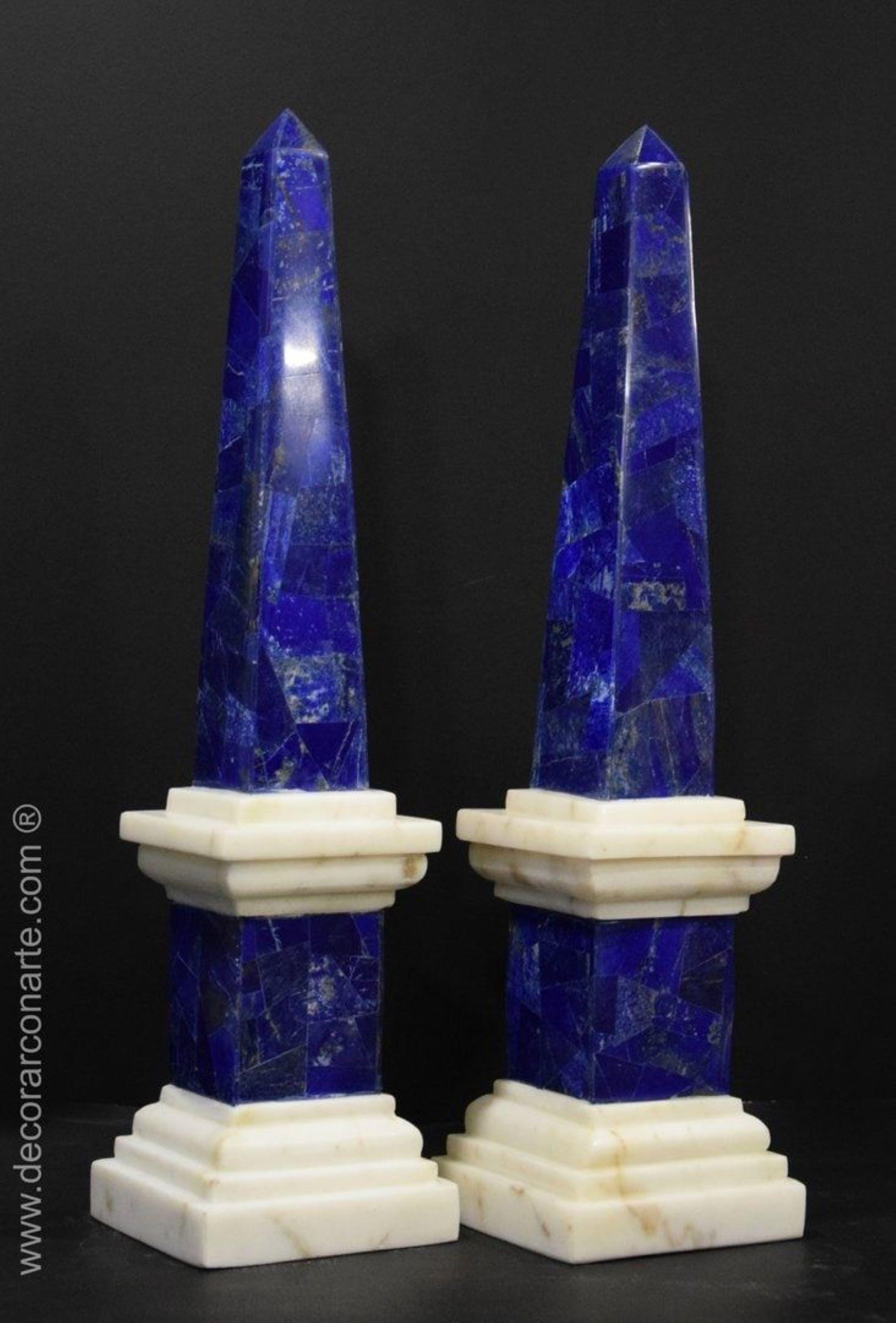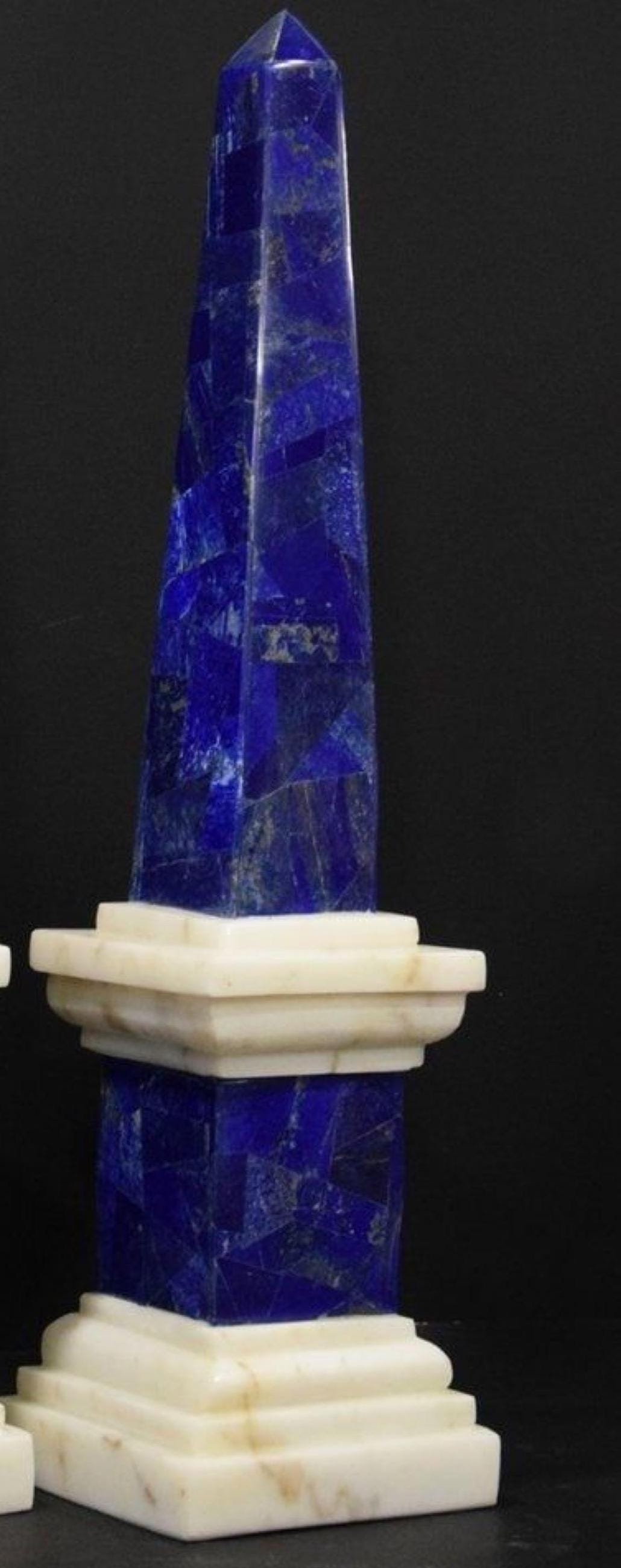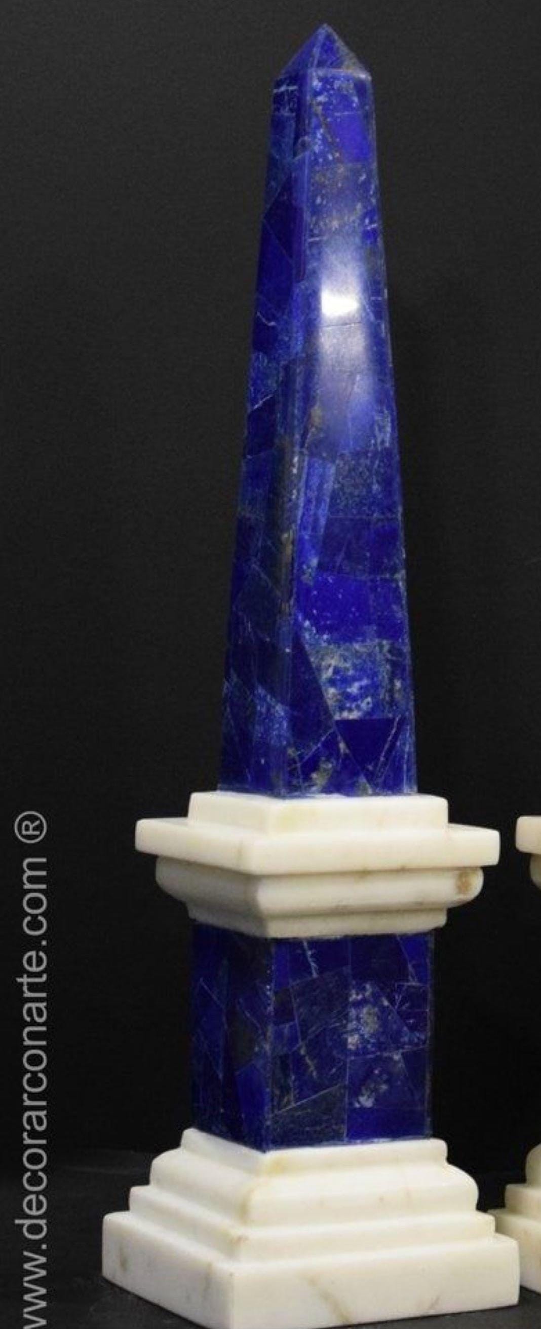 Exuding sophistication and artistry, this pair of Lapis Lazuli and Marble Obelisks brings timeless elegance to any setting. The rich royal blue of natural Lapis Lazuli is beautifully complemented by the crisp white marble base, creating a striking color contrast.