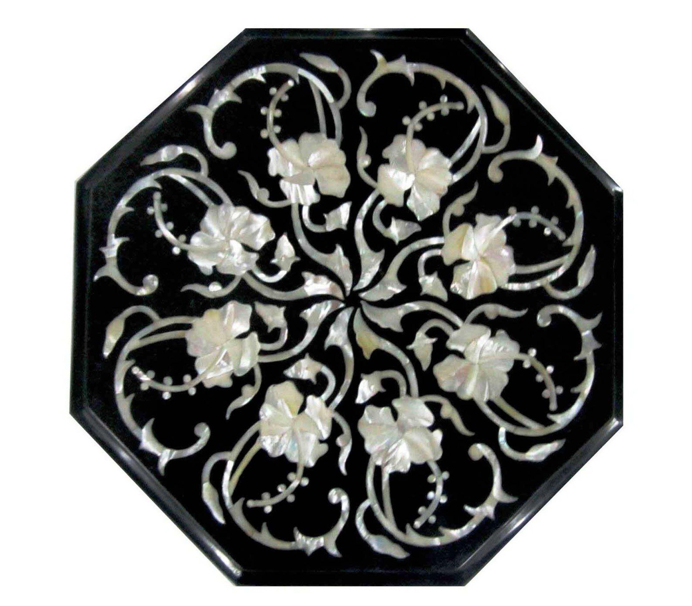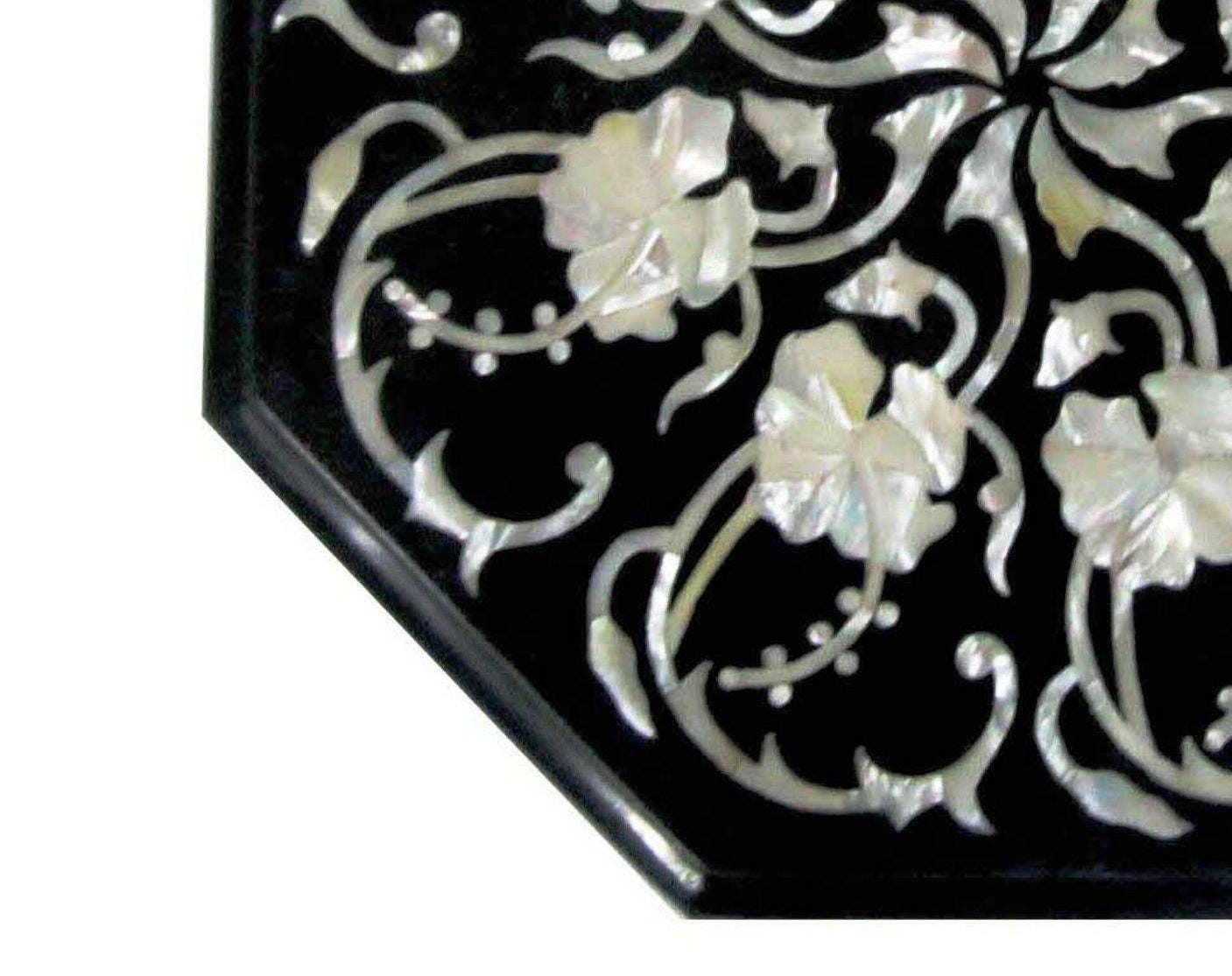 Bring timeless elegance into your home with this exquisite Mother of Pearl Inlay Octagon Table Top, handcrafted using the traditional Pietra Dura technique. This stunning piece features iridescent mother-of-pearl floral inlay set against a deep black marble background, creating a captivating contrast that instantly elevates any interior.