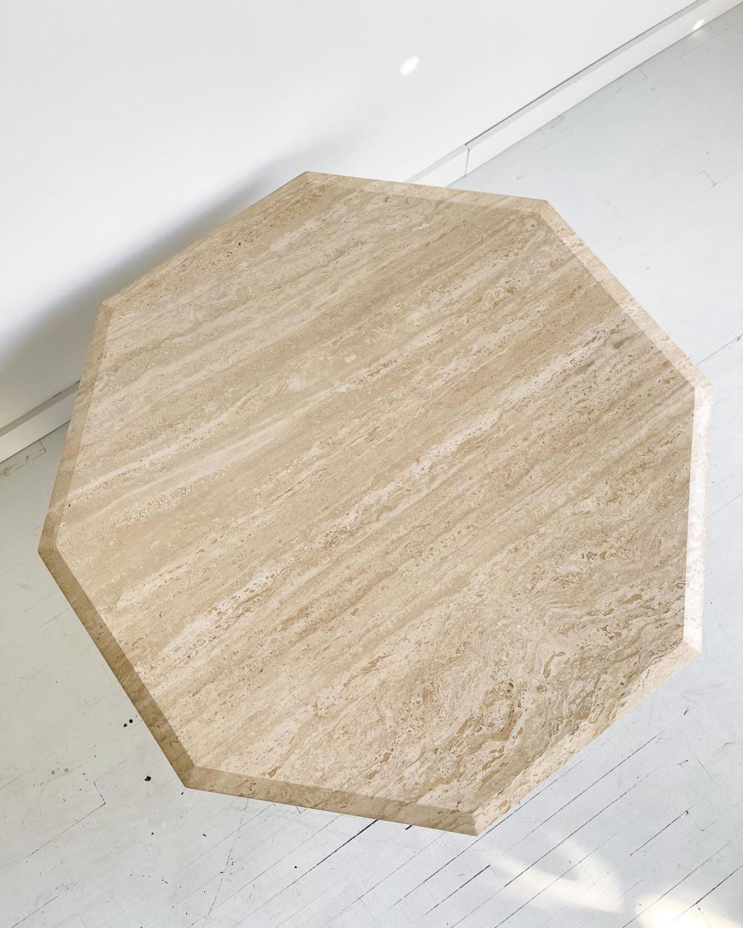 The bold octagonal tabletop rests on a solid travertine pedestal base, offering both strength and sophistication. Its geometric silhouette embodies minimalist luxury, seamlessly complementing modern, Mid-Century, and contemporary interiors.
