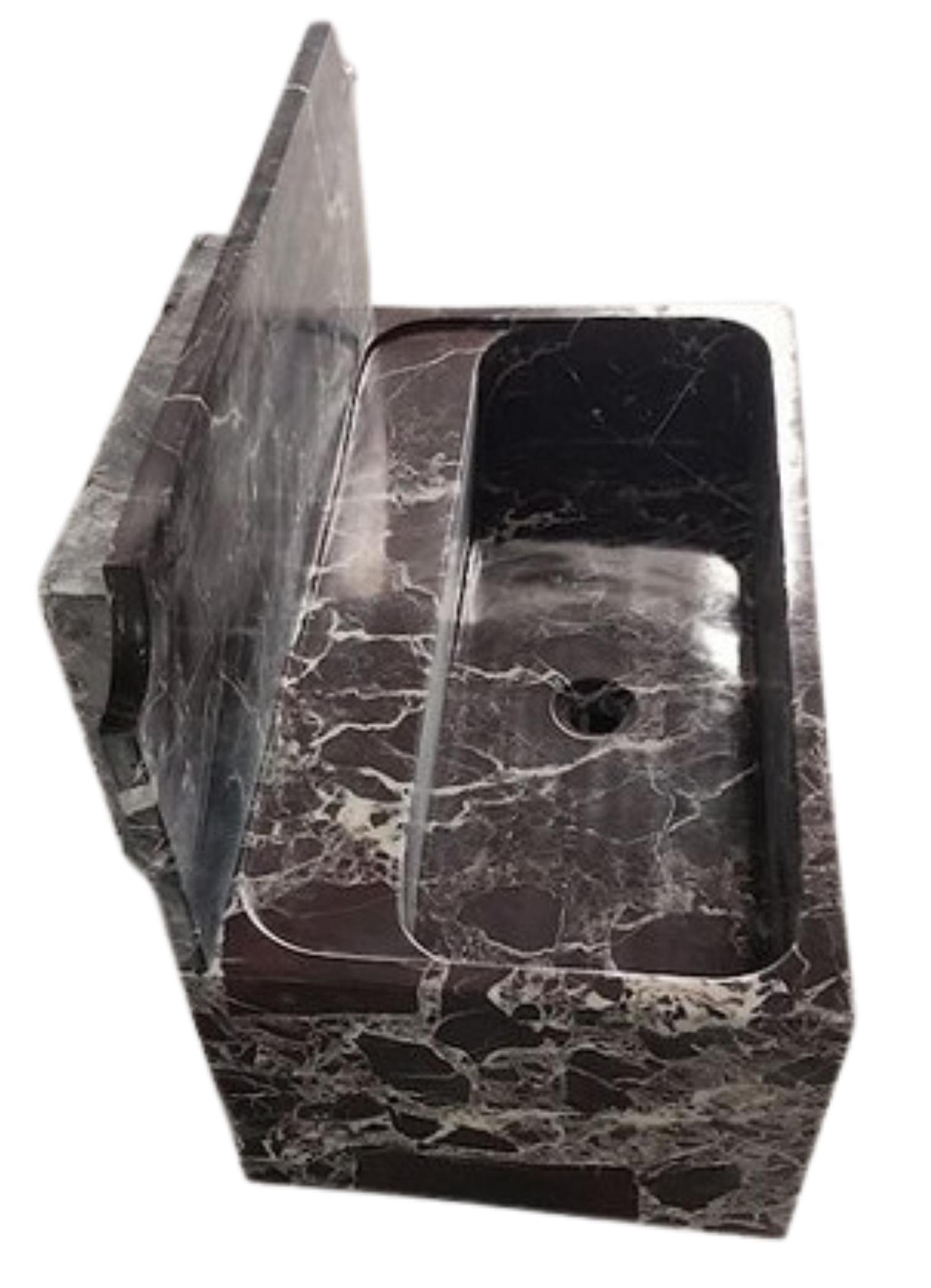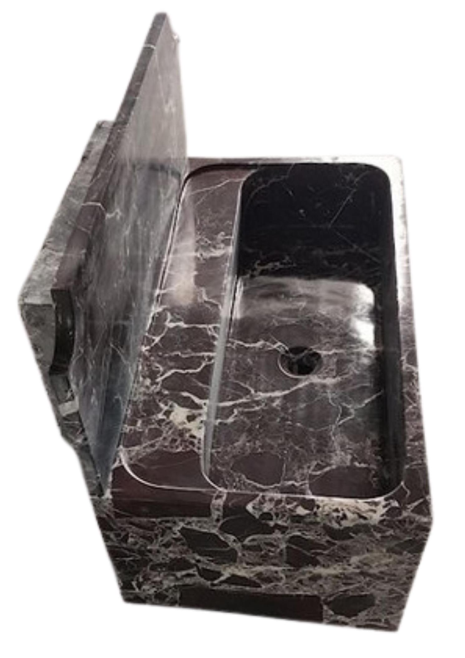 This wall-mounted sink features a sculptural rectangular form with a refined integrated backsplash and a beautifully carved basin. The solid stone construction highlights the natural veining throughout, making each piece unique. Designed to function as both a practical fixture and an architectural statement, it pairs perfectly with contemporary, minimalist, or high-end interiors.