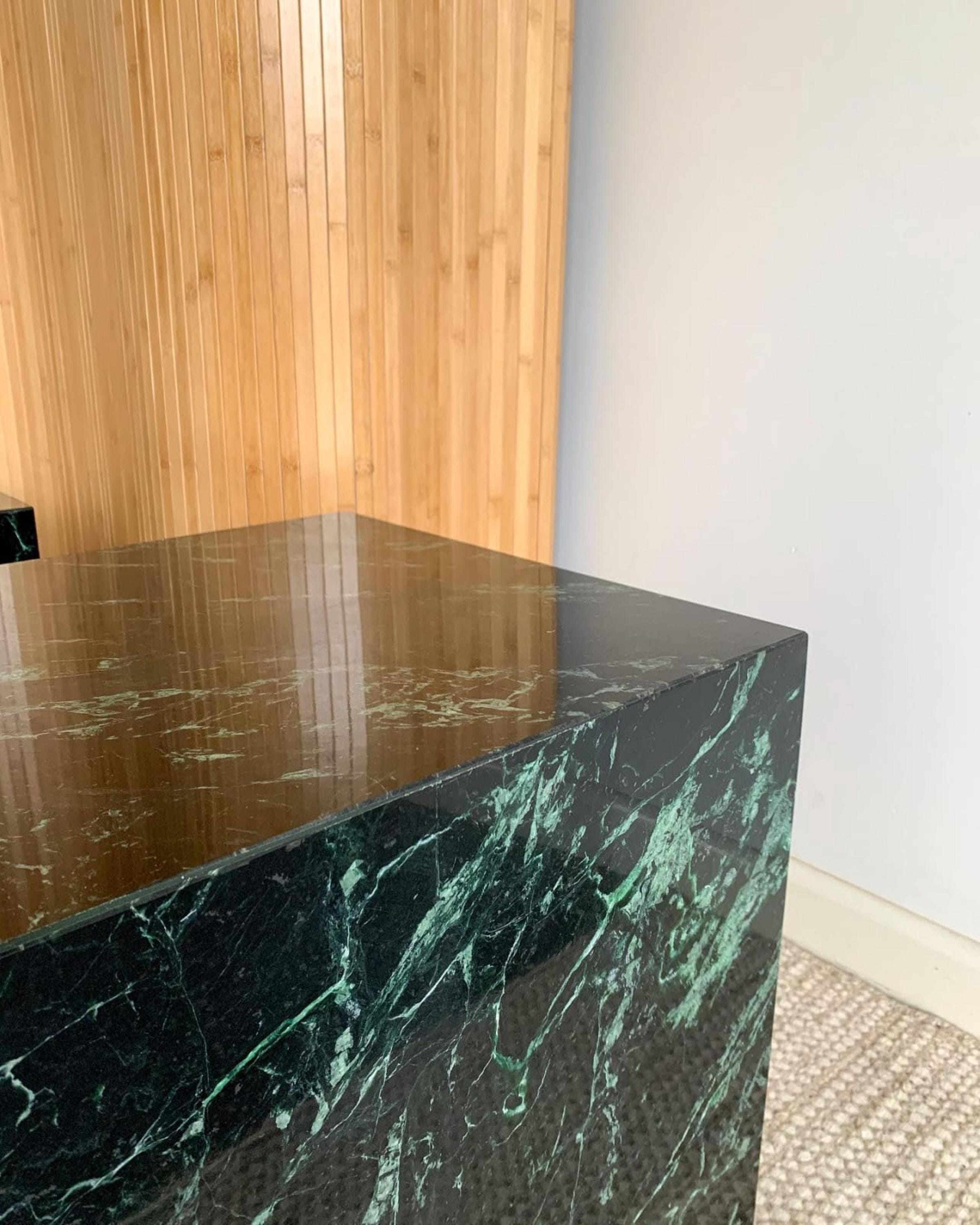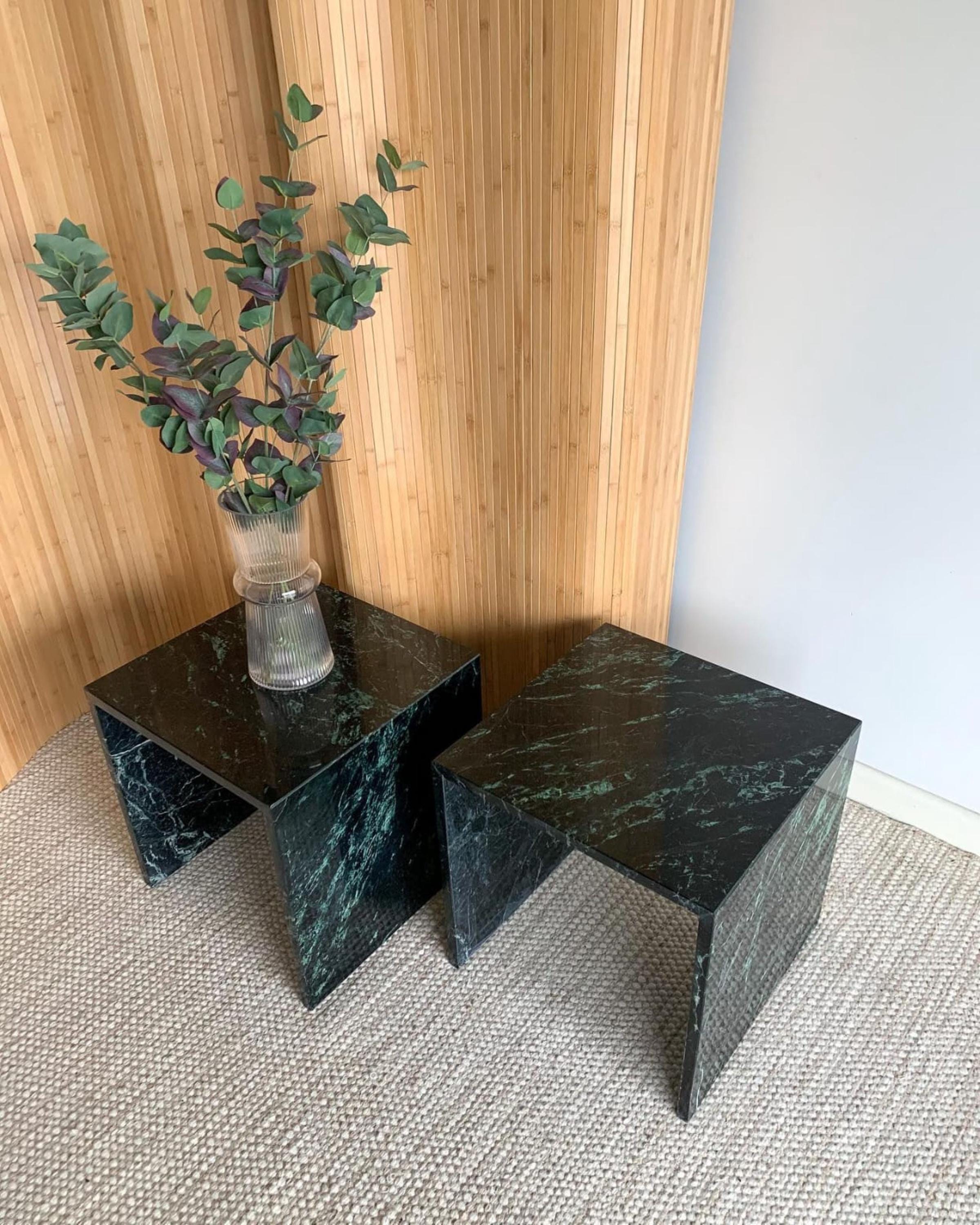 Indulge in the understated elegance of this handmade green marble side table, a vintage-inspired piece reminiscent of Carlo Scarpa’s sculptural design language. Crafted from 100% natural stone, this table serves as both a functional furniture piece and an artistic statement, elevating modern interiors with its refined presence.