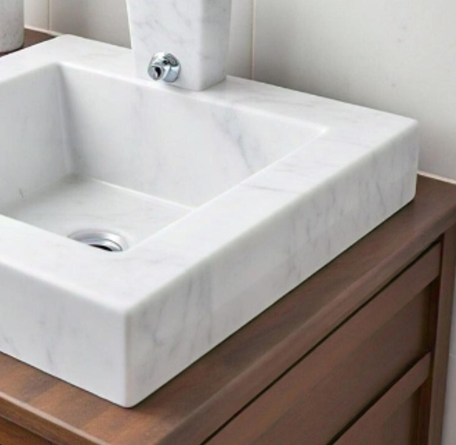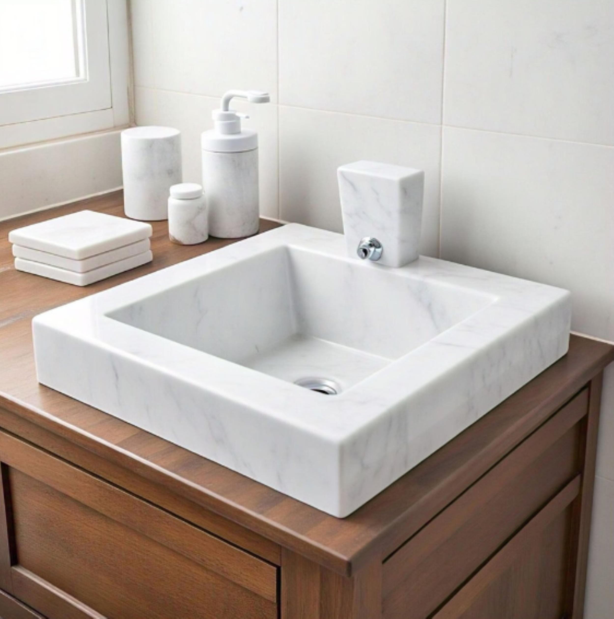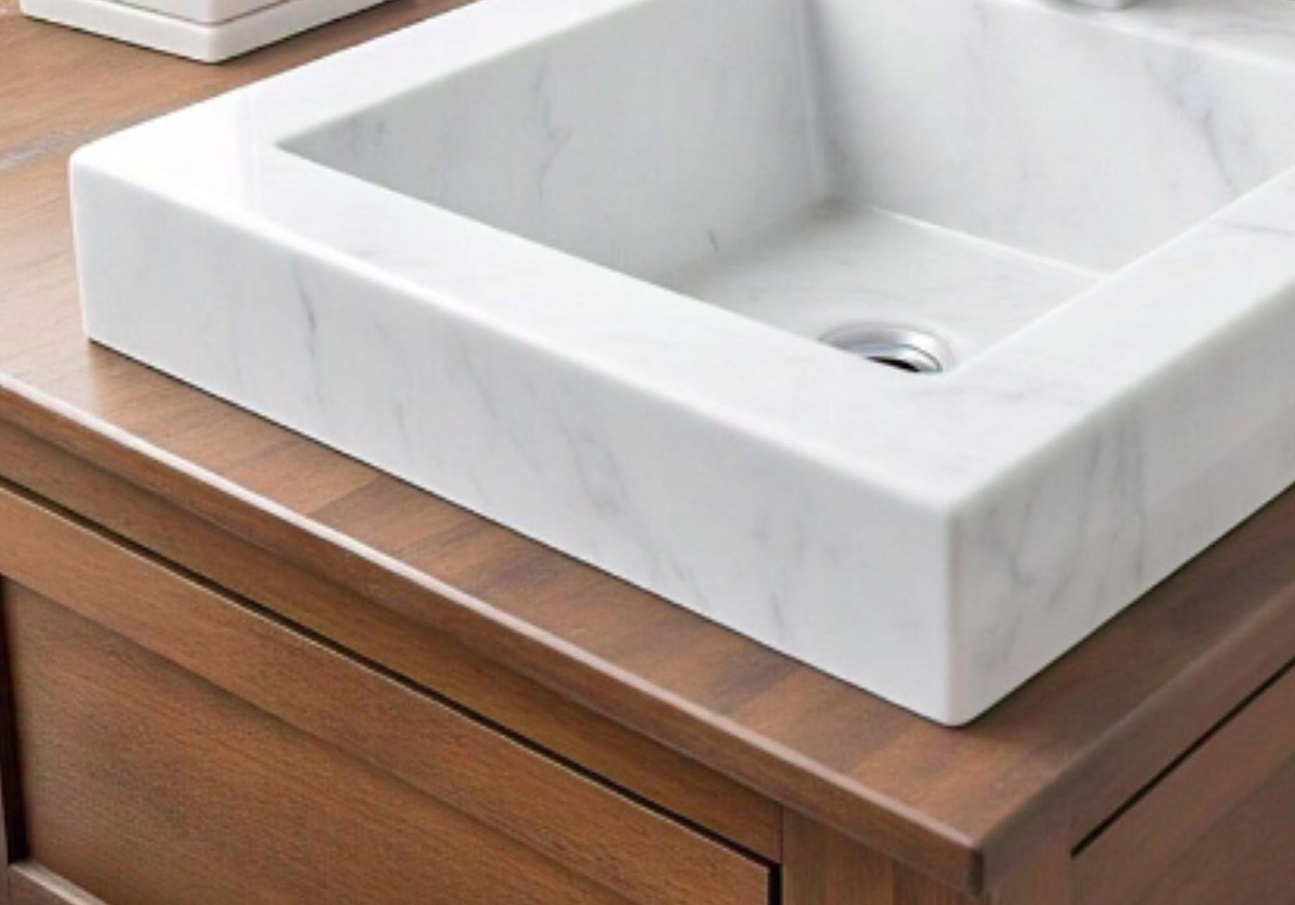 MarblingOver – Handcrafted from premium Carrara marble, this elegant square sink basin showcases subtle grey veining and timeless Italian style. Perfect for modern and classic bathroom vanities, it blends luxury, durability, and natural beauty.