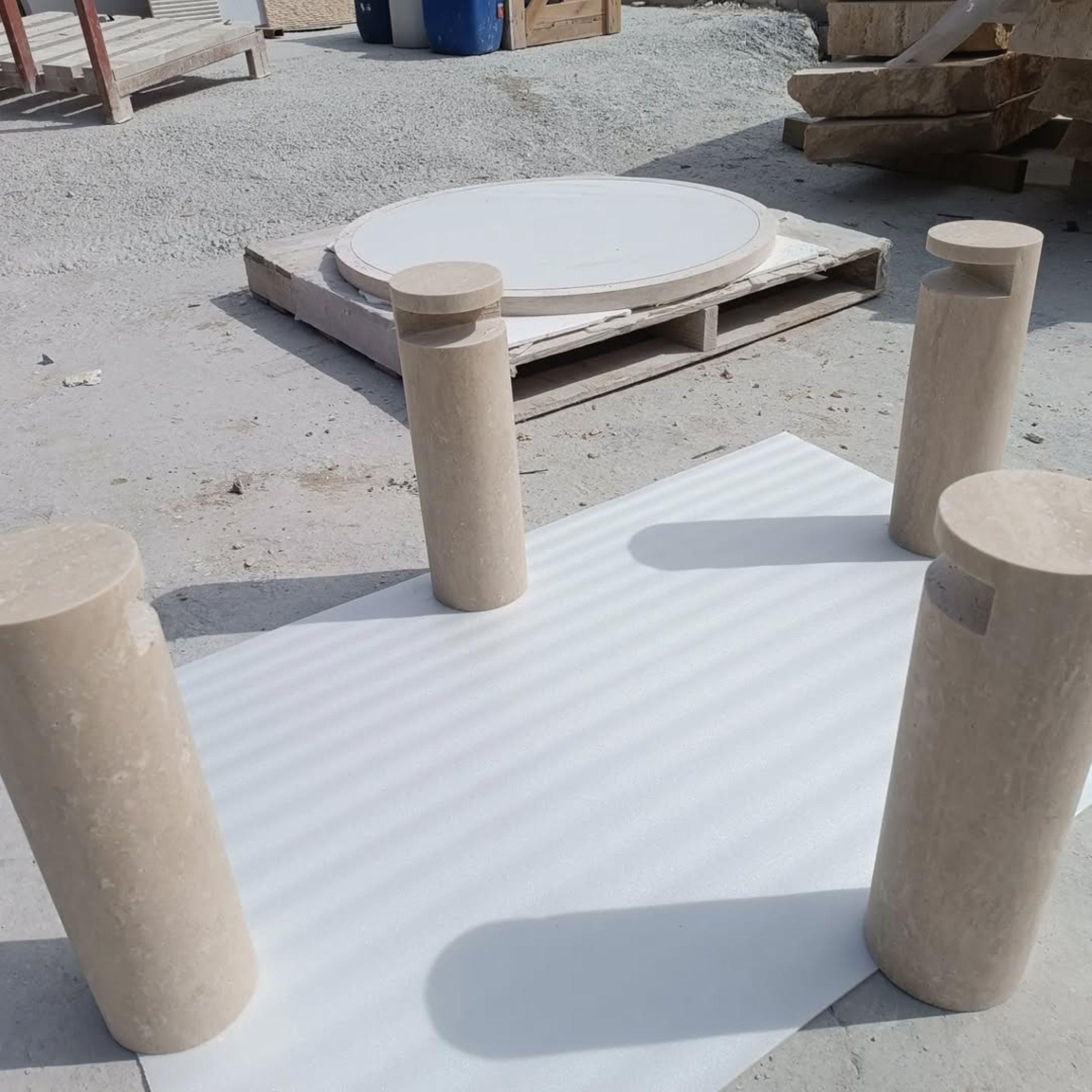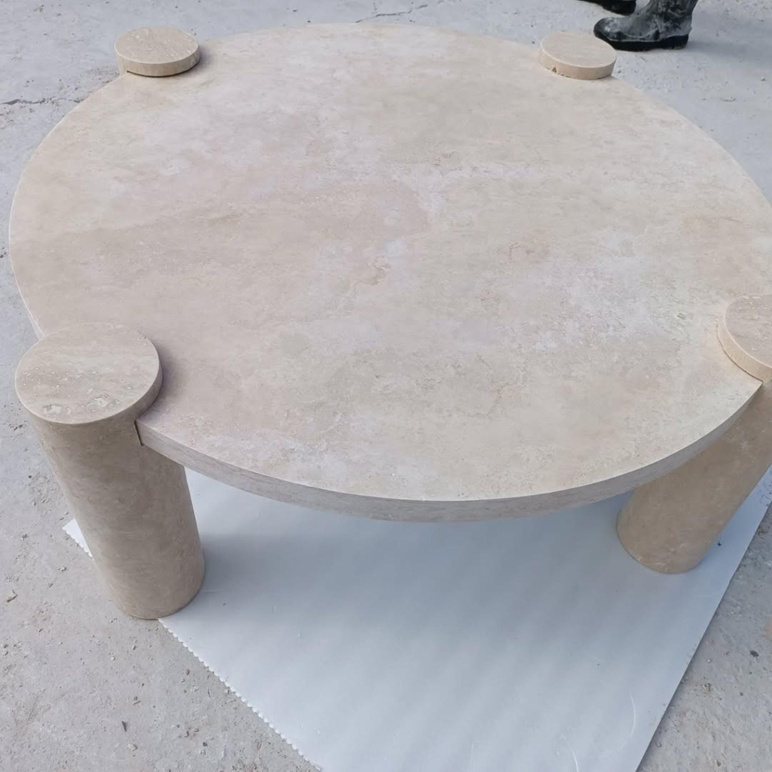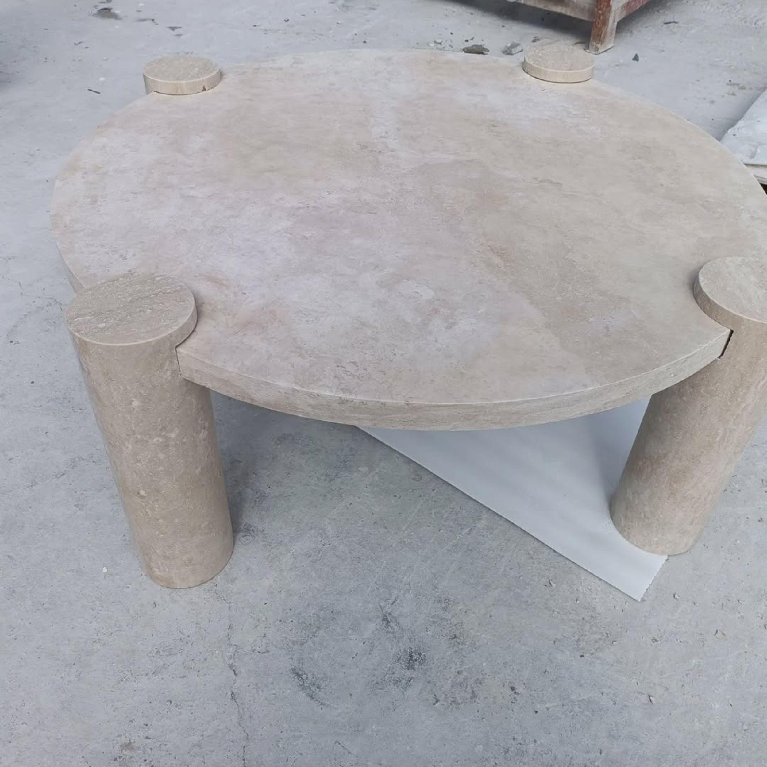 The round tabletop is carved from 100% authentic beige travertine, showcasing delicate tonal variations, subtle textures, and natural fossil markings that make every piece truly unique. Supported by three solid cylindrical stone legs, this table embodies strength, balance, and sculptural beauty.