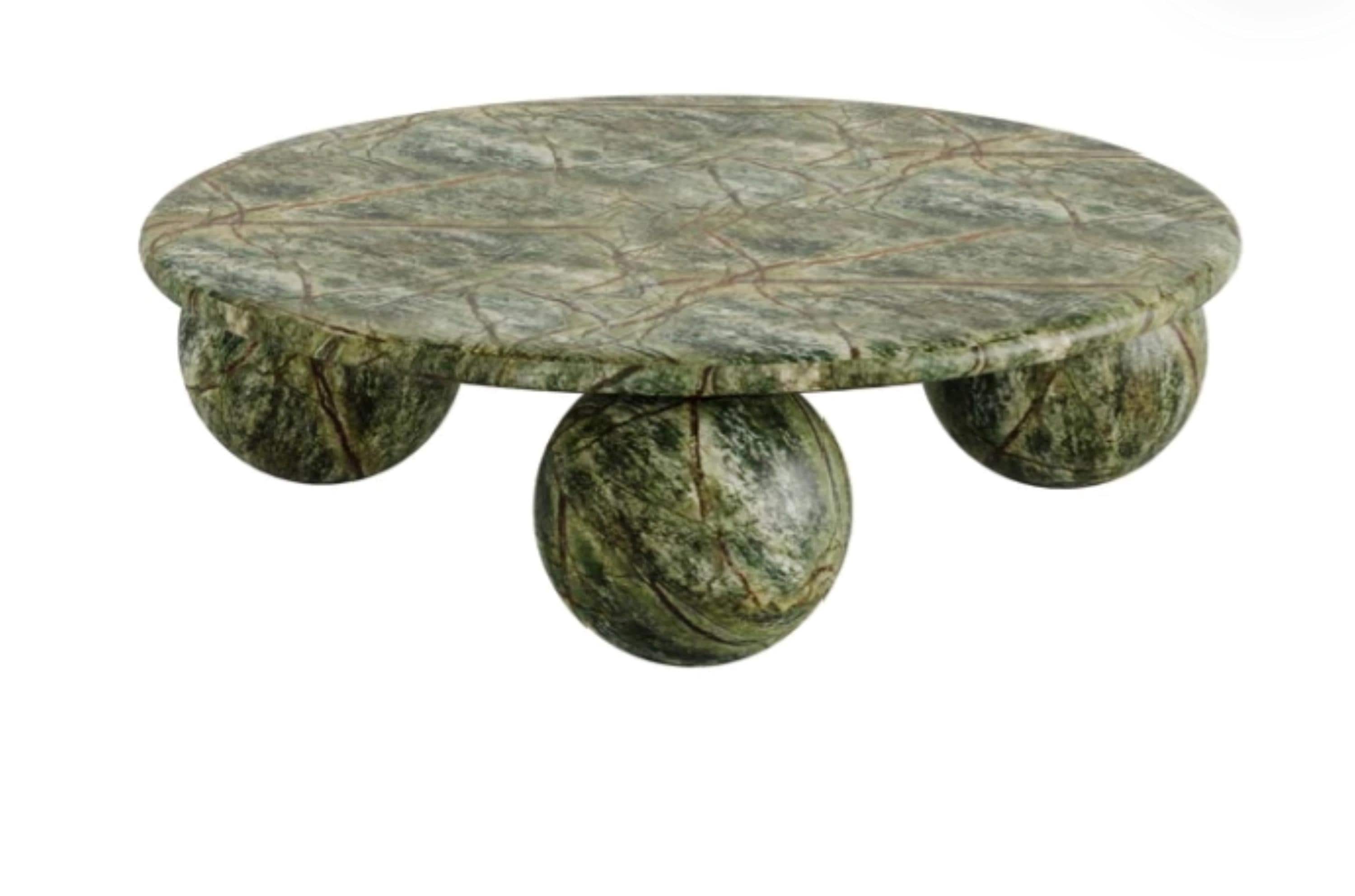 This elegant round green marble coffee table brings a bold and luxurious aesthetic to any living space. Featuring a smooth green marble tabletop and a unique spherical base design, this piece combines modern style with timeless material. Perfect for both contemporary and classic interiors, this coffee table is a statement of luxury and sophistication, enhancing the ambiance of any home decor. Crafted with high-quality marble, it ensures durability and long-lasting beauty.