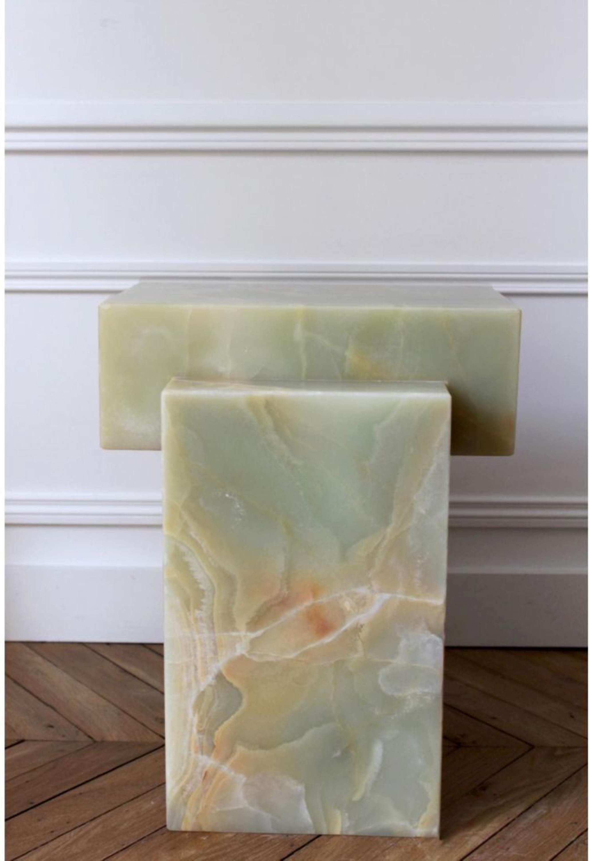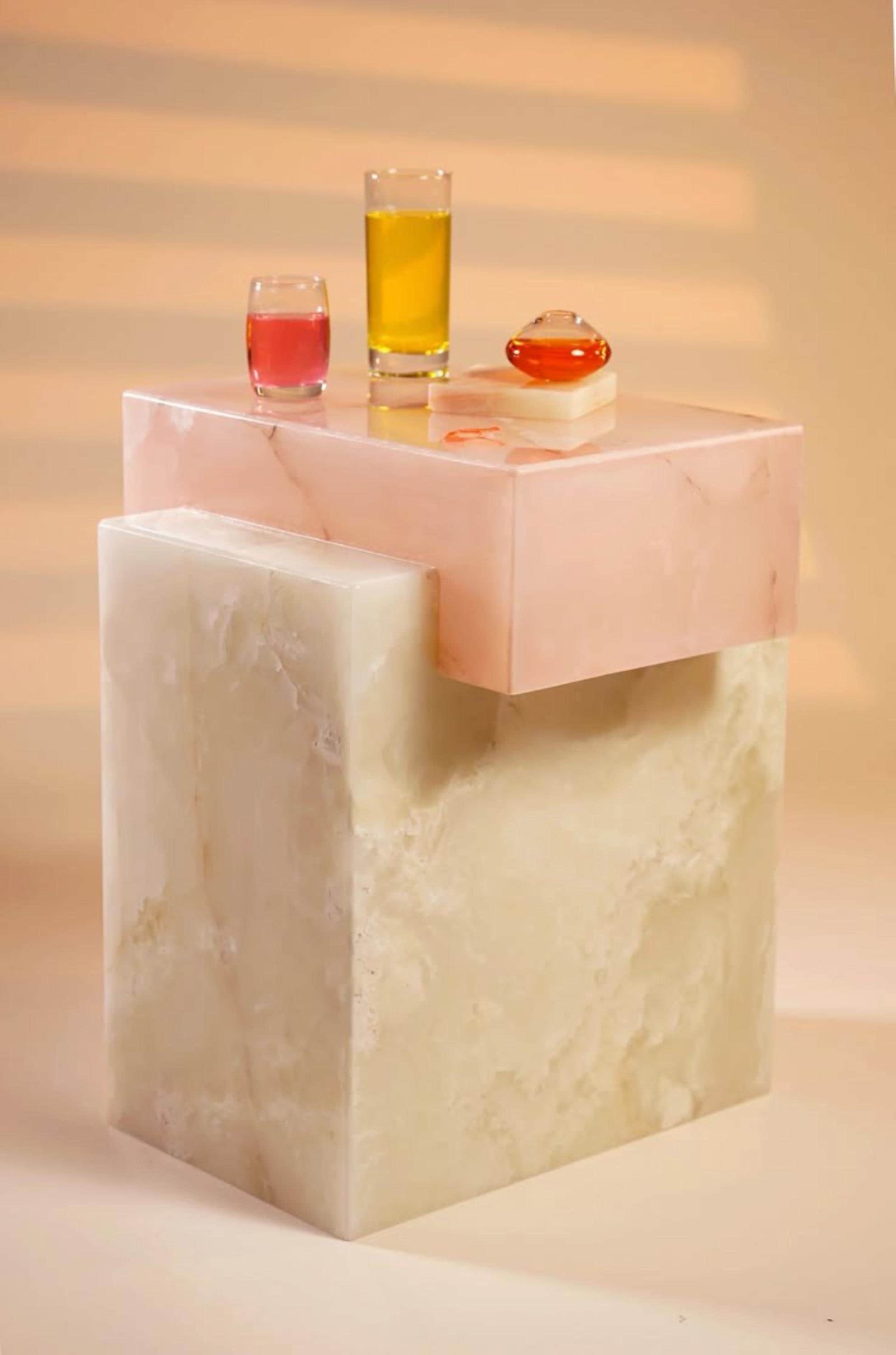 Featuring a natural pink onyx top over a richly veined white onyx base, each cube is a one-of-a-kind design that merges functionality with art. Meticulously made by Indian artisans, this table is a celebration of natural stone and traditional craftsmanship.