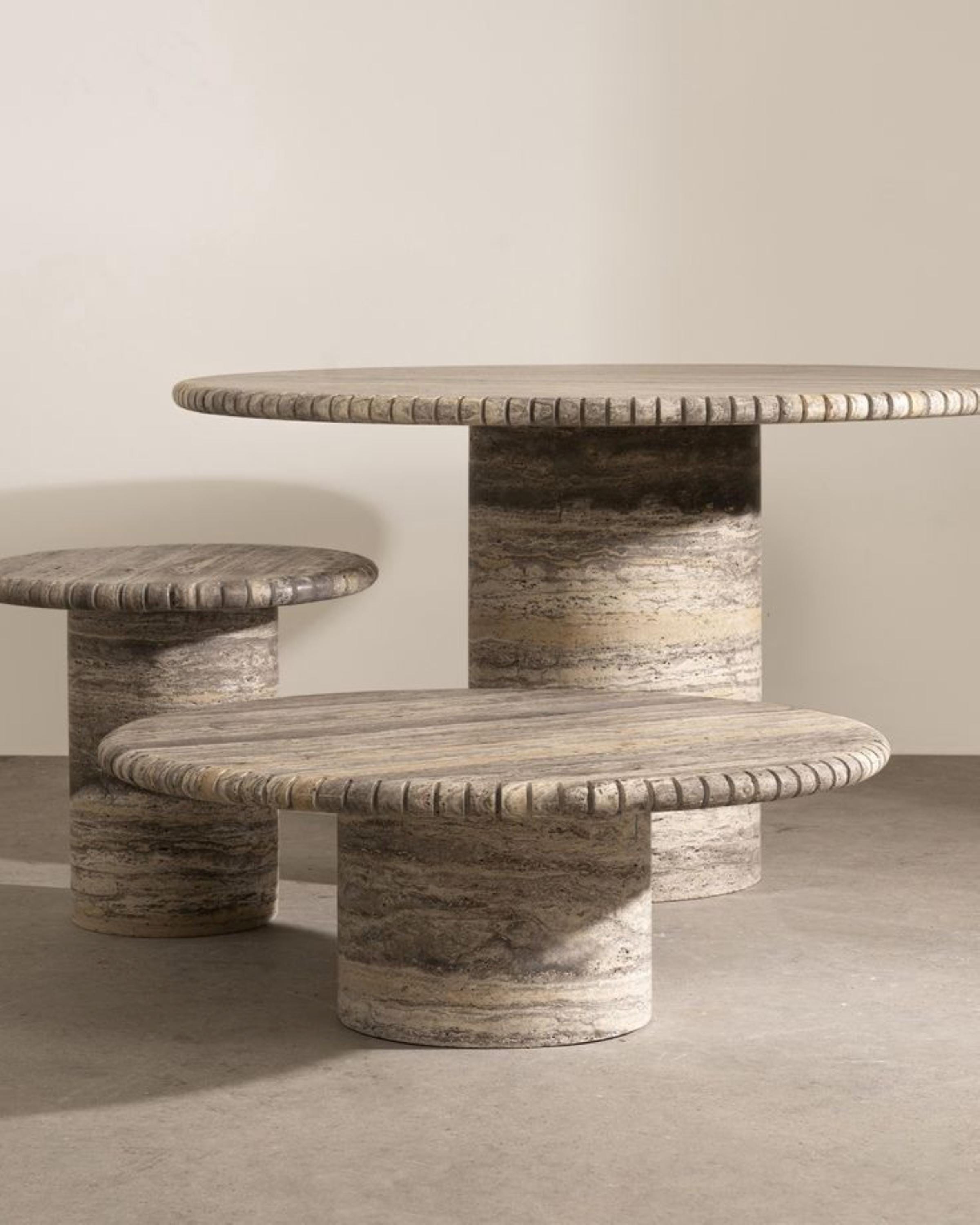 This elegant Silver Travertine Marble Coffee Table Set brings a refined and sophisticated touch to any interior. Featuring a distinctive natural texture with subtle silver-gray veining, each tabletop showcases the raw beauty of travertine stone. The rounded edges and tiered height design create a sculptural statement piece perfect for modern, minimalist, and luxurious living spaces.
