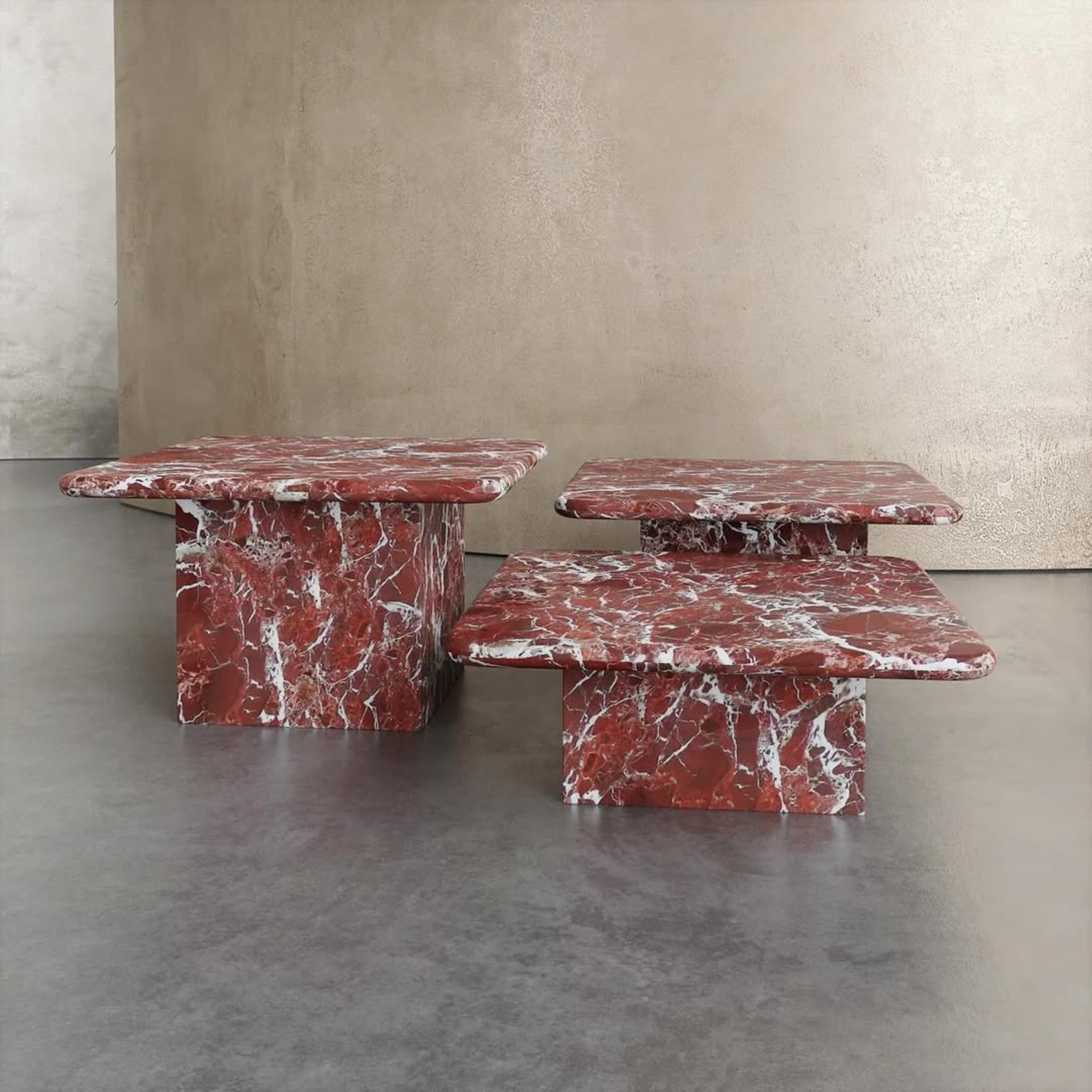 This exquisite Rosso Levanto marble coffee table is a true showpiece, crafted to elevate the aesthetics of any sophisticated interior. Made from rich burgundy red marble with striking natural white veining, its bold color and dynamic layered design add a sculptural, modern flair to your living space. The tiered tabletops at three distinct heights provide both visual interest and practical functionality.