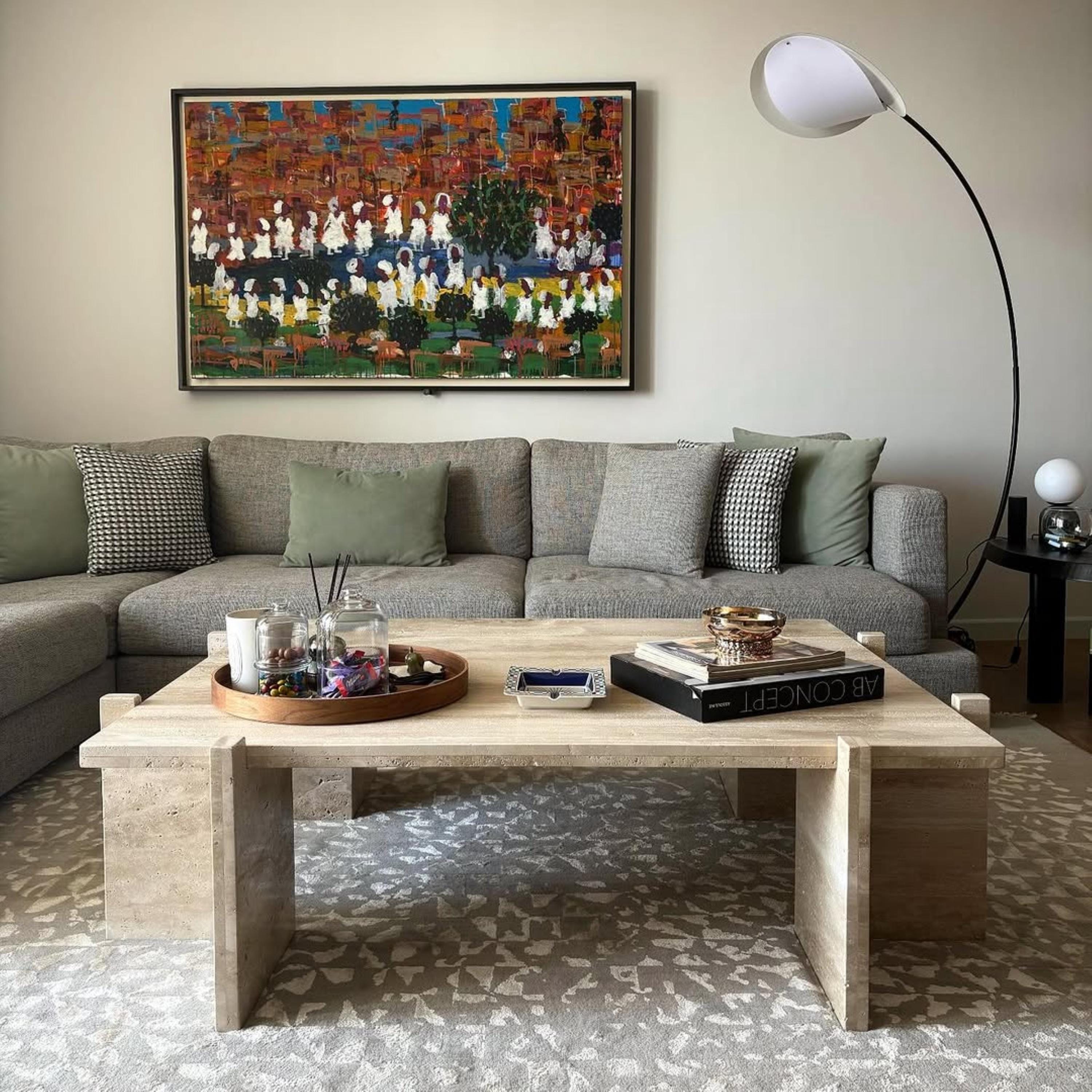 Elevate your living room with the timeless sophistication of this handmade travertine coffee table, crafted from 100% authentic Italian natural stone. Designed with a rectangular top and four solid block-style legs, this table showcases minimalist architecture, strength, and natural beauty.
