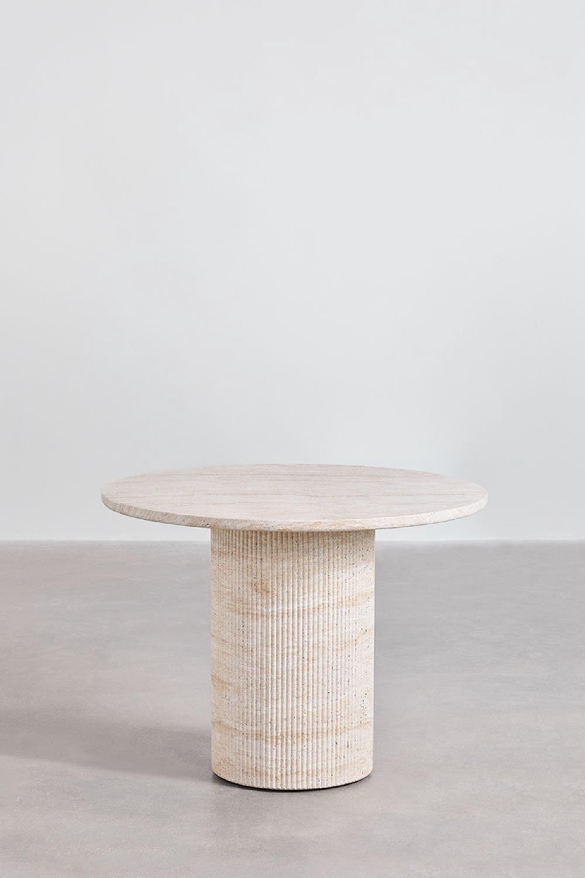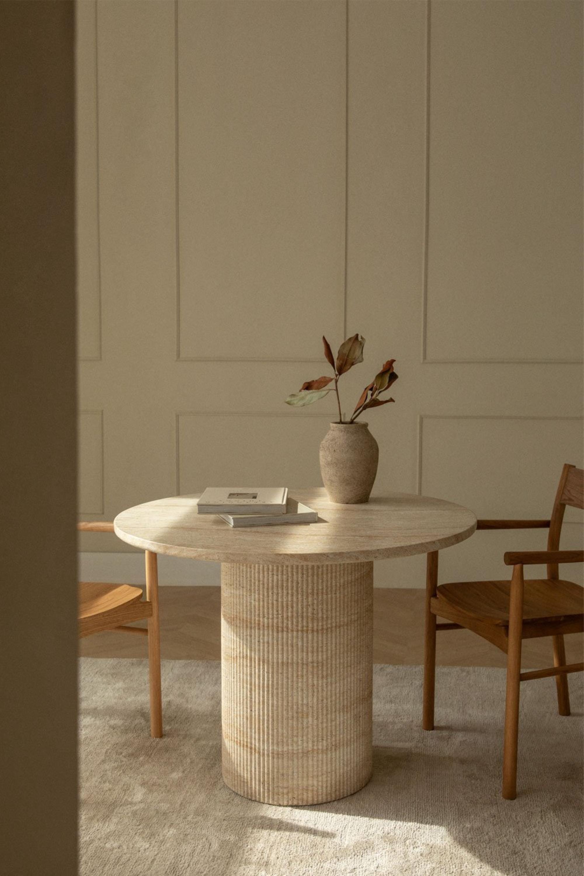 Introduce timeless elegance into your home with this handmade travertine pedestal table, crafted from authentic natural stone. With its perfectly round tabletop and a sculptural cylindrical pedestal base, this piece unites functionality, stability, and modern artistry.